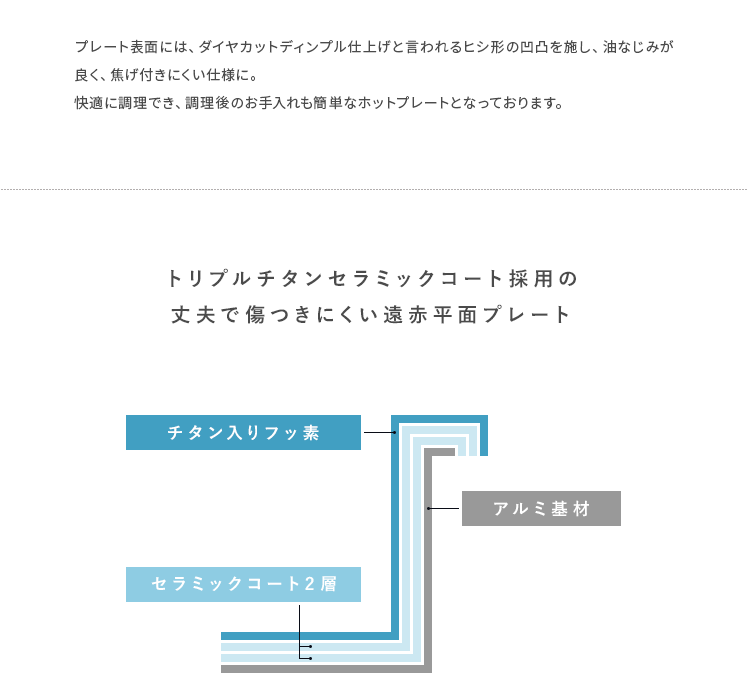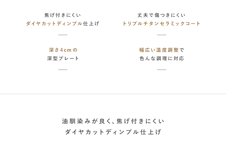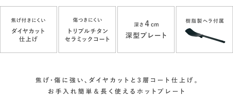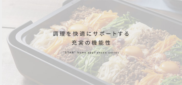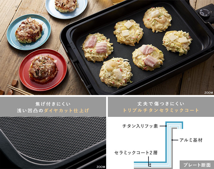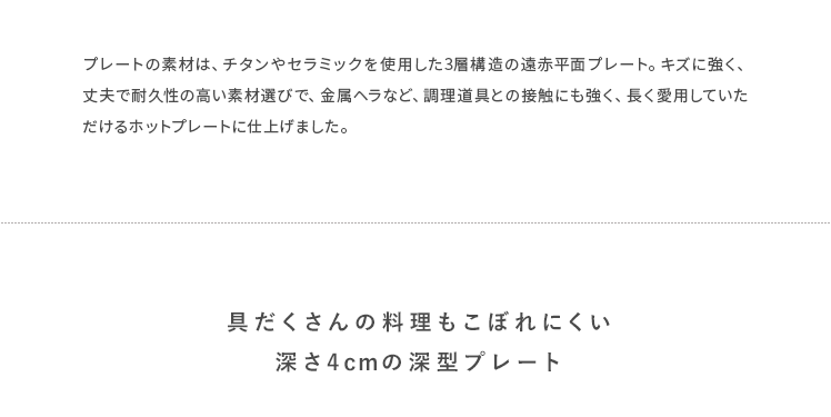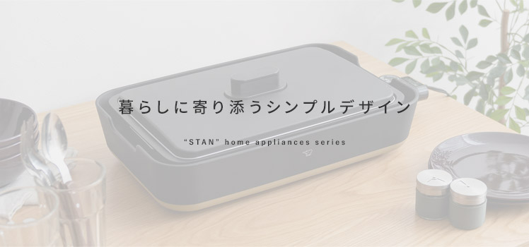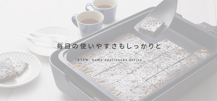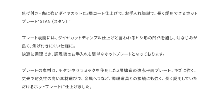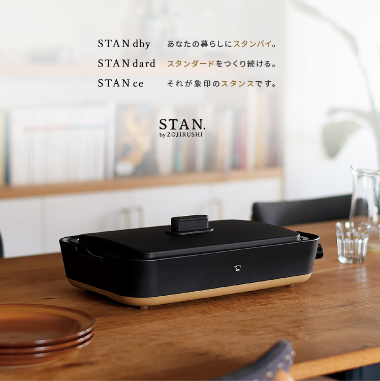 象印 シンプルデザインホットプレート STAN〔スタン〕/焦げ付き・傷に強いダイヤカットと3層コート仕上げで、お手入れ簡単で、長く愛用できるホットプレート”STAN(スタン)”プレート表面には、ダイヤカットディンプル仕上げと言われるヒシ形の凹凸を施し、油なじみが良く、焦げ付きにくい仕様に。快適に調理でき、調理後のお手入れも簡単なホットプレートとなっております。プレートの素材は、チタンやセラミックを使用した3層構造の遠赤平面プレート。キズに強く、丈夫で耐久性の高い素材選びで、金属ヘラなど、調理道具との接触にも強く、長く愛用していただけるホットプレートに仕上げました。