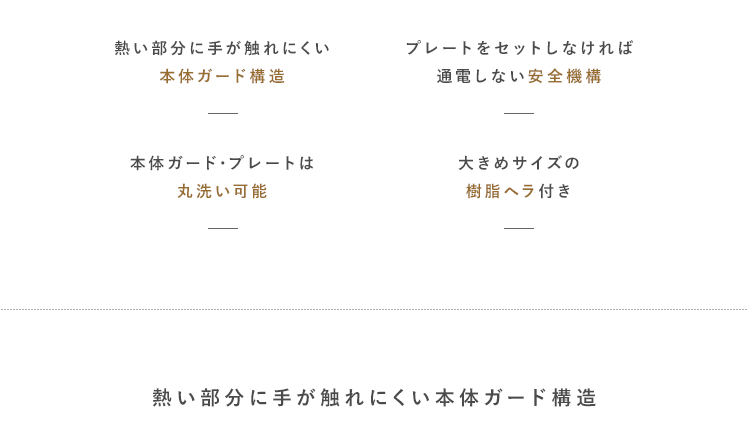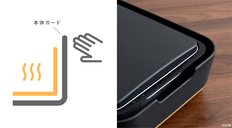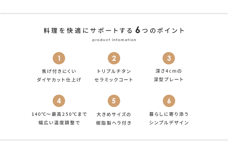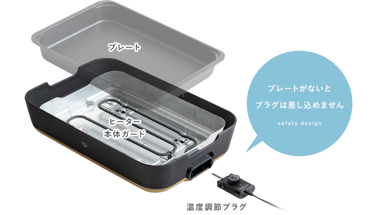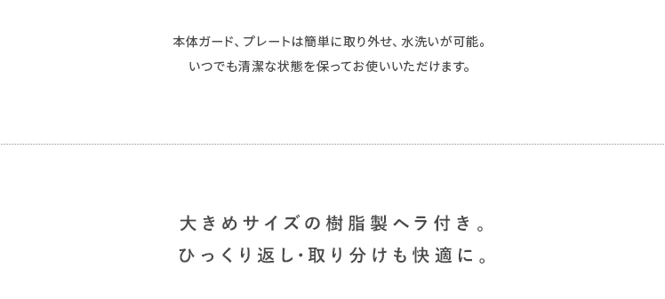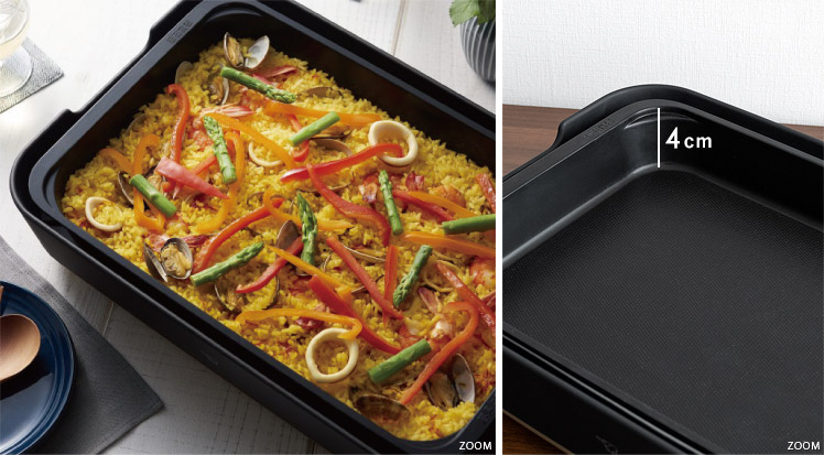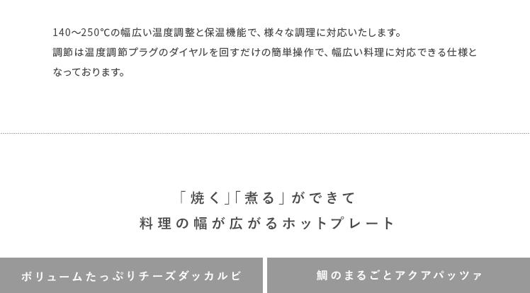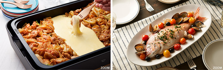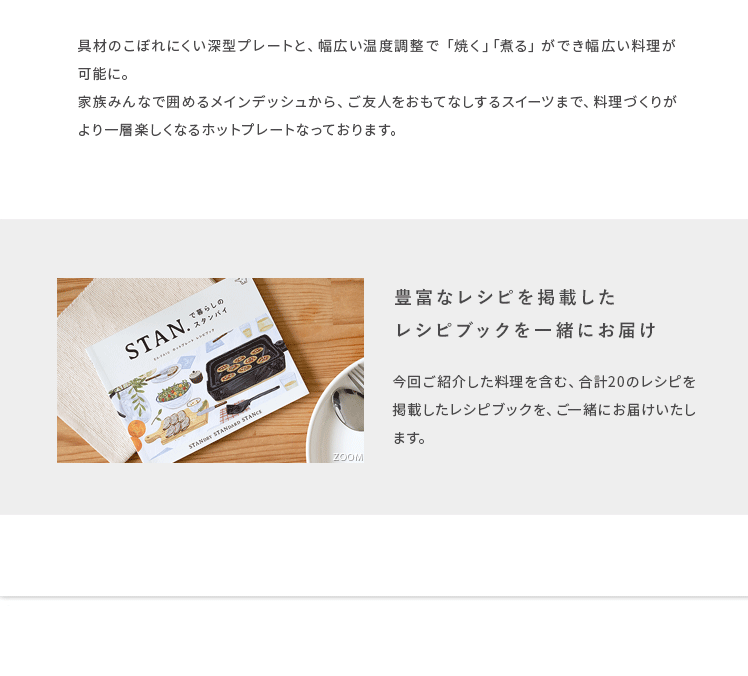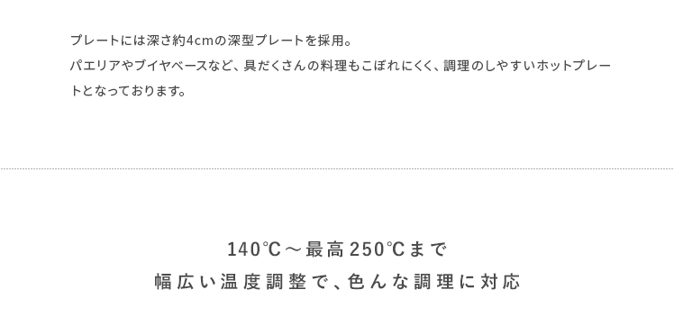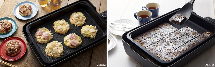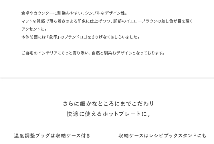 象印 シンプルデザインホットプレート STAN〔スタン〕/焦げ付き・傷に強いダイヤカットと3層コート仕上げで、お手入れ簡単で、長く愛用できるホットプレート”STAN(スタン)”プレート表面には、ダイヤカットディンプル仕上げと言われるヒシ形の凹凸を施し、油なじみが良く、焦げ付きにくい仕様に。快適に調理でき、調理後のお手入れも簡単なホットプレートとなっております。プレートの素材は、チタンやセラミックを使用した3層構造の遠赤平面プレート。キズに強く、丈夫で耐久性の高い素材選びで、金属ヘラなど、調理道具との接触にも強く、長く愛用していただけるホットプレートに仕上げました。