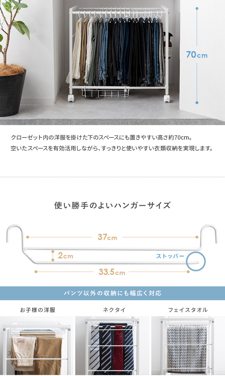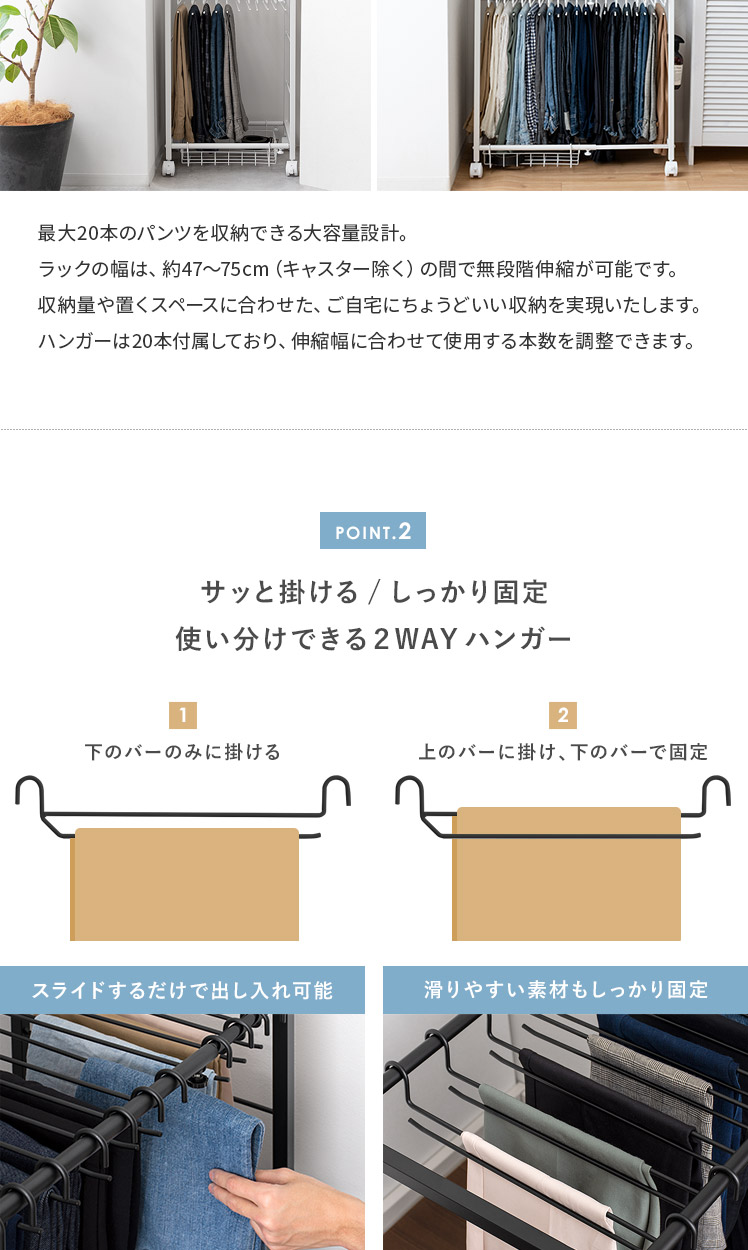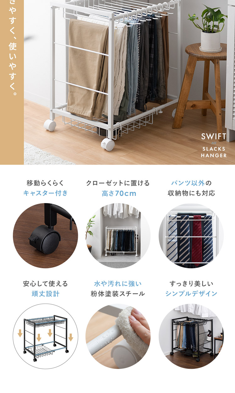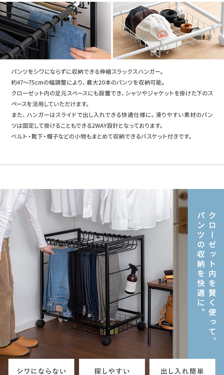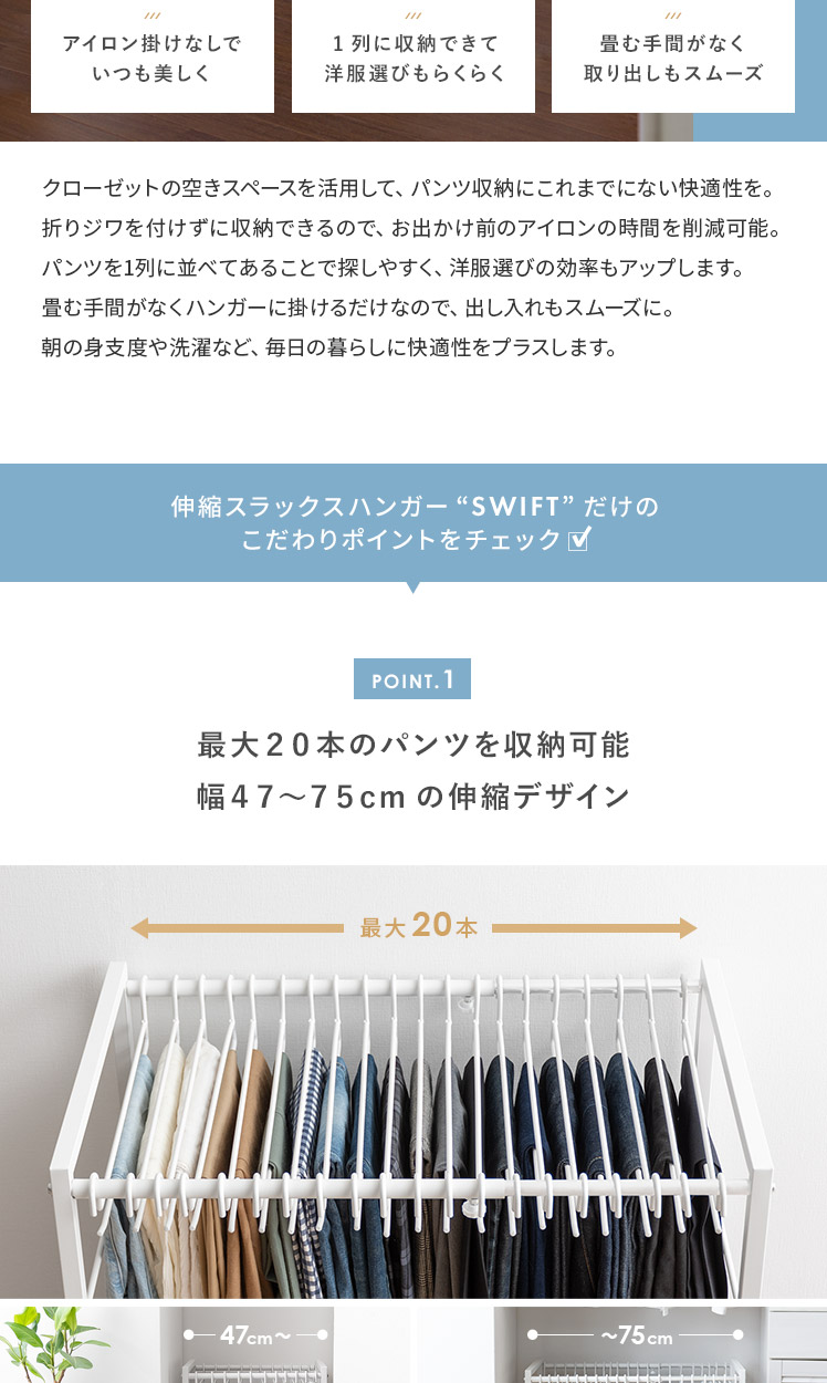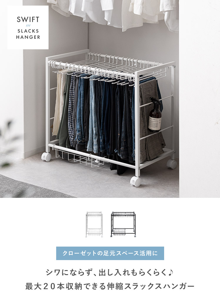 伸縮スラックスハンガー SWIFT〔スウィフト〕/パンツをシワにならずに収納できる伸縮スラックスハンガー“SWIFT(スウィフト)”約47〜75cmの幅調整により、最大20本のパンツを収納可能。クローゼット内の足元スペースにも設置でき、シャツやジャケットを掛けた下のスペースを活用していただけます。また、ハンガーはスライドで出し入れできる快適仕様に。滑りやすい素材のパンツは固定して掛けることもできる2WAY設計となっております。下方のバスケットには、ベルト・靴下・帽子などの小物もまとめて収納していただけます。