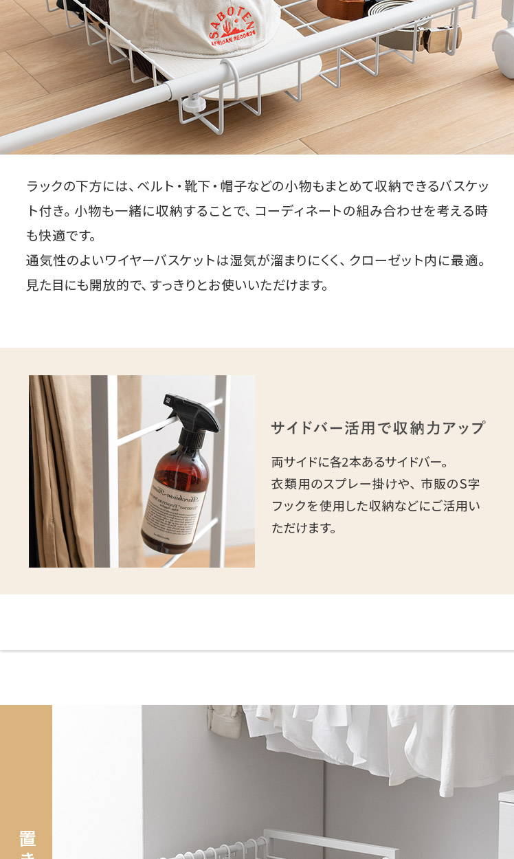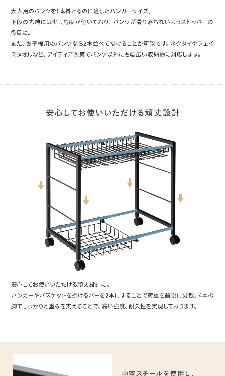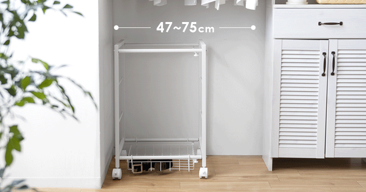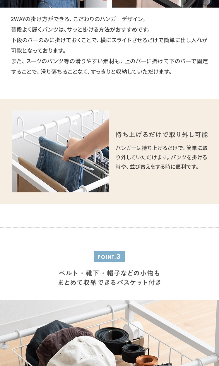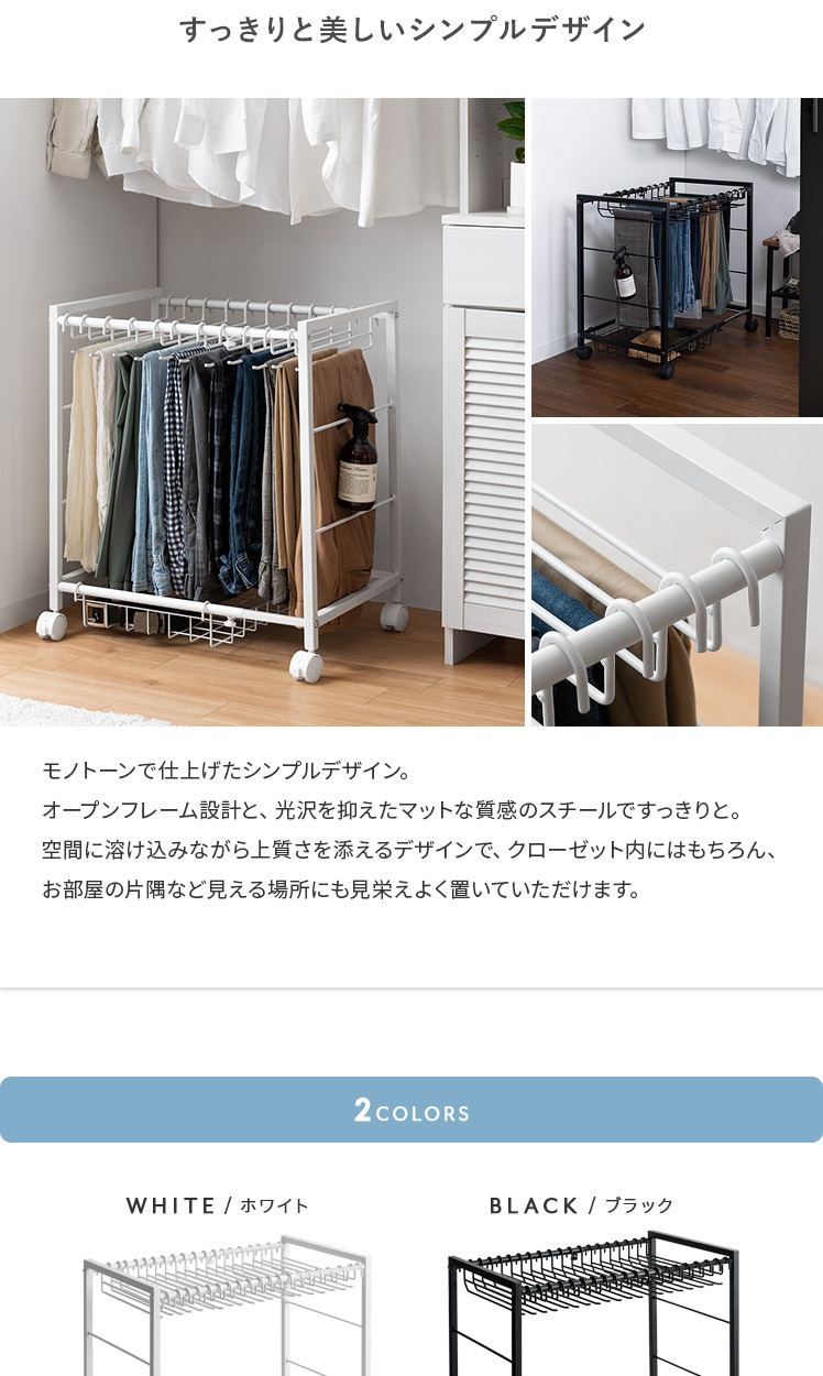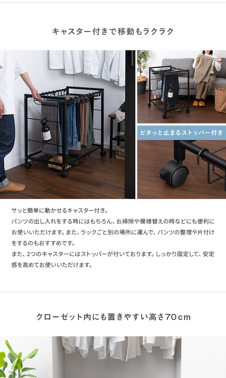 伸縮スラックスハンガー SWIFT〔スウィフト〕/パンツをシワにならずに収納できる伸縮スラックスハンガー“SWIFT(スウィフト)”約47〜75cmの幅調整により、最大20本のパンツを収納可能。クローゼット内の足元スペースにも設置でき、シャツやジャケットを掛けた下のスペースを活用していただけます。また、ハンガーはスライドで出し入れできる快適仕様に。滑りやすい素材のパンツは固定して掛けることもできる2WAY設計となっております。下方のバスケットには、ベルト・靴下・帽子などの小物もまとめて収納していただけます。