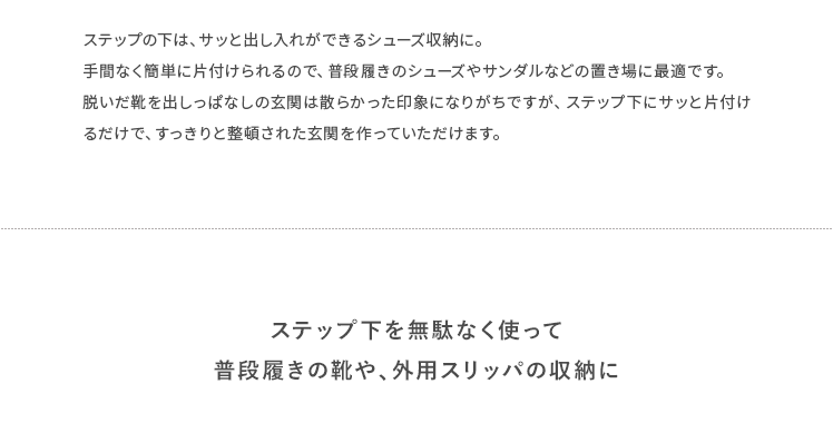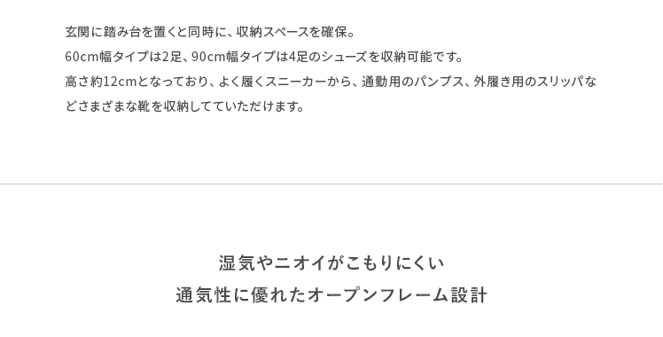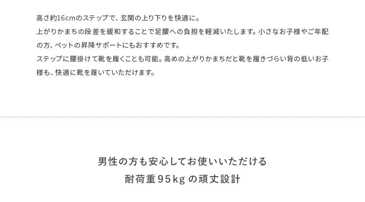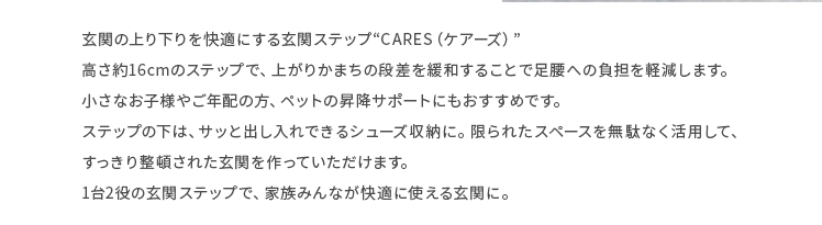 玄関ステップ CARES〔ケアーズ〕 90cm幅タイプ/玄関の上り下りを快適にする玄関ステップ“CARES(ケアーズ)”約高さ16cmのステップで、上がりかまちの段差を緩和することで足腰への負担を軽減します。小さなお子様やご年配の方、ペットの昇降サポートにもおすすめです。ステップの下は、サッと出し入れできるシューズ収納に。限られたスペースを無駄なく活用して、すっきり整頓された玄関を作っていただけます。1台2役の玄関ステップで、家族みんなが快適に使える玄関に。