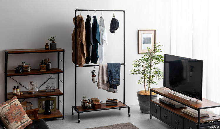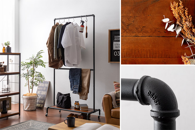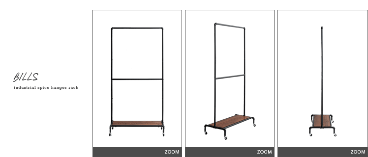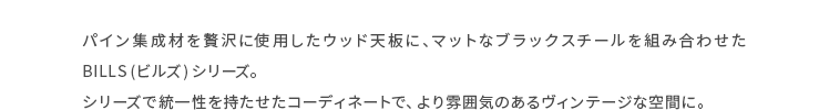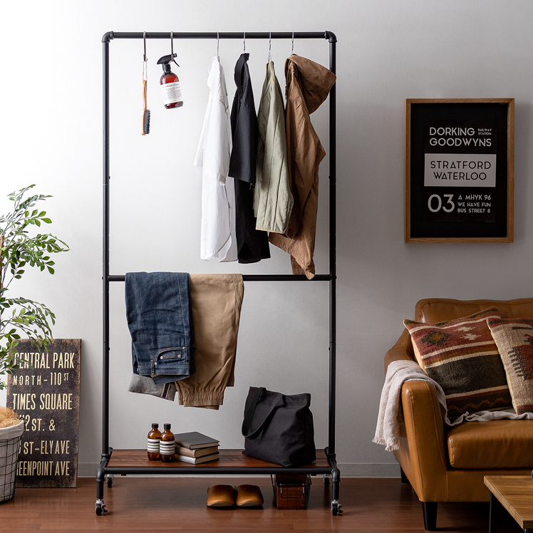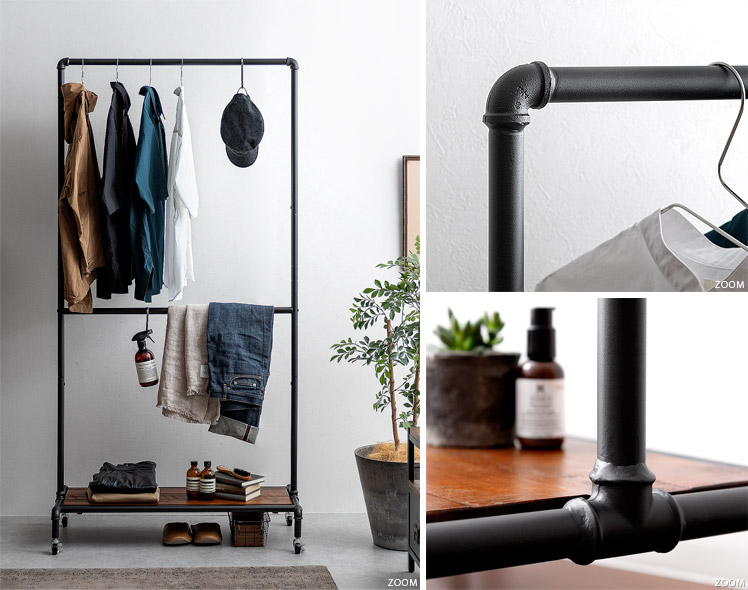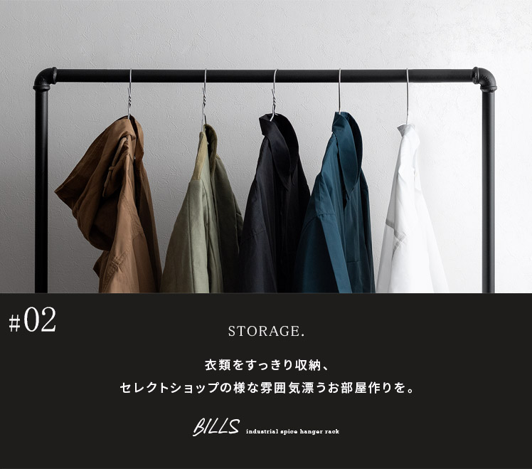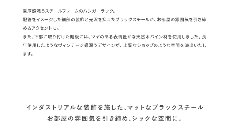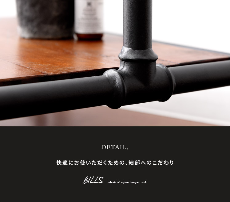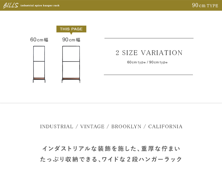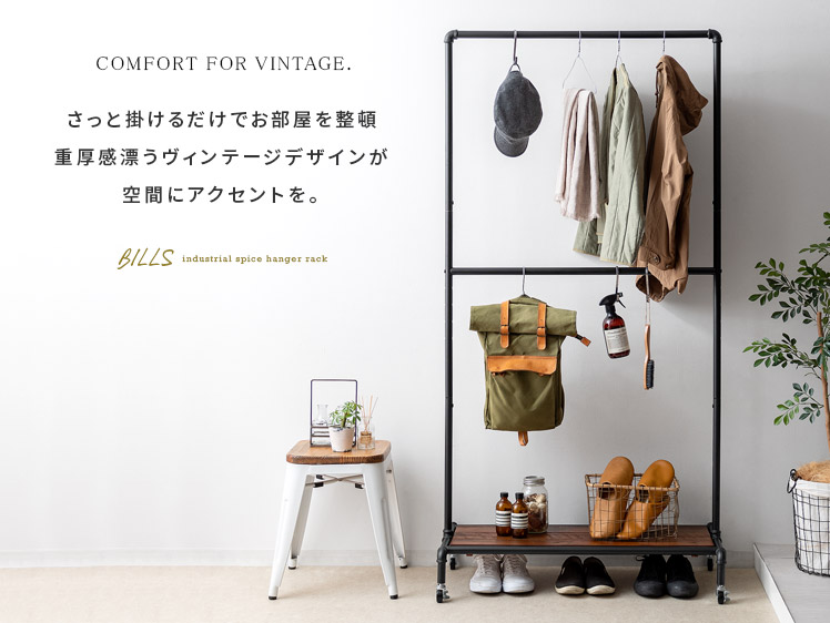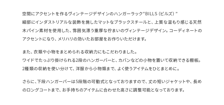 ハンガーラック BILLS(ビルズ) 90cm幅/空間にアクセントを作るヴィンテージデザインのハンガーラック“BILLS(ビルズ)”細部にインダストリアルな装飾を施したマットなブラックスチールと、上質な温もり感じる天然木パイン素材を使用した、雰囲気漂う重厚な佇まいのヴィンテージデザイン。コーディネートのアクセントになり、メリハリの効いたお部屋をお作りいただけます。また、衣類や小物をまとめられる収納力にもこだわりました。ワイドでたっぷり掛けられる2段のハンガーバーと、カバンなどの小物を置いて収納できる棚板。2種類の収納を使い分けて、洋服から小物類まで、よく使うアイテムをひとまとめに。さらに、下段ハンガーバーは5段階の可動式となっておりますので、丈の短いジャケットや、長めのロングコートまで、お手持ちのアイテムに合わせた高さに調整可能となっております。