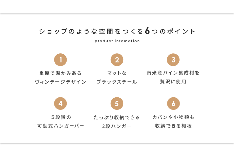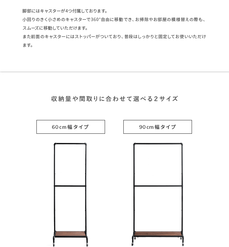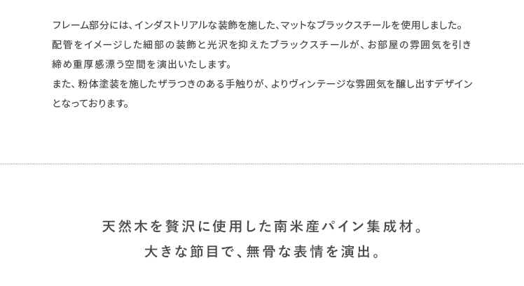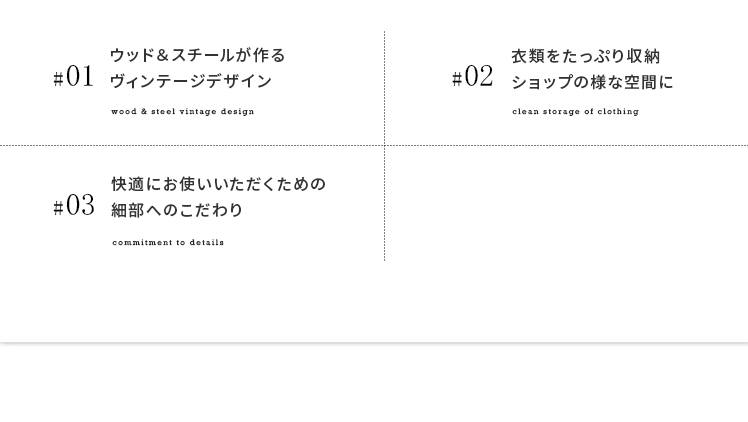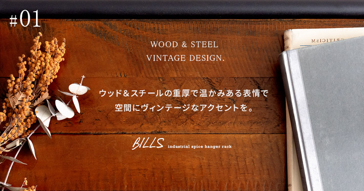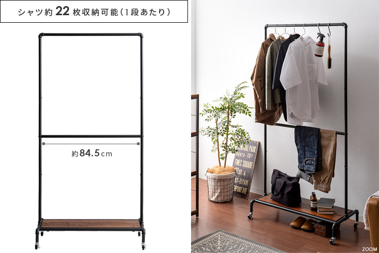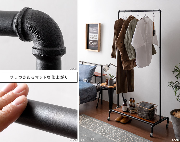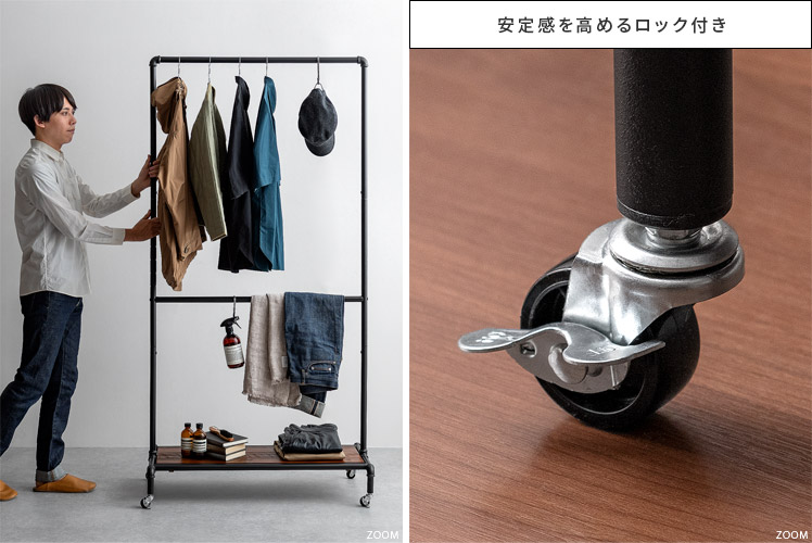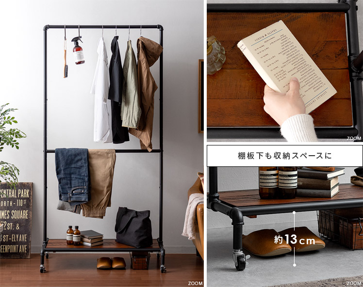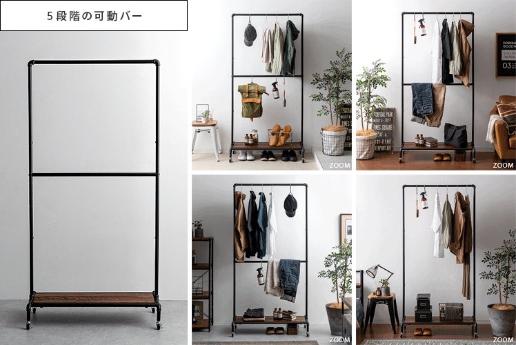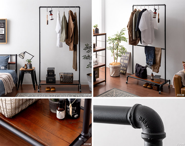 ハンガーラック BILLS(ビルズ) 90cm幅/空間にアクセントを作るヴィンテージデザインのハンガーラック“BILLS(ビルズ)”細部にインダストリアルな装飾を施したマットなブラックスチールと、上質な温もり感じる天然木パイン素材を使用した、雰囲気漂う重厚な佇まいのヴィンテージデザイン。コーディネートのアクセントになり、メリハリの効いたお部屋をお作りいただけます。また、衣類や小物をまとめられる収納力にもこだわりました。ワイドでたっぷり掛けられる2段のハンガーバーと、カバンなどの小物を置いて収納できる棚板。2種類の収納を使い分けて、洋服から小物類まで、よく使うアイテムをひとまとめに。さらに、下段ハンガーバーは5段階の可動式となっておりますので、丈の短いジャケットや、長めのロングコートまで、お手持ちのアイテムに合わせた高さに調整可能となっております。