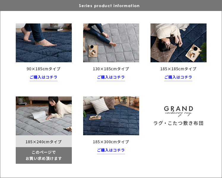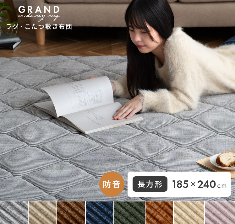 ラグ・こたつ敷き布団 GRAND〔グランド〕 長方形 185x240cm/極厚30mmのウレタンを贅沢に使用した“GRAND(グランド)”まるでベッドの上にいるようなふかふか感と、やさしい肌触りのコーデュロイ生地が快適なくつろぎ空間を演出いたします。また、快適さだけでなく見た目にも温かなデザインにこだわりました。太畝×立体的なキルティングが生み出す陰影が、お部屋を素敵な印象にしていただけます。ふかふか極厚のラグ・こたつ敷き布団で、冬のお部屋をもっと居心地の良い空間に。