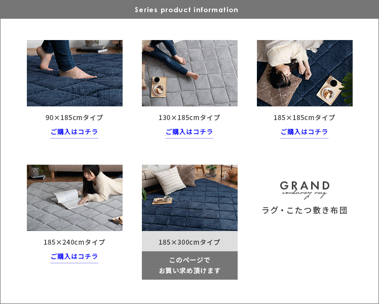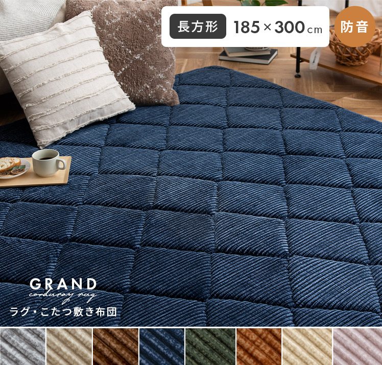 ラグ・こたつ敷き布団 GRAND〔グランド〕 長方形 185x300cm/極厚30mmのウレタンを贅沢に使用した“GRAND(グランド)”まるでベッドの上にいるようなふかふか感と、やさしい肌触りのコーデュロイ生地が快適なくつろぎ空間を演出いたします。また、快適さだけでなく見た目にも温かなデザインにこだわりました。太畝×立体的なキルティングが生み出す陰影が、お部屋を素敵な印象にしていただけます。ふかふか極厚のラグ・こたつ敷き布団で、冬のお部屋をもっと居心地の良い空間に。