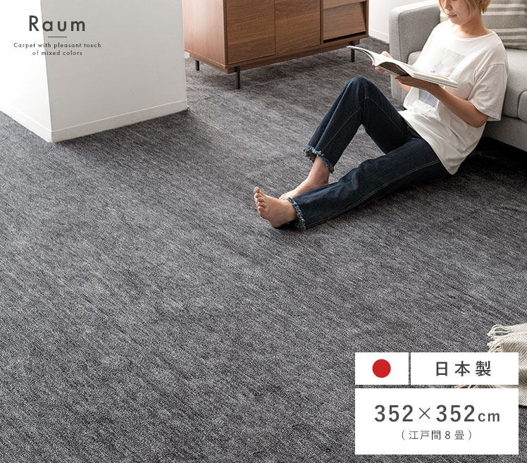 平織カーペット ラウム〔Raum〕 352x352cm/パイル先端を切り開いたカットパイルを採用した、平織カーペット ”ラウム(Raum)”毛先を同じ長さでカットすることで、肌触りがふんわり柔らかな仕上がりに。短いパイルの軽い触り心地で、年中サラッとお使いいただけます。さらに、ペットの爪が引っ掛かりにくく歩行も安心・安全。大切なペットとの暮らしを、足元から快適にサポートいたします。また、トーンの違う糸を絶妙なバランスで組み合わせたミックスカラー。柔らかな温もりを添えるデザイン性にもこだわった仕上がりとなっております。滑らかな触り心地と、ペットの安全も守る敷き詰めカーペットで、人もペットも快適な生活を。