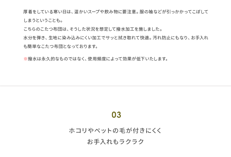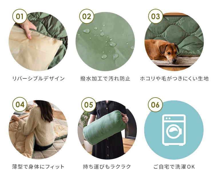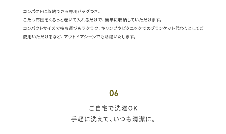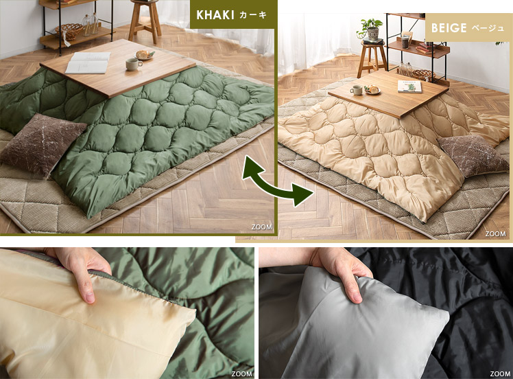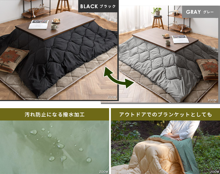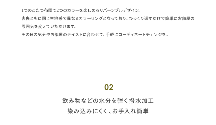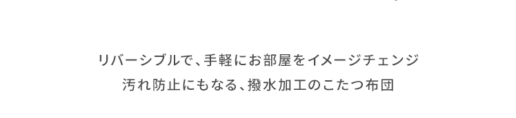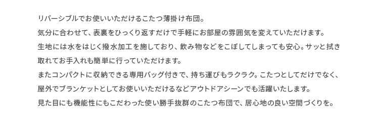 撥水リバーシブルこたつ掛け布団 長方形 190×230cm/リバーシブルでお使いいただけるこたつ薄掛け布団。気分に合わせて、表裏をひっくり返すだけで手軽にお部屋の雰囲気を変えていただけます。生地には水をはじく撥水加工を施しており、飲み物などをこぼしてしまっても安心。サッと拭き取れてお手入れも簡単に行っていただけます。またコンパクトに収納できる専用バッグ付きで、持ち運びもラクラク。こたつとしてだけでなく、屋外でブランケットとしてお使いいただけるなどアウトドアシーンでも活躍いたします。見た目にも機能性にもこだわった使い勝手抜群のこたつ布団で、居心地の良い空間づくりを。