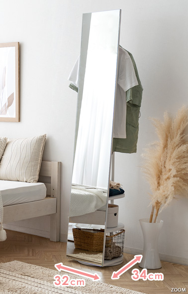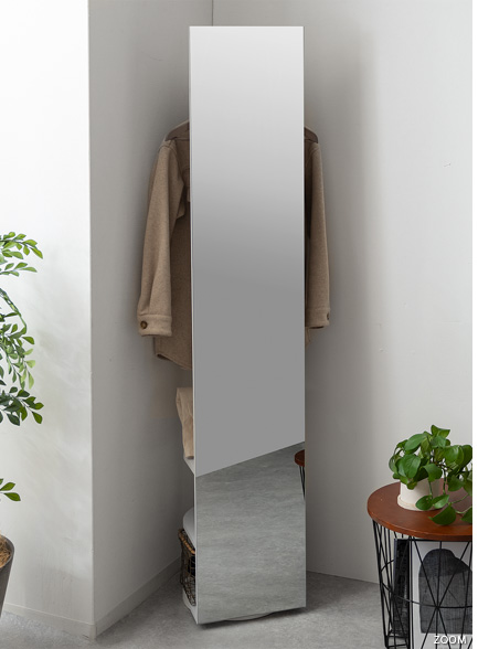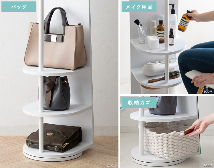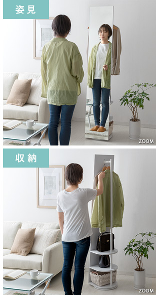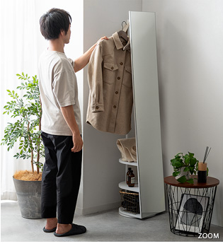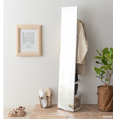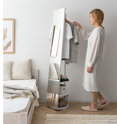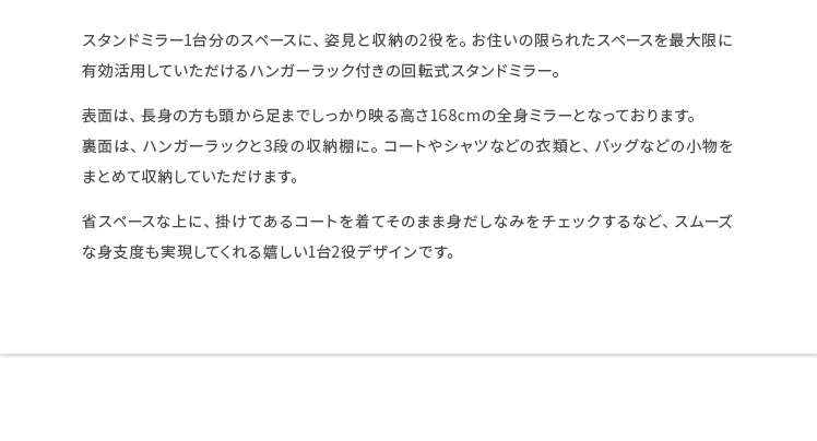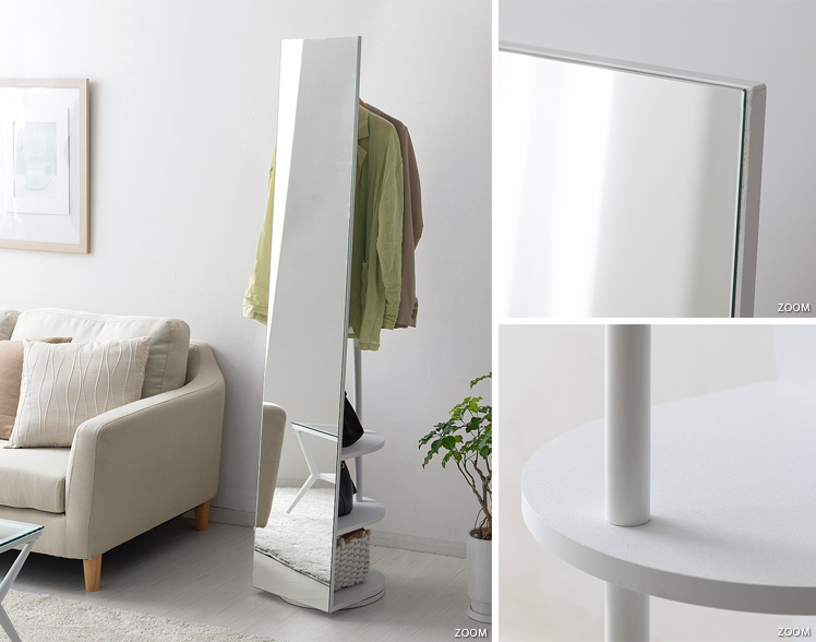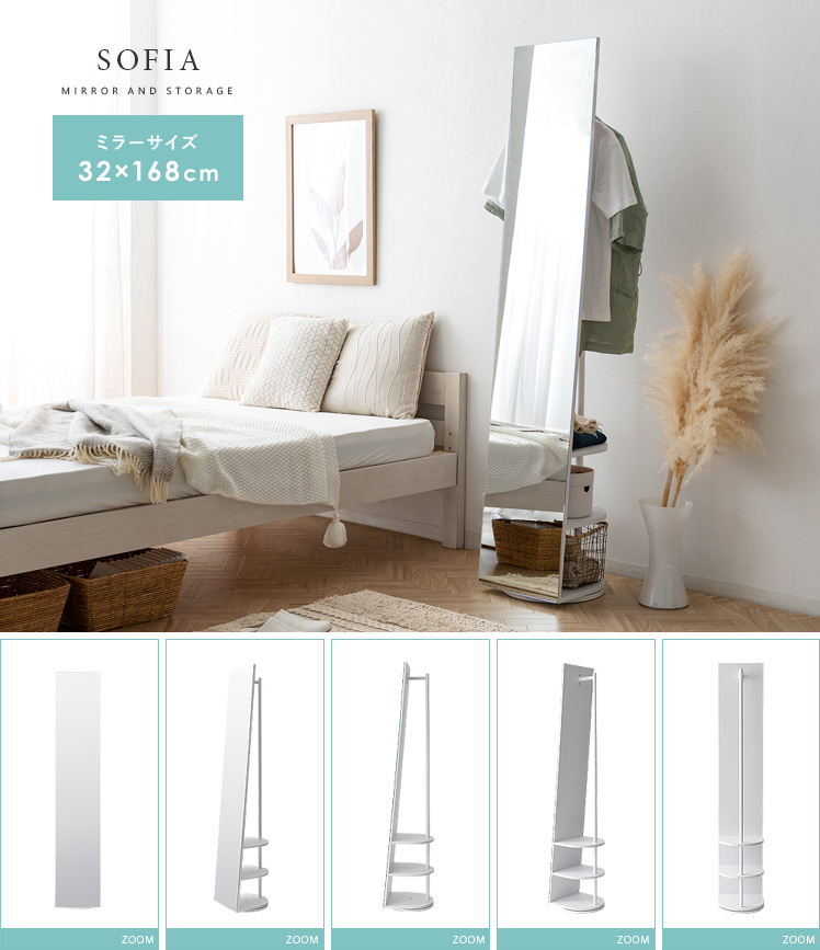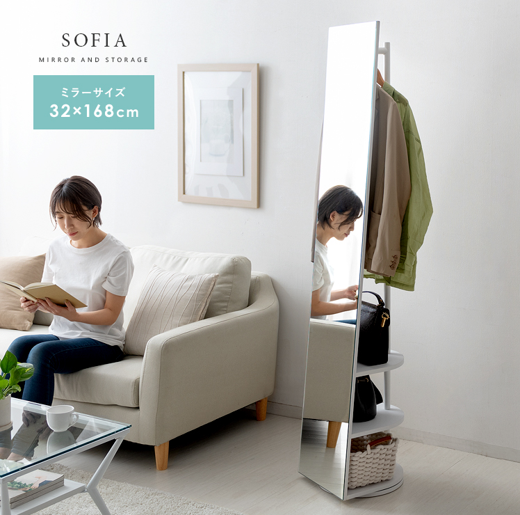 収納付きスタンドミラー SOFIA〔ソフィア〕/スタンドミラー1台分のスペースに、姿見と収納の2役を。お住いの限られたスペースを最大限に有効活用していただけるハンガーラック付きの回転式スタンドミラー。表面は、長身の方も頭から足までしっかり映る高さ168cmの全身ミラーとなっております。裏面は、ハンガーラックと3段の収納棚に。コートやシャツなどの衣類と、バッグなどの小物をまとめて収納していただけます。省スペースな上に、掛けてあるコートを着てそのまま身だしなみをチェックするなど、スムーズな身支度も実現してくれる嬉しい1台2役デザインです。