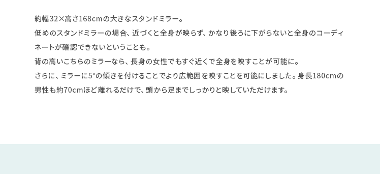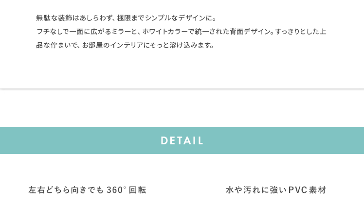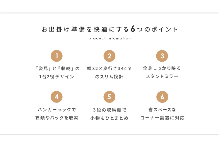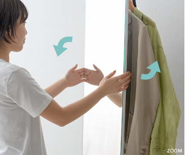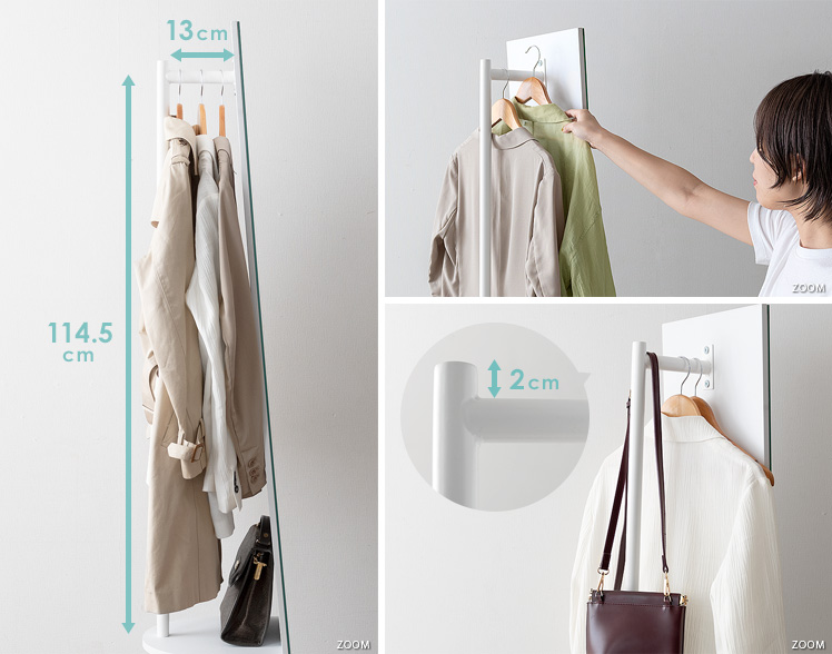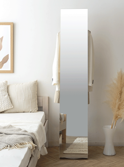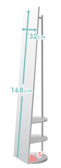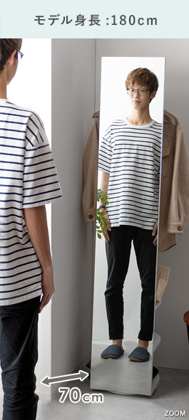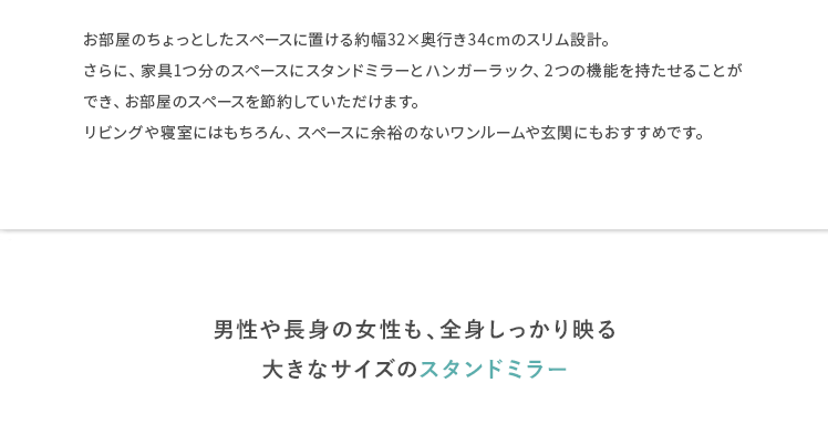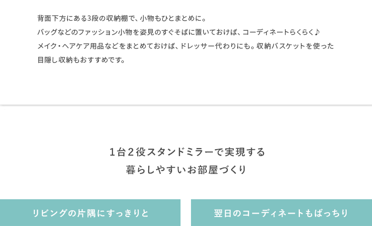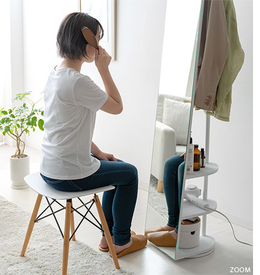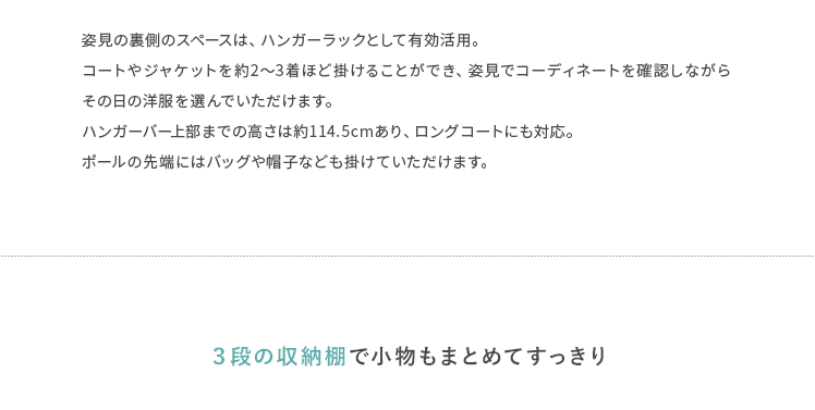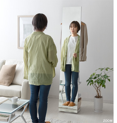 収納付きスタンドミラー SOFIA〔ソフィア〕/スタンドミラー1台分のスペースに、姿見と収納の2役を。お住いの限られたスペースを最大限に有効活用していただけるハンガーラック付きの回転式スタンドミラー。表面は、長身の方も頭から足までしっかり映る高さ168cmの全身ミラーとなっております。裏面は、ハンガーラックと3段の収納棚に。コートやシャツなどの衣類と、バッグなどの小物をまとめて収納していただけます。省スペースな上に、掛けてあるコートを着てそのまま身だしなみをチェックするなど、スムーズな身支度も実現してくれる嬉しい1台2役デザインです。