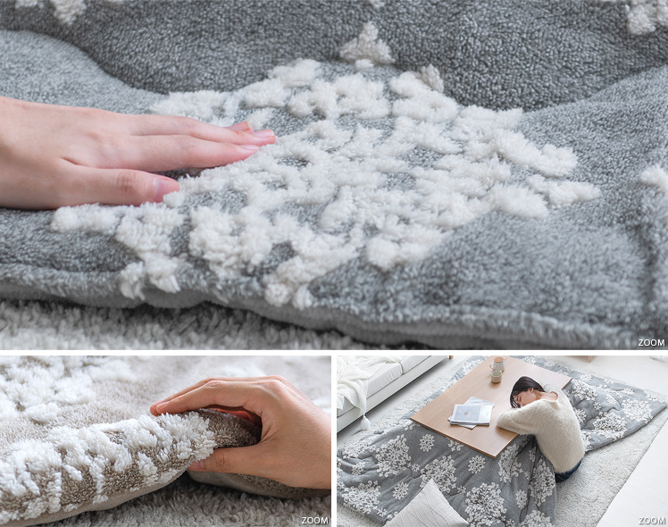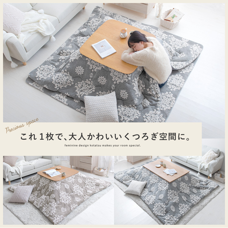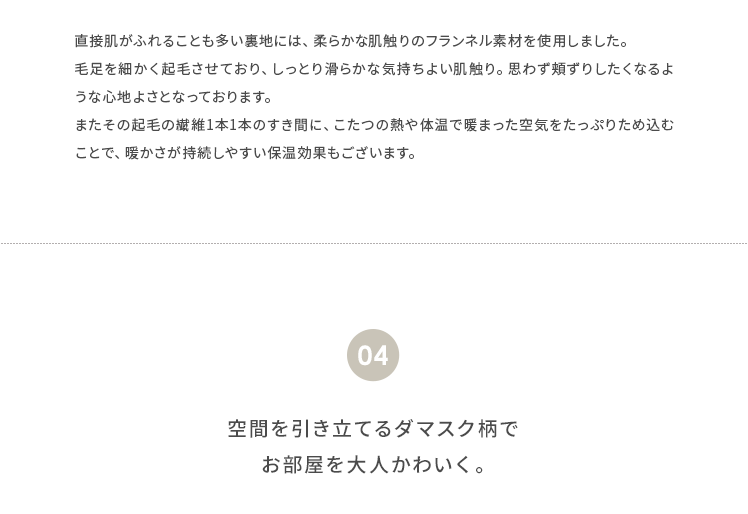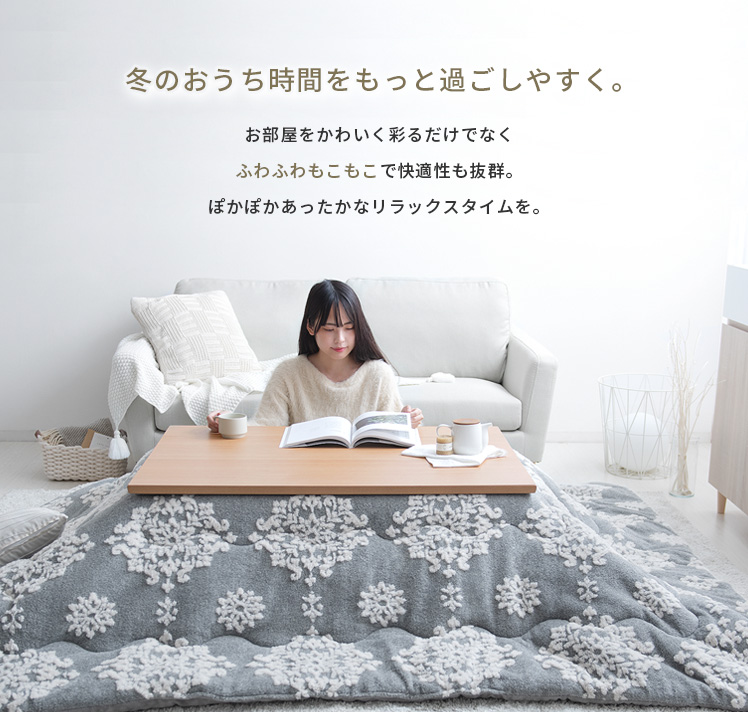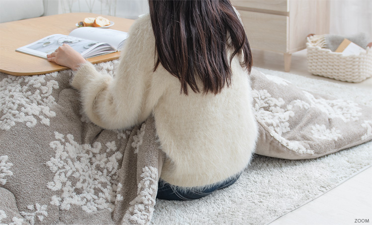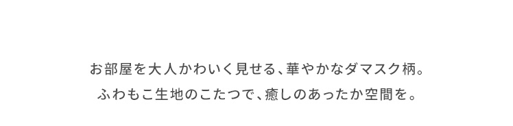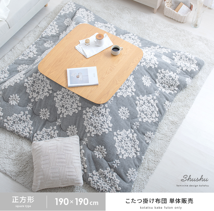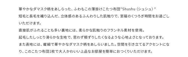 薄掛けこたつ布団 Shushu〔シュシュ〕 正方形 190×190cm/華やかなダマスク柄をあしらった、ふわもこのこたつ薄掛け布団”Shushu(シュシュ)”短毛と長毛を織り込んだ、立体感のあるふんわりした肌触りで、至福のくつろぎ時間をお過ごしいただけます。直接肌がふれることも多い裏地には、柔らかな肌触りのフランネル素材を使用。起毛したしっとり滑らかな生地で、思わず頬ずりしたくなるような心地よさとなっております。また表地には、繊細で華やかなダマスク柄をあしらいました。空間を引き立てるアクセントになり、このこたつ1枚で大人かわいい上品なお部屋を簡単におつくりいただけます。