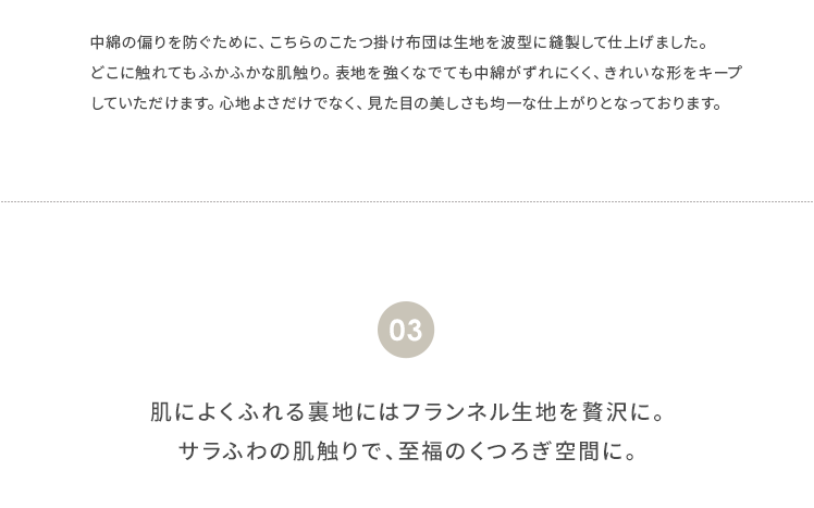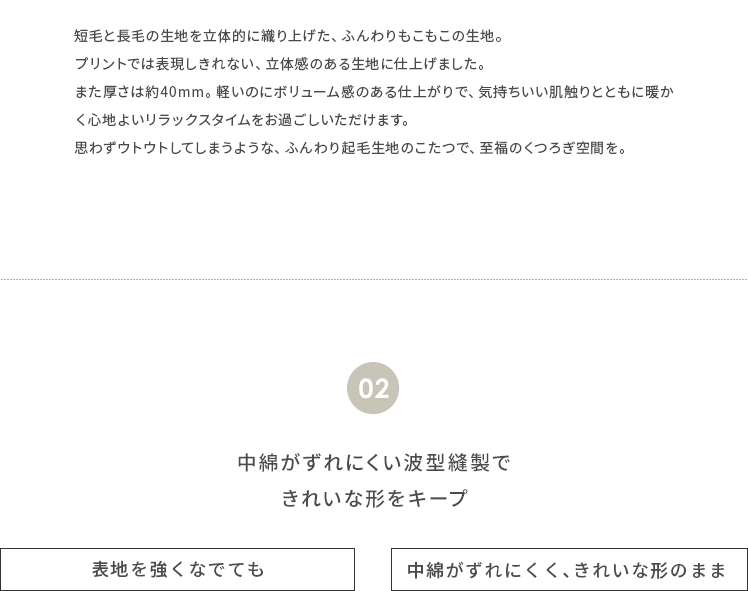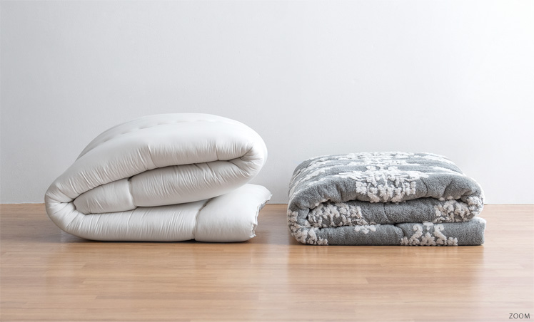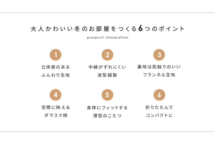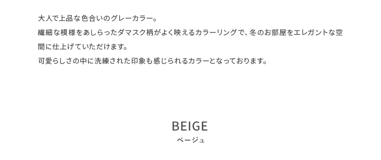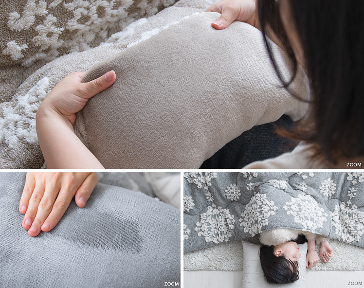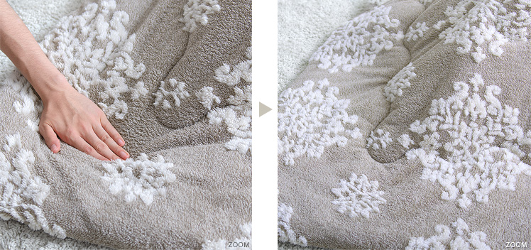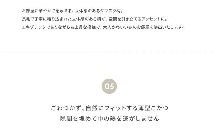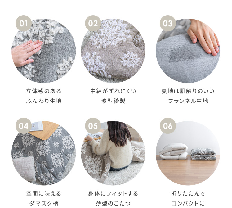 薄掛けこたつ布団 Shushu〔シュシュ〕 正方形 190×190cm/華やかなダマスク柄をあしらった、ふわもこのこたつ薄掛け布団”Shushu(シュシュ)”短毛と長毛を織り込んだ、立体感のあるふんわりした肌触りで、至福のくつろぎ時間をお過ごしいただけます。直接肌がふれることも多い裏地には、柔らかな肌触りのフランネル素材を使用。起毛したしっとり滑らかな生地で、思わず頬ずりしたくなるような心地よさとなっております。また表地には、繊細で華やかなダマスク柄をあしらいました。空間を引き立てるアクセントになり、このこたつ1枚で大人かわいい上品なお部屋を簡単におつくりいただけます。