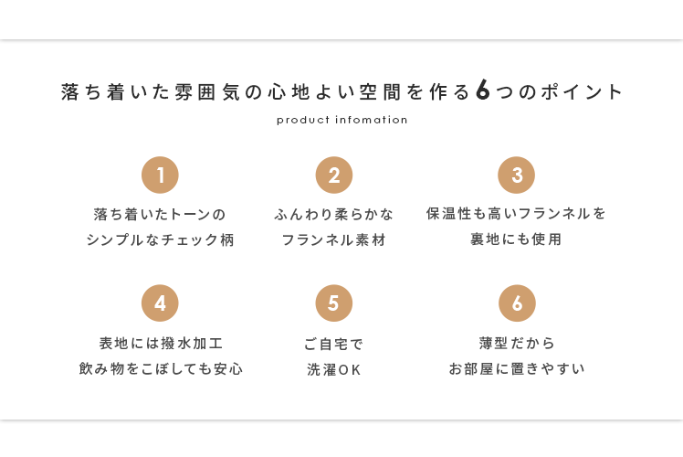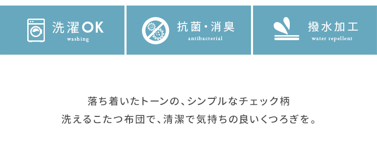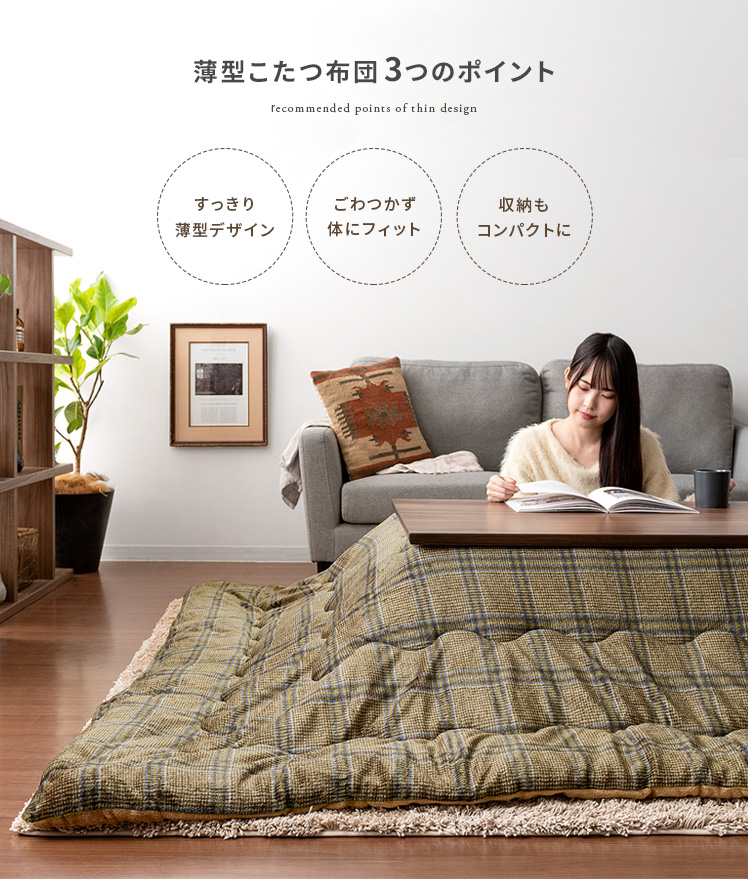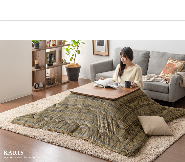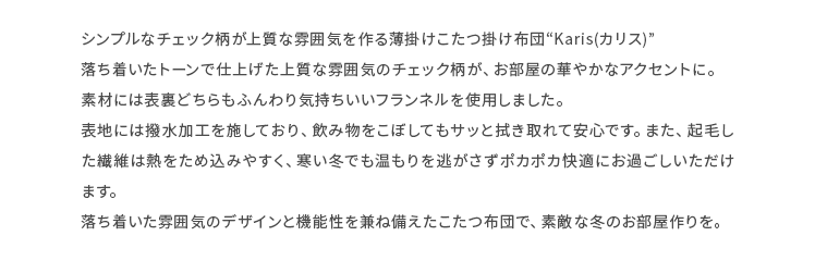 薄掛けこたつ布団 Karis〔カリス〕 正方形190×190cm/シンプルなチェック柄が上質な雰囲気を作る薄掛けこたつ掛け布団“Karis(カリス)”落ち着いたトーンで仕上げた上質な雰囲気のチェック柄が、お部屋の華やかなアクセントに。素材には表裏どちらもふんわり気持ちいいフランネルを使用しました。表地には撥水加工を施しており、飲み物をこぼしてもサッと拭き取れて安心です。また、起毛した繊維は熱をため込みやすく、寒い冬でも温もりを逃がさずポカポカ快適にお過ごしいただけます。落ち着いた雰囲気のデザインと機能性を兼ね備えたこたつ布団で、素敵な冬のお部屋作りを。