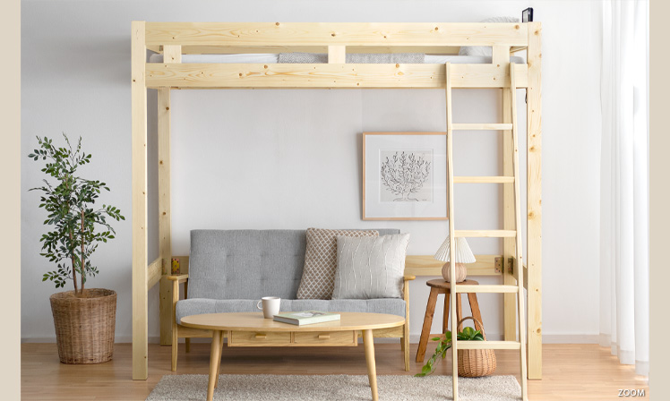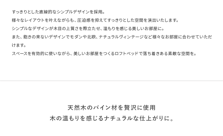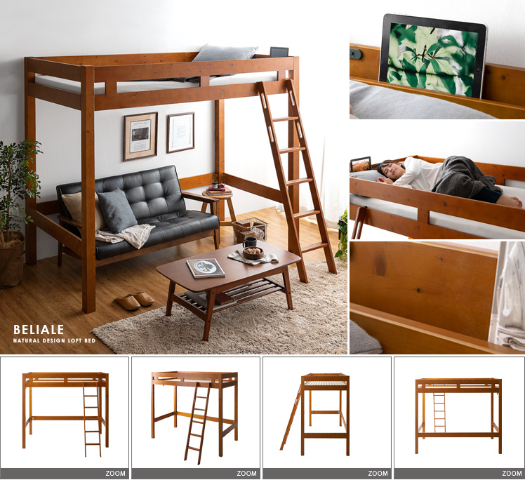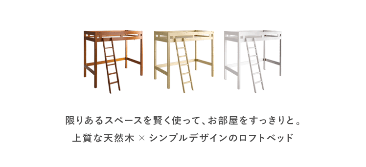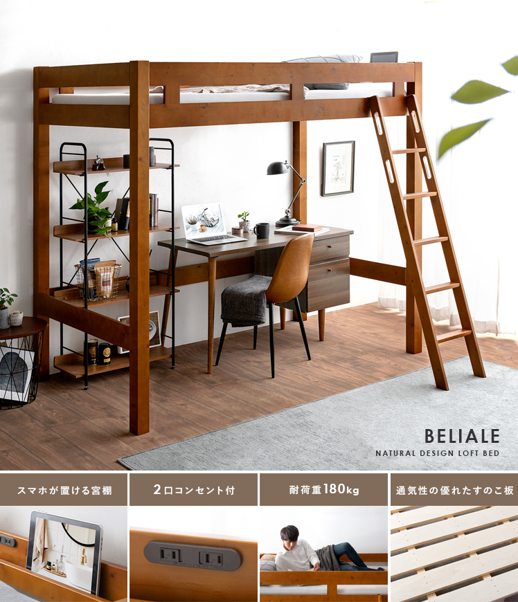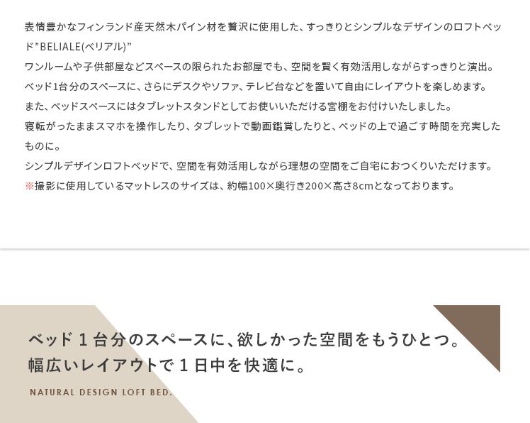ロフトベッド BELIALE〔ベリアル〕 シングルサイズ フレーム単体販売/表情豊かなフィンランド産天然木パイン材を贅沢に使用した、すっきりとシンプルなデザインのロフトベッド”BELIALE(ベリアル)”ワンルームや子供部屋などスペースの限られたお部屋でも、空間を賢く有効活用しながらすっきりと演出。ベッド1台分のスペースに、さらにデスクやソファ、テレビ台などを置いて自由にレイアウトを楽しめます。また、ベッドスペースにはタブレットスタンドとしてお使いいただける宮棚をお付けいたしました。寝転がったままスマホを操作したり、タブレットで動画鑑賞したりと、ベッドの上で過ごす時間を充実したものに。シンプルデザインロフトベッドで、空間を有効活用しながら理想の空間をご自宅におつくりいただけます。