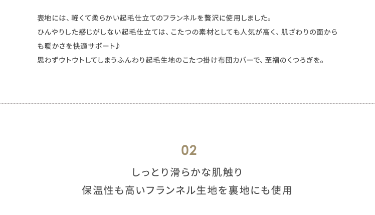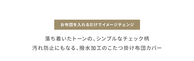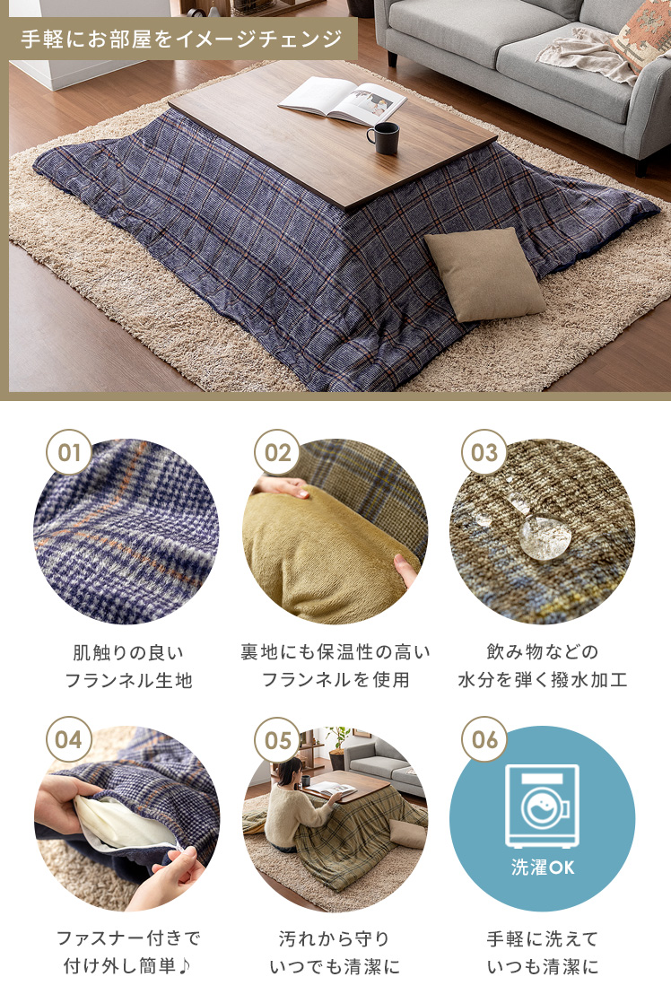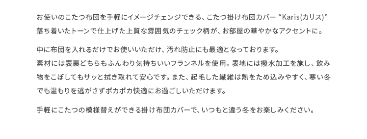 こたつ掛け布団カバー Karis〔カリス〕 正方形195×195cm/お使いのこたつ布団を手軽にイメージチェンジできる、こたつ掛け布団カバー “Karis(カリス)”落ち着いたトーンで仕上げた上質な雰囲気のチェック柄が、お部屋の華やかなアクセントに。中に布団を入れるだけでお使いいただけ、汚れ防止にも最適となっております。素材には表裏どちらもふんわり気持ちいいフランネルを使用。表地には撥水加工を施し、飲み物をこぼしてもサッと拭き取れて安心です。また、起毛した繊維は熱をため込みやすく、寒い冬でも温もりを逃がさずポカポカ快適にお過ごしいただけます。手軽にこたつの模様替えができる掛け布団カバーで、いつもと違う冬をお楽しみください。
