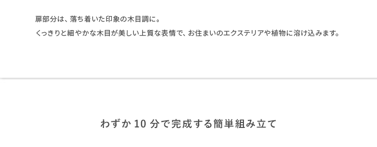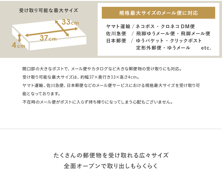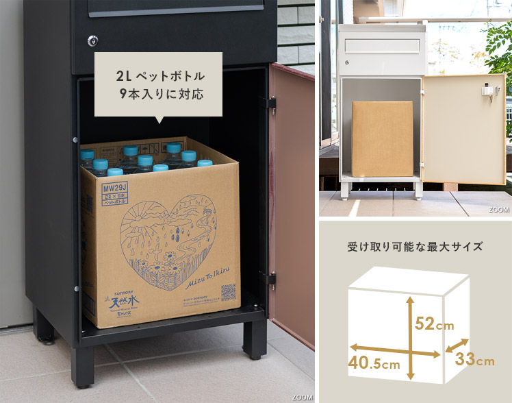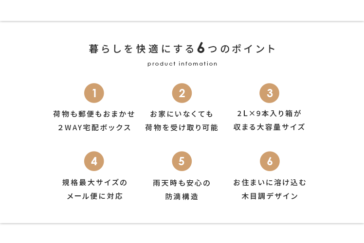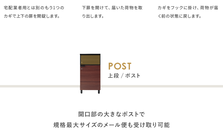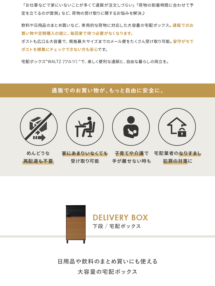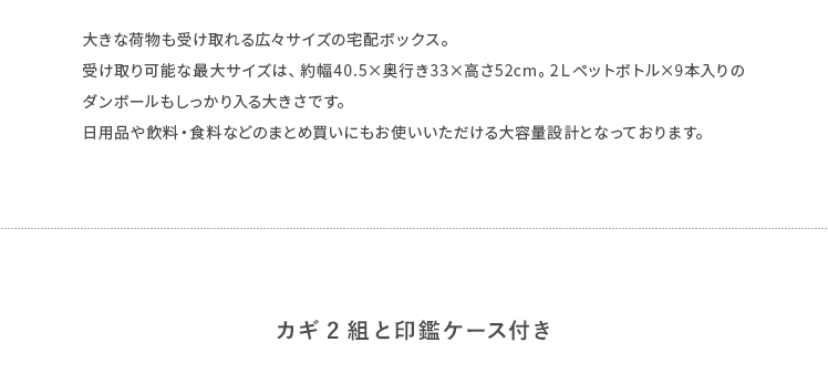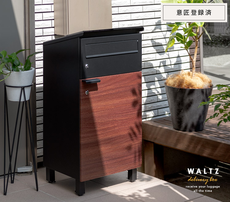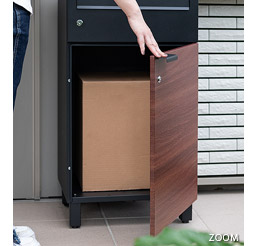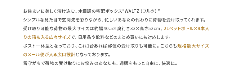 ポスト一体型宅配ボックス WALTZ〔ワルツ〕/お住まいに美しく溶け込む、木目調の宅配ボックス“WALTZ(ワルツ)”シックな見た目で玄関先を彩りながら、忙しいあなたの代わりに荷物を受け取ってくれます。受け取り可能な荷物の最大サイズは約幅40.5×奥行き33×52cm。2Lペットボトル×9本入りの箱も入る広々サイズで、日用品や飲料などのまとめ買いにも対応します。ポスト一体型となっており、これ1台で郵便の受け取りも可能に。こちらも規格最大サイズのメール便が入る広口設計となっております。留守がちで荷物の受け取りにお悩みのあなたも、通販をもっと自由に、快適に。