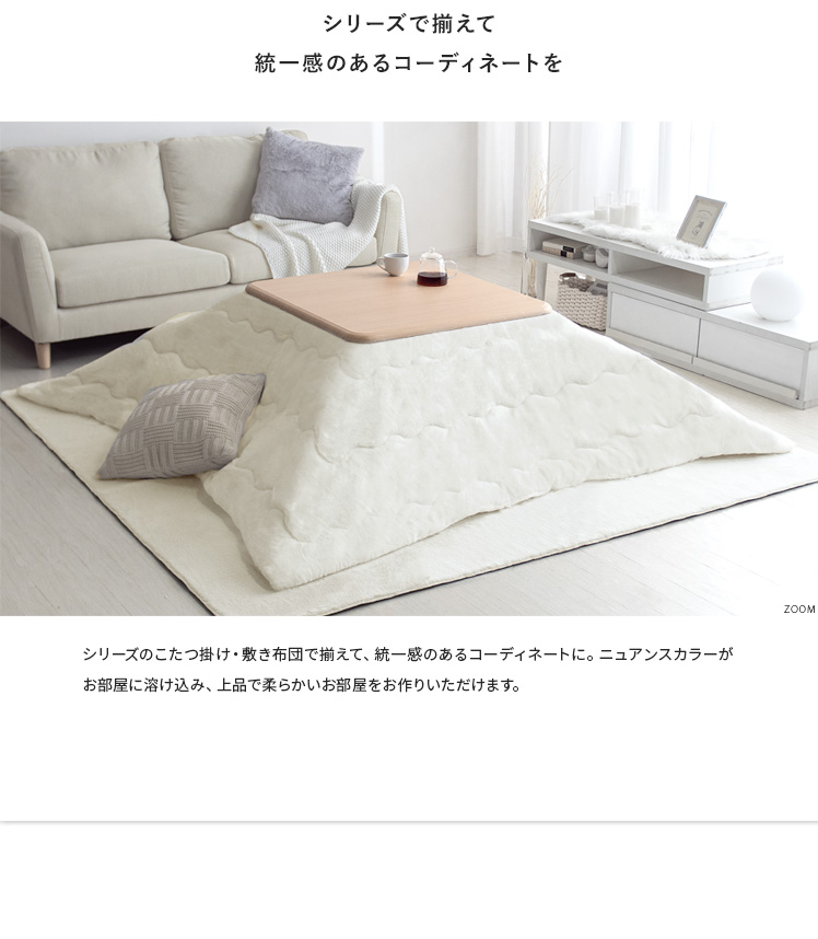 ふわふわのフェイクファーがやさしく包み込む、淡い色合いのこたつ布団で、大人可愛い空間に。