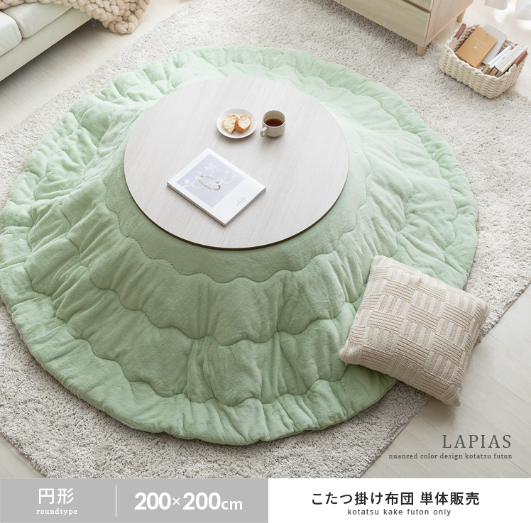 薄掛けこたつ布団 LAPIAS〔ラピアス〕 円形 直径200cm/ふわふわのフェイクファーと淡いニュアンスカラーが冬の素敵なお部屋をつくる、薄掛けこたつ掛け布団”LAPIAS(ラピアス)”表地にはフェイクファーを贅沢に使用し、さらさら&ふわふわの手触りに。また、直接肌に触れる裏地には滑らかな肌触りのフランネル生地を使用いたしました。熱をため込みやすく、寒い冬もぬくぬく快適に♪淡いニュアンスカラーとふわふわの可愛らしいデザイン、暖かく快適な空間をつくる機能性を兼ね備えたこたつ布団で、素敵な冬のお部屋作りを。