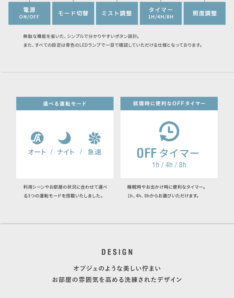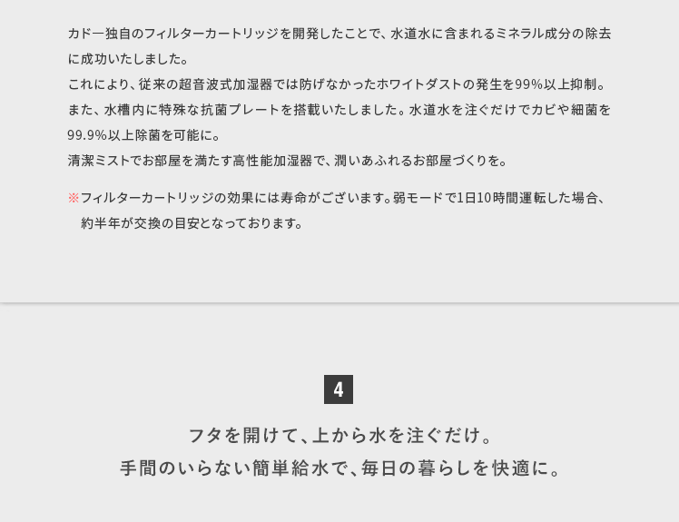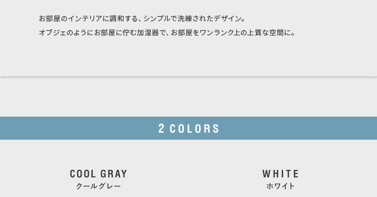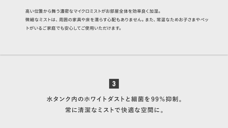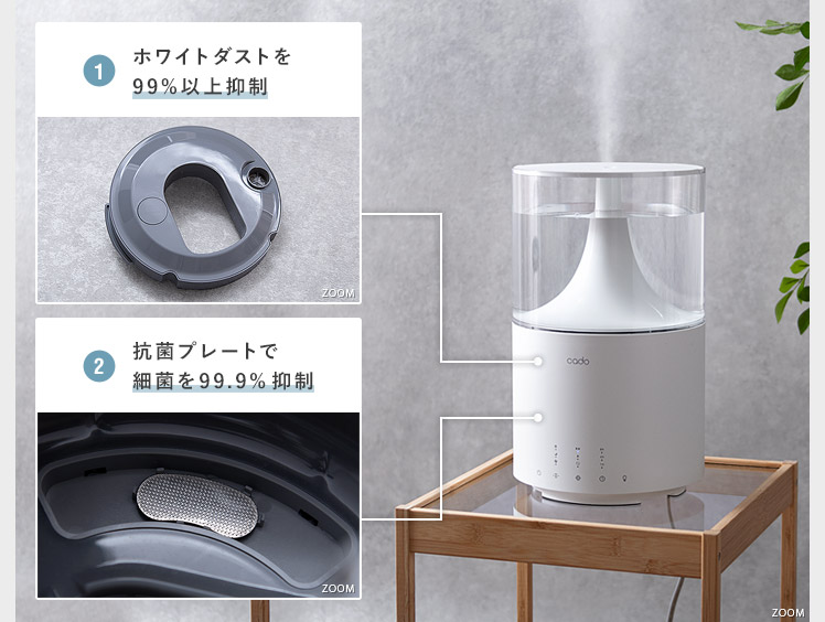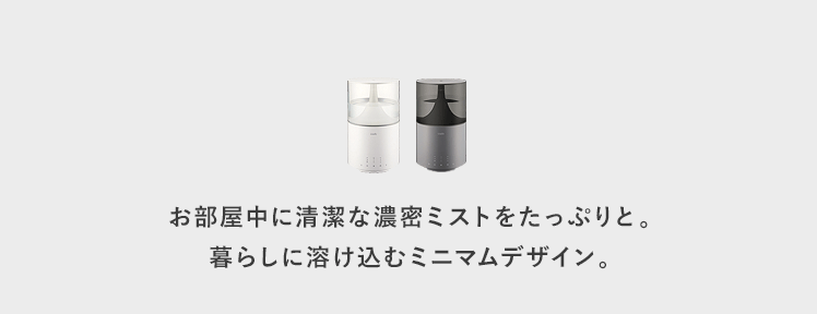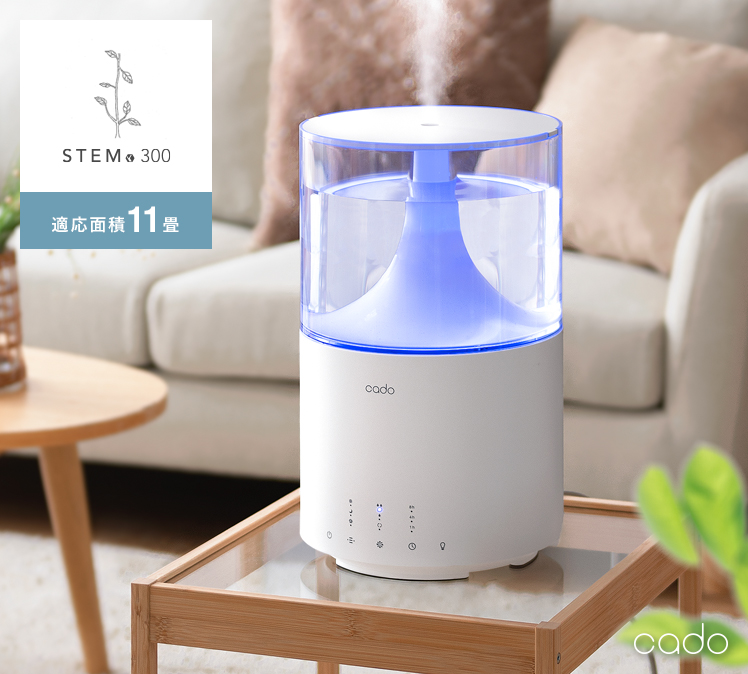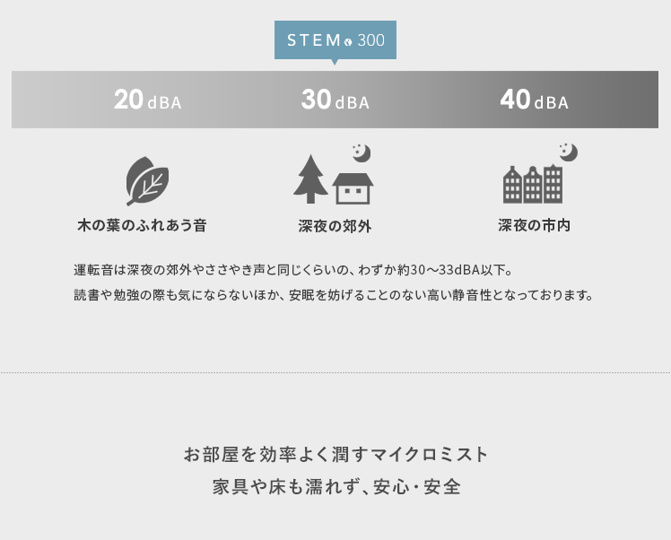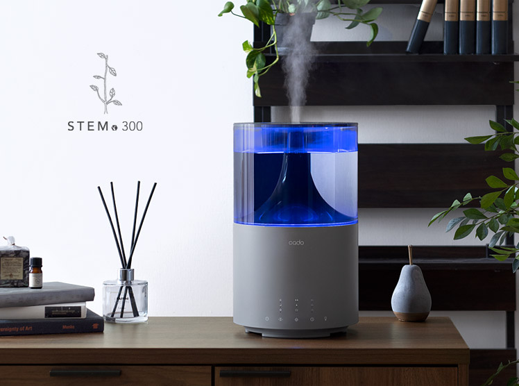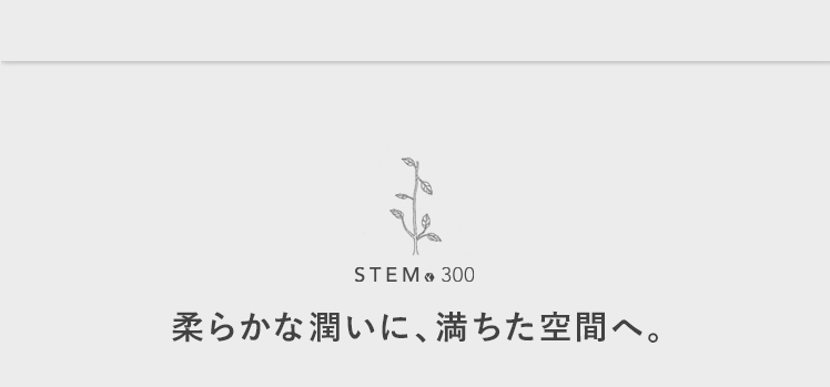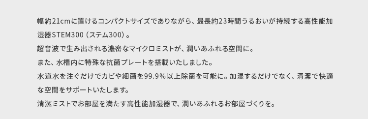 超音波加湿器 STEM300/幅約21cmに置けるコンパクトサイズでありながら、最長約23時間うるおいが持続する高性能加湿器STEM300(ステム300)。超音波で生み出される濃密なマイクロミストが、潤いあふれる空間に。また、水槽内に特殊な抗菌プレートを搭載いたしました。水道水を注ぐだけでカビや細菌を99.9%以上除菌を可能に。加湿するだけでなく、清潔で快適な空間をサポートいたします。清潔ミストでお部屋を満たす高性能加湿器で、潤いあふれるお部屋づくりを。