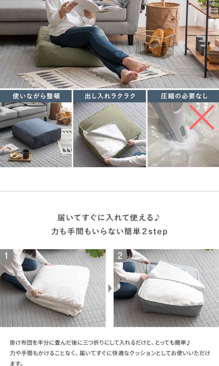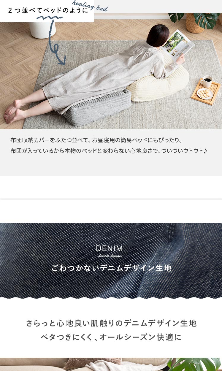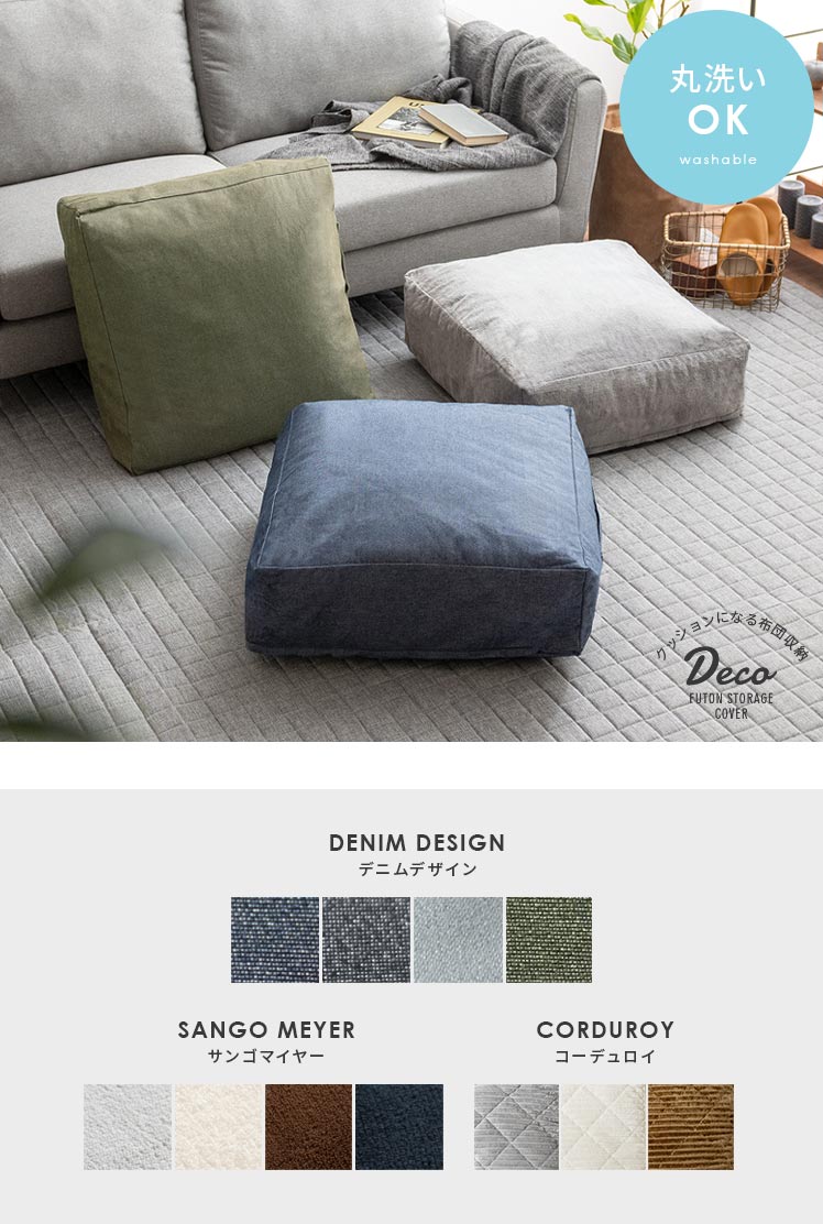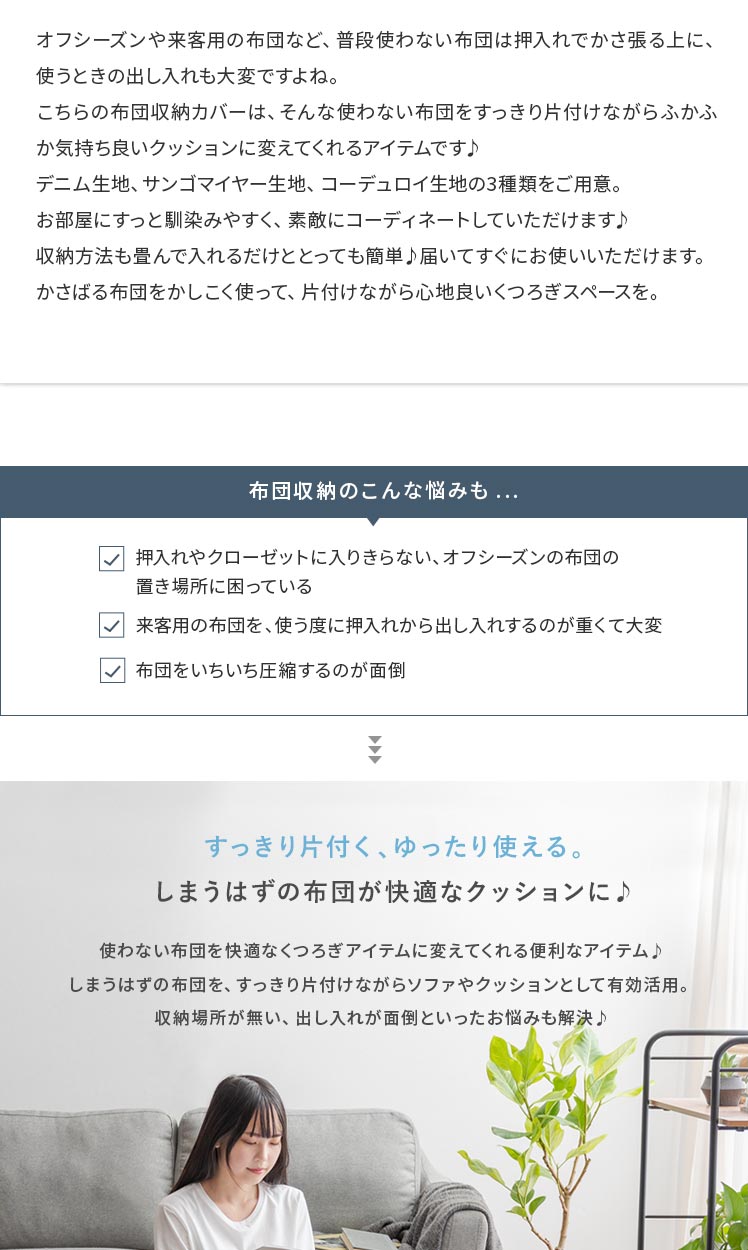 クッションになる布団収納カバー Deco〔デコ〕 スクエアタイプ/オフシーズンや来客用の布団など、普段使わない布団は押入れでかさ張る上に、使うときの出し入れも大変ですよね。こちらの布団収納カバーは、そんな使わない布団をすっきり片付けながらふかふか気持ち良いクッションに変えてくれるアイテムです♪お部屋に馴染みやすいデニムデザイン生地&サンゴマイヤー生地で、素敵にコーディネート。収納方法も、畳んで入れるだけととっても簡単♪届いてすぐにお使いいただけます。かさばる布団をかしこく使って、片付けながら心地良いくつろぎスペースを。