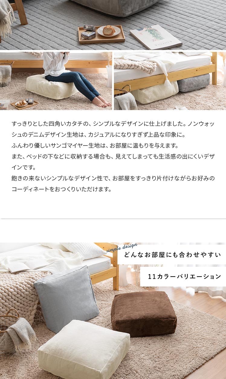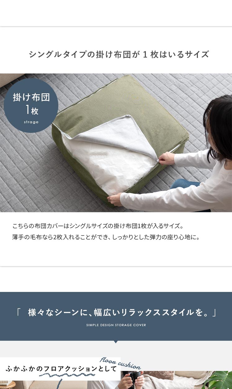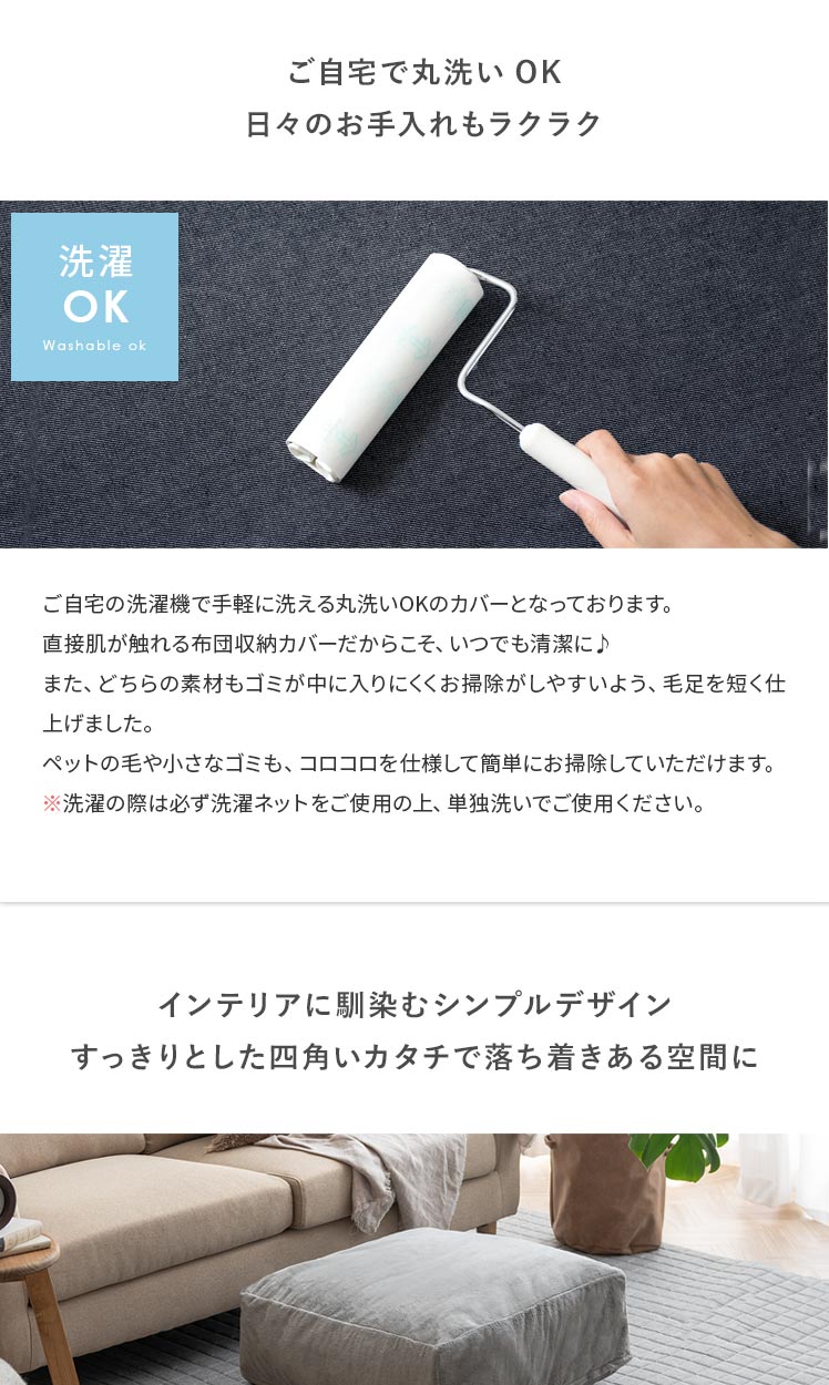クッションになる布団収納カバー Deco〔デコ〕 スクエアタイプ/オフシーズンや来客用の布団など、普段使わない布団は押入れでかさ張る上に、使うときの出し入れも大変ですよね。こちらの布団収納カバーは、そんな使わない布団をすっきり片付けながらふかふか気持ち良いクッションに変えてくれるアイテムです♪お部屋に馴染みやすいデニムデザイン生地&サンゴマイヤー生地で、素敵にコーディネート。収納方法も、畳んで入れるだけととっても簡単♪届いてすぐにお使いいただけます。かさばる布団をかしこく使って、片付けながら心地良いくつろぎスペースを。