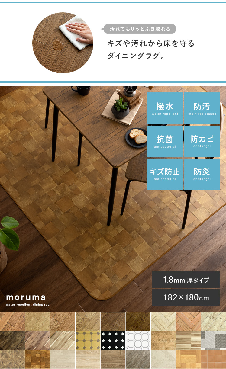 撥水ダイニングラグ moruma〔モルマ〕 182x180cm / 表面に撥水・防汚加工を施した、汚してもサッと拭き取れるダイニングラグ”moruma(モルマ)”毛足の無いサラッとした表面で、掃除機やモップ掛けも快適に行えます♪床をキズや汚れから守るこちらのラグは、子供部屋やリビングにもオススメです。シートには抗菌・防ダニ加工も施しており、小さなお子様やペットのいるご家庭でも安心。表面には立体感あるエンボス加工を施しており、豊かな表情でダイニングを惹きたてます。ダイニングの床をキズや汚れから守りながら、見栄えのよい素敵な空間作りを。