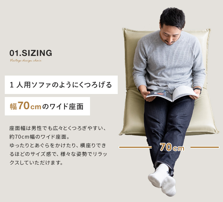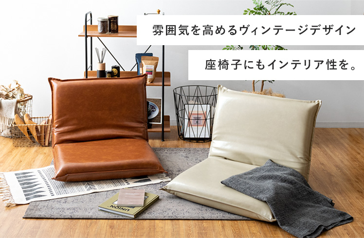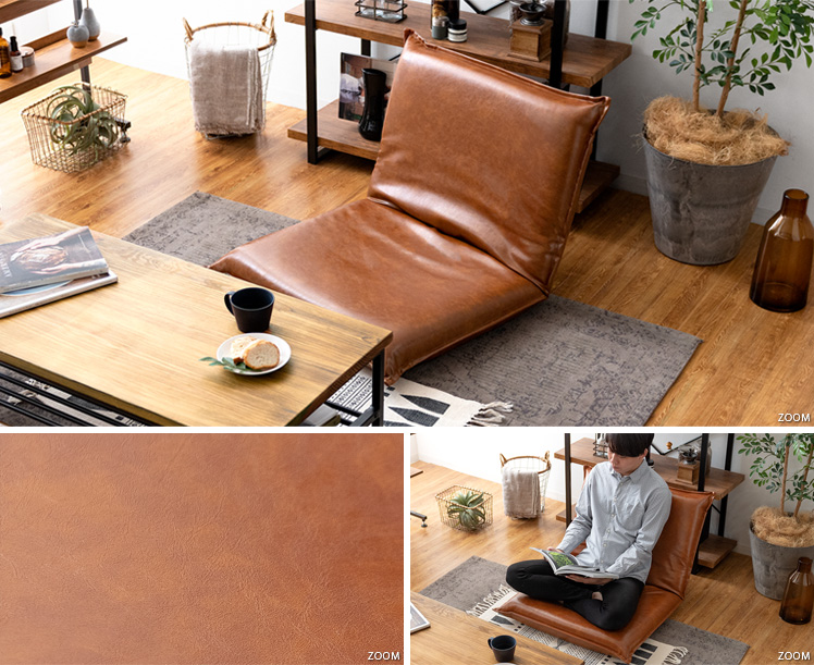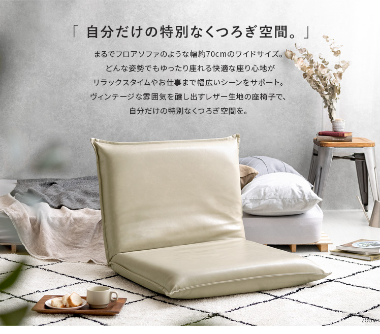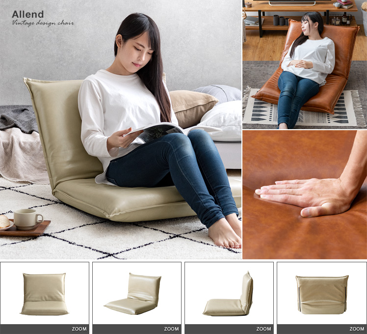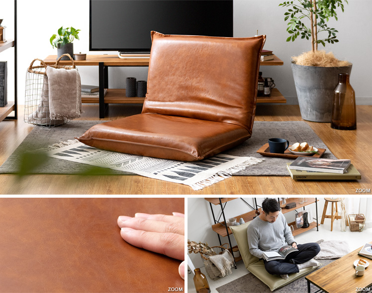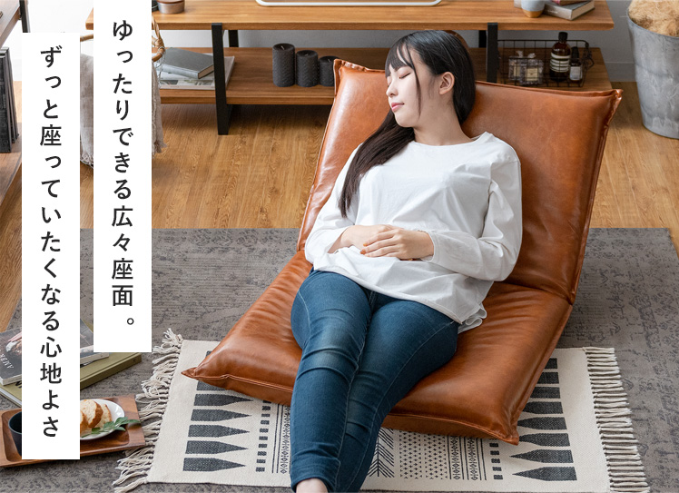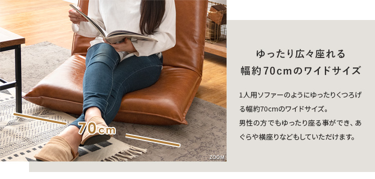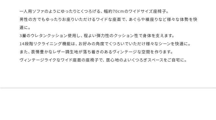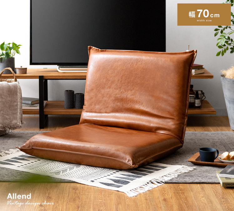 リクライニング座椅子 Allend(アレンド)/一人用ソファのようにゆったりとくつろげる、幅約70cmのワイドサイズ座椅子。男性の方でもゆったりお座りいただけるワイドな座面で、あぐらや横座りなど様々な体勢を快適に。3層のウレタンクッション使用し、程よい弾力性のクッション性で身体を支えます。14段階リクライニング機能は、お好みの角度でくつろいでいただけ様々なシーンを快適に。また、表情豊かなレザー調生地が落ち着きのあるヴィンテージな空間を作ります。ヴィンテージライクなワイド座面の座椅子で、居心地のよいくつろぎスペースをご自宅に。