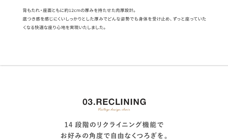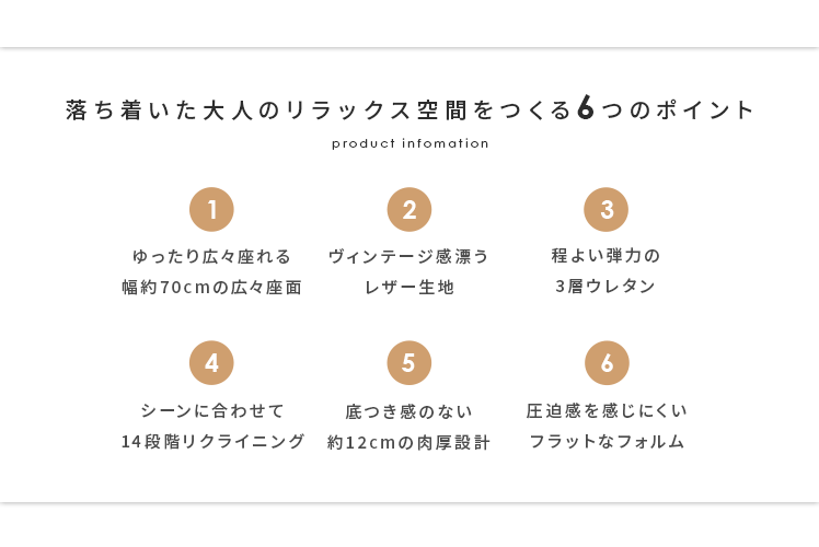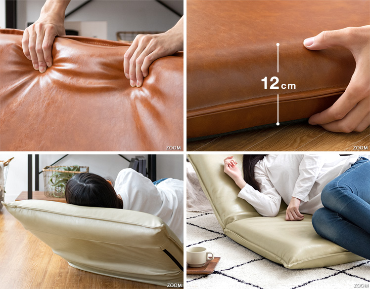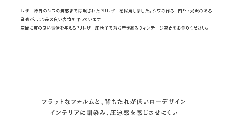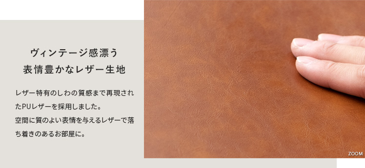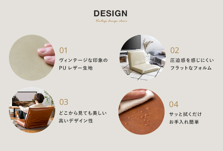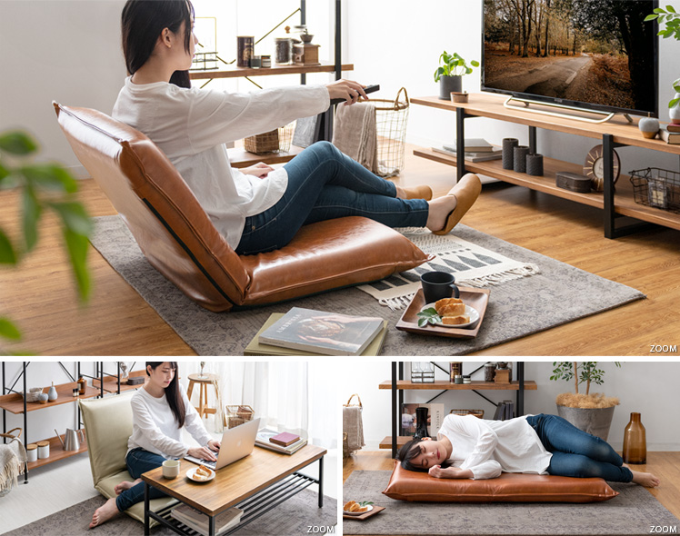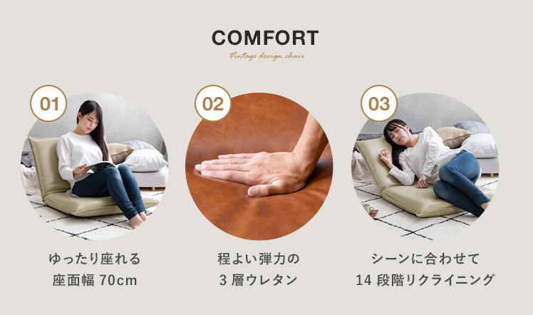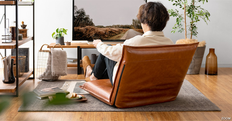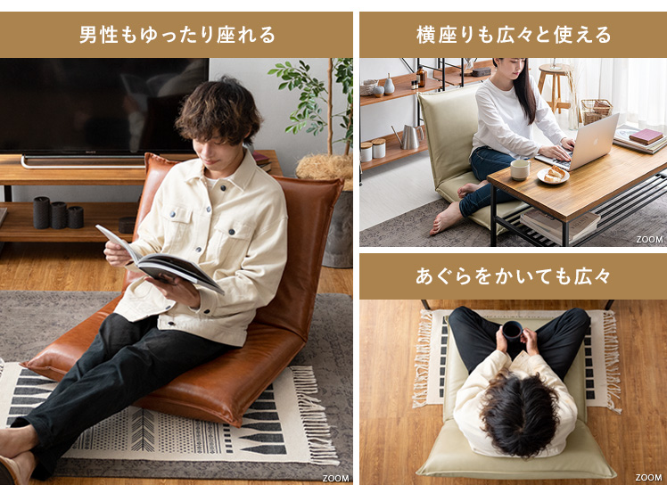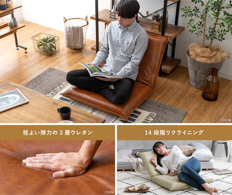 リクライニング座椅子 Allend(アレンド)/一人用ソファのようにゆったりとくつろげる、幅約70cmのワイドサイズ座椅子。男性の方でもゆったりお座りいただけるワイドな座面で、あぐらや横座りなど様々な体勢を快適に。3層のウレタンクッション使用し、程よい弾力性のクッション性で身体を支えます。14段階リクライニング機能は、お好みの角度でくつろいでいただけ様々なシーンを快適に。また、表情豊かなレザー調生地が落ち着きのあるヴィンテージな空間を作ります。ヴィンテージライクなワイド座面の座椅子で、居心地のよいくつろぎスペースをご自宅に。