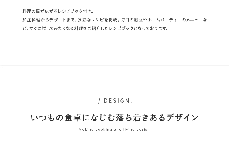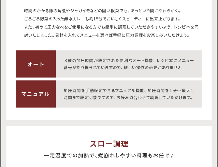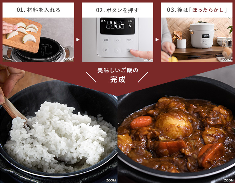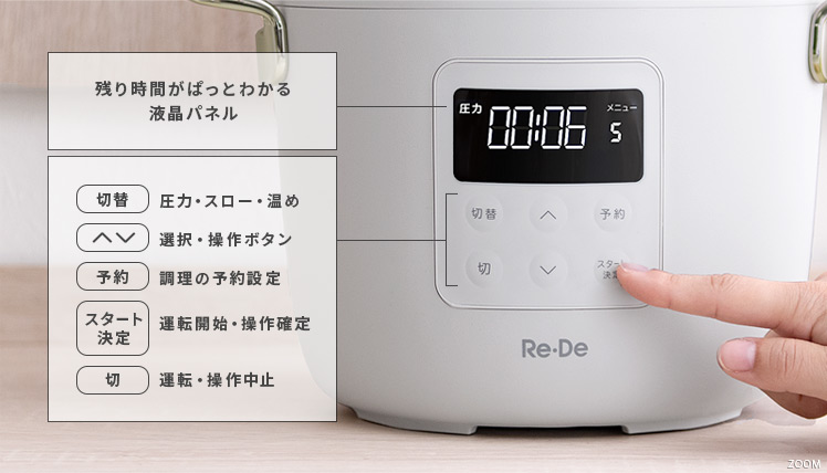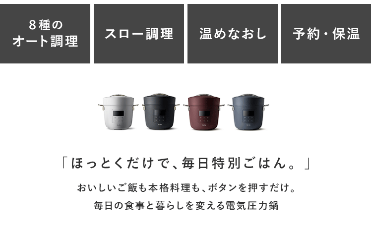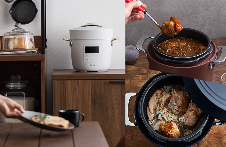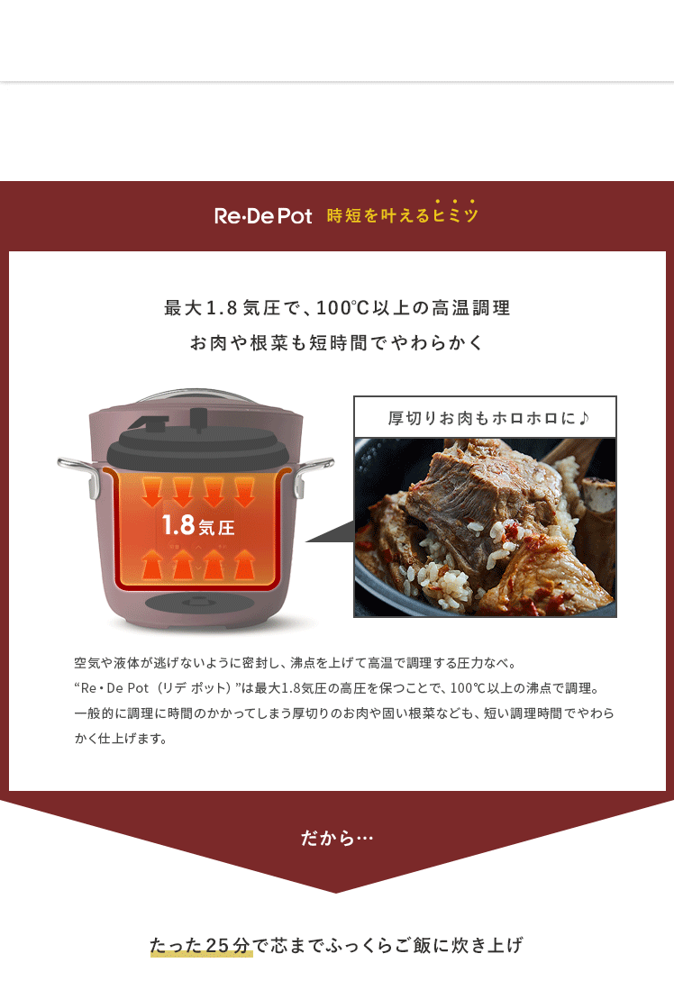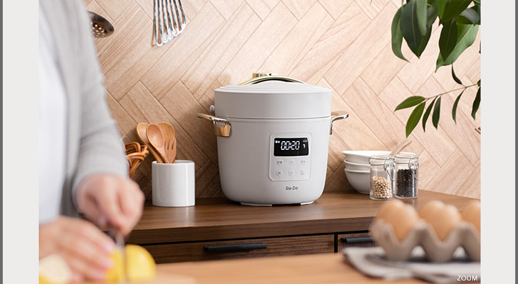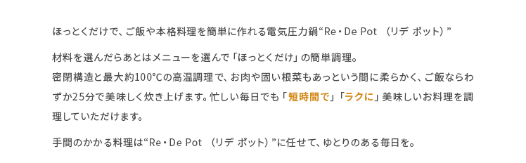 電気圧力鍋 Re・De Pot 〔リデ ポット〕/ほっとくだけで、ご飯や本格料理を簡単に作れる電気圧力鍋“Re・De Pot (リデ ポット)”材料を選んだらあとはメニューを選んで「ほっとくだけ」の簡単調理。密閉構造と最大約100℃の高温調理で、お肉や固い根菜もあっという間に柔らかく、ご飯ならわずか25分で美味しく炊き上げます。忙しい毎日でも「短時間で」「ラクに」美味しいお料理を調理していただけます。手間のかかる料理は“Re・De Pot (リデ ポット)”に任せて、ゆとりのある毎日を。