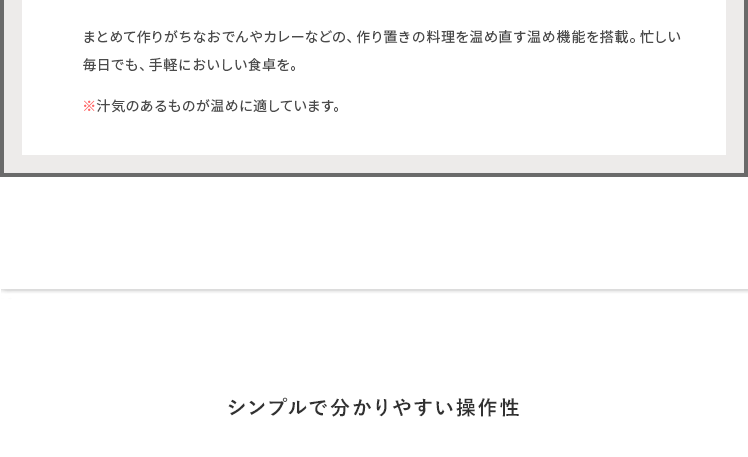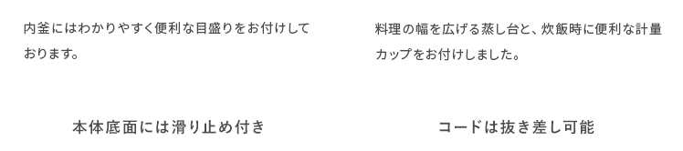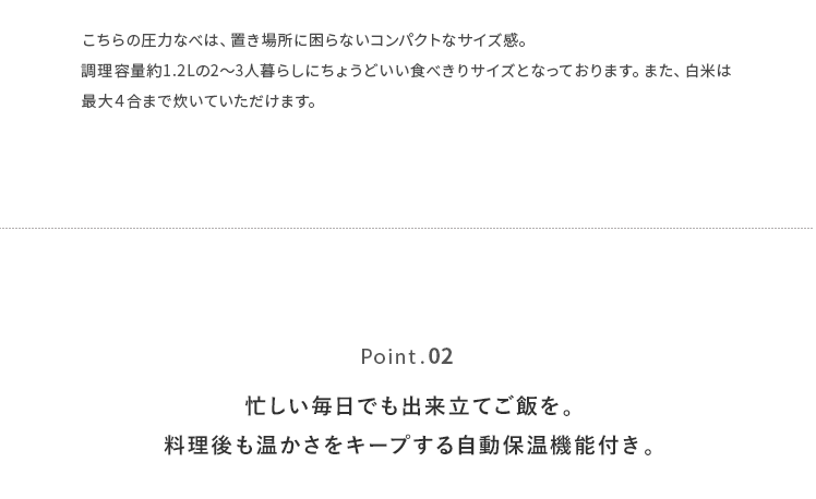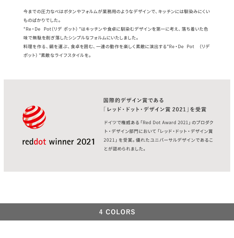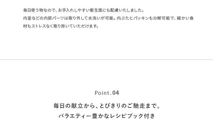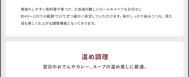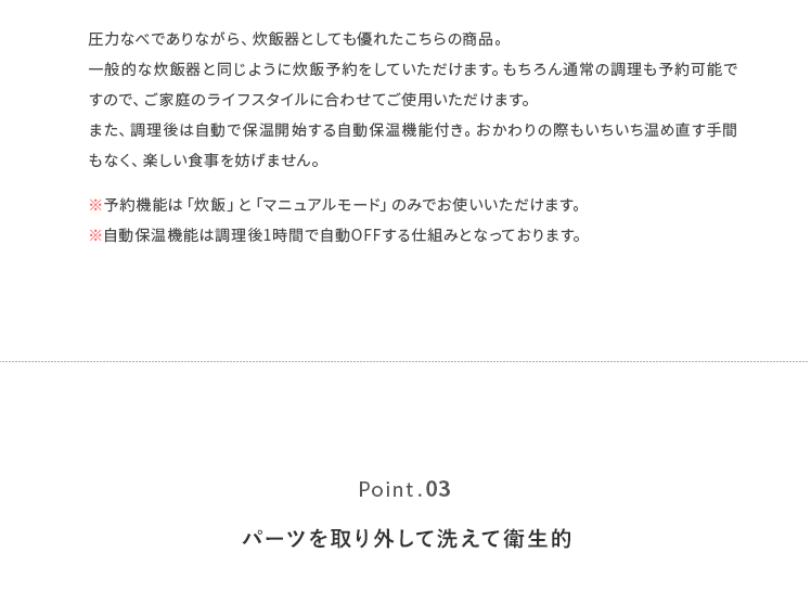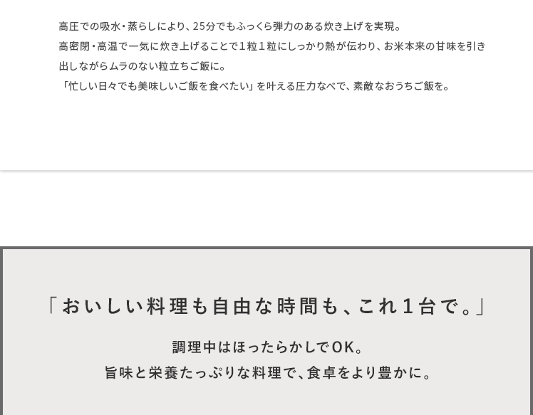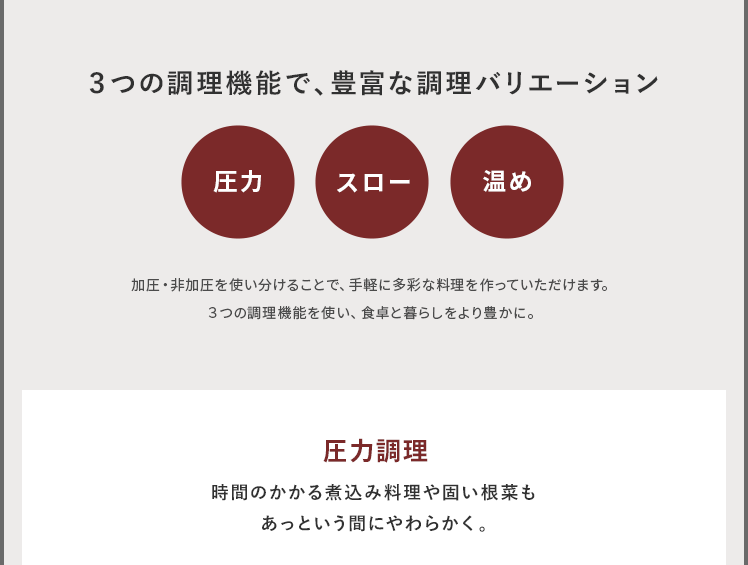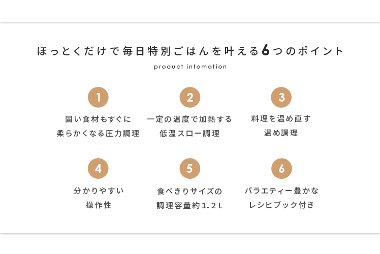 電気圧力鍋 Re・De Pot 〔リデ ポット〕/ほっとくだけで、ご飯や本格料理を簡単に作れる電気圧力鍋“Re・De Pot (リデ ポット)”材料を選んだらあとはメニューを選んで「ほっとくだけ」の簡単調理。密閉構造と最大約100℃の高温調理で、お肉や固い根菜もあっという間に柔らかく、ご飯ならわずか25分で美味しく炊き上げます。忙しい毎日でも「短時間で」「ラクに」美味しいお料理を調理していただけます。手間のかかる料理は“Re・De Pot (リデ ポット)”に任せて、ゆとりのある毎日を。