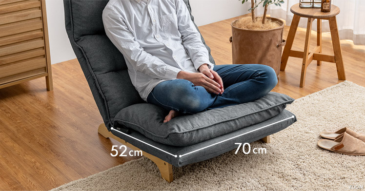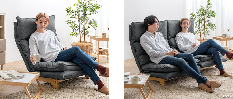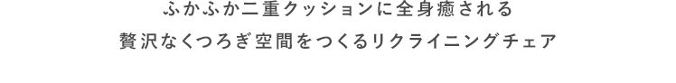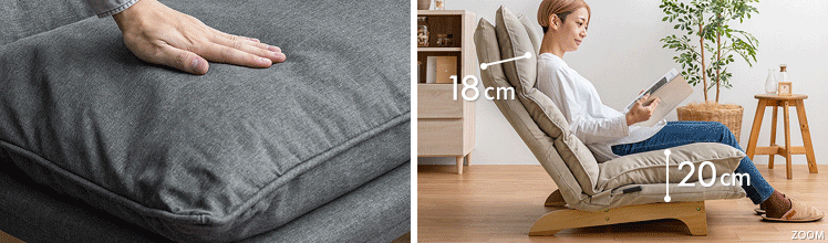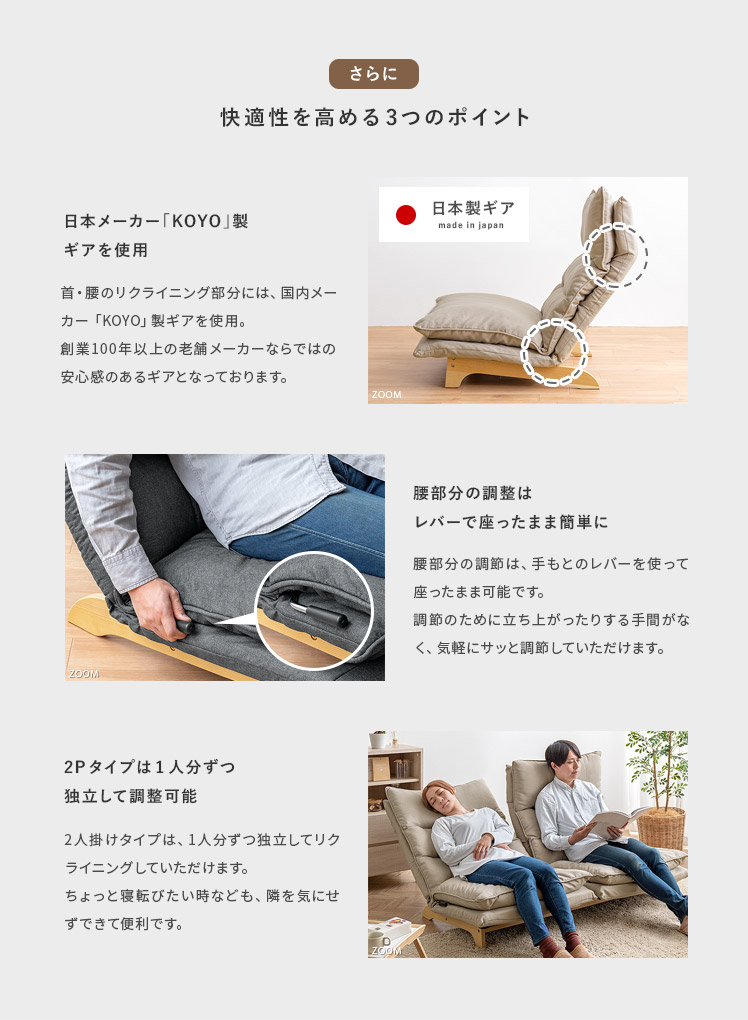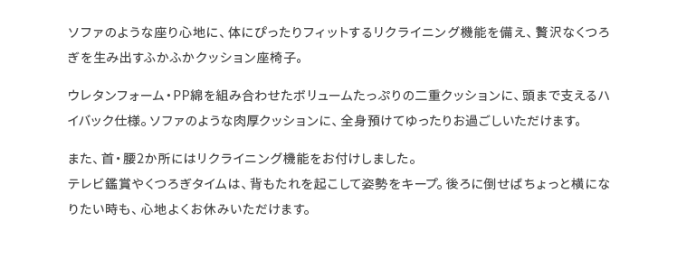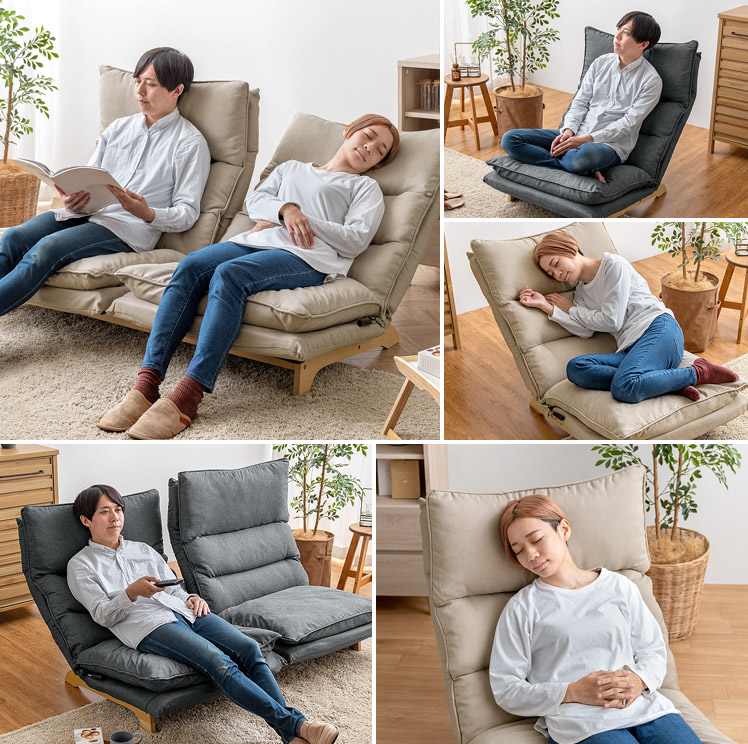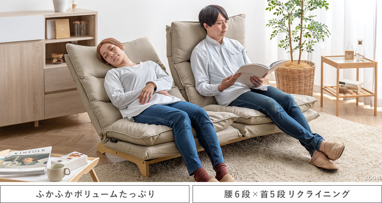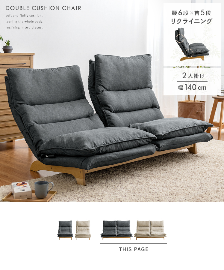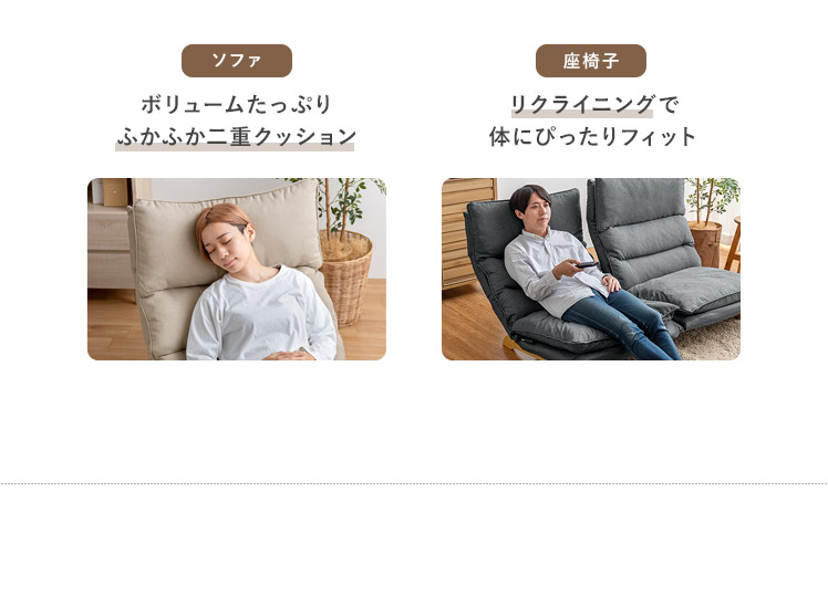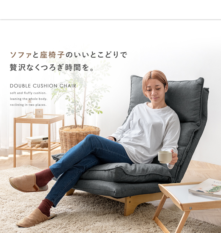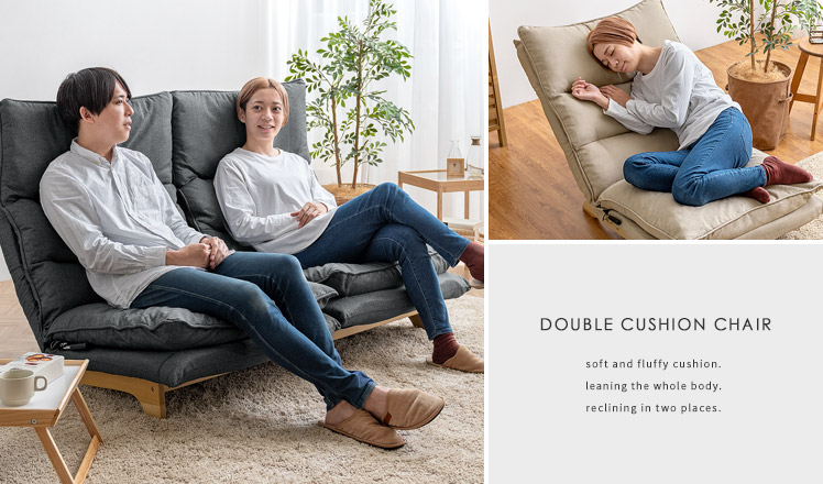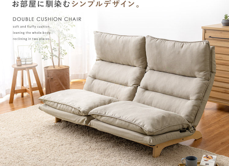 ダブルクッション座椅子 2人掛けタイプ/ソファのような座り心地に、体にぴったりフィットするリクライニング機能を備え、贅沢なくつろぎを生み出すふかふかクッション座椅子。ウレタンフォーム・PP綿を組み合わせたボリュームたっぷりの二重クッションに、頭まで支えるハイバック仕様。ソファのような肉厚クッションに、全身預けてゆったりお過ごしいただけます。また、首・腰2か所にはリクライニング機能をお付けしました。テレビ鑑賞やくつろぎタイムは、背もたれを起こして姿勢をキープ。後ろに倒せばちょっと横になりたい時も、心地よくお休みいただけます。