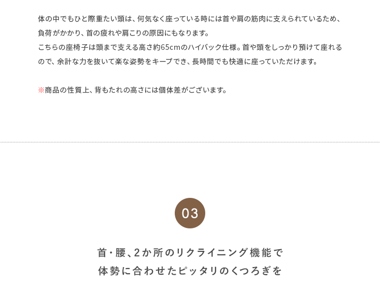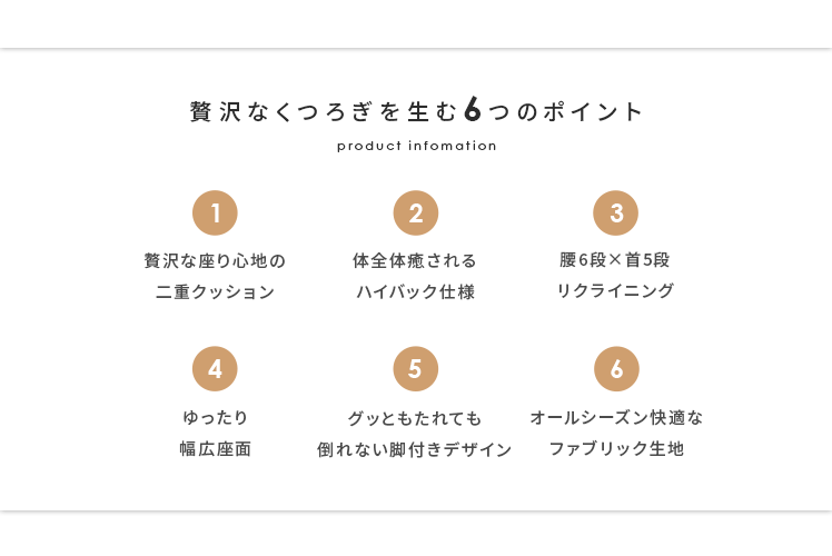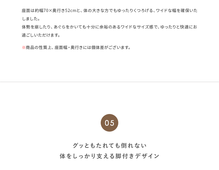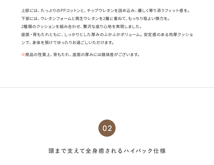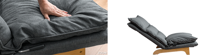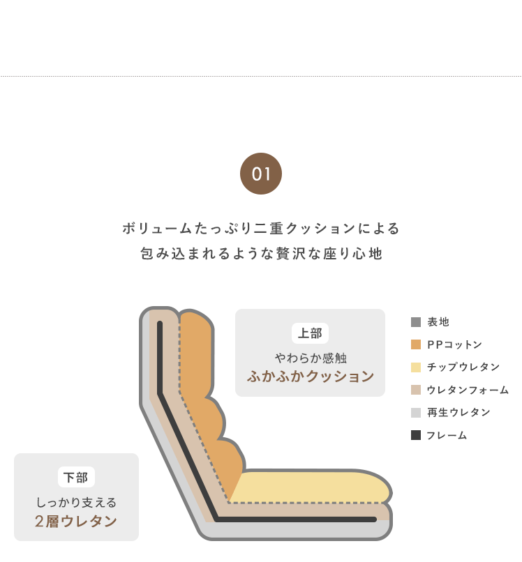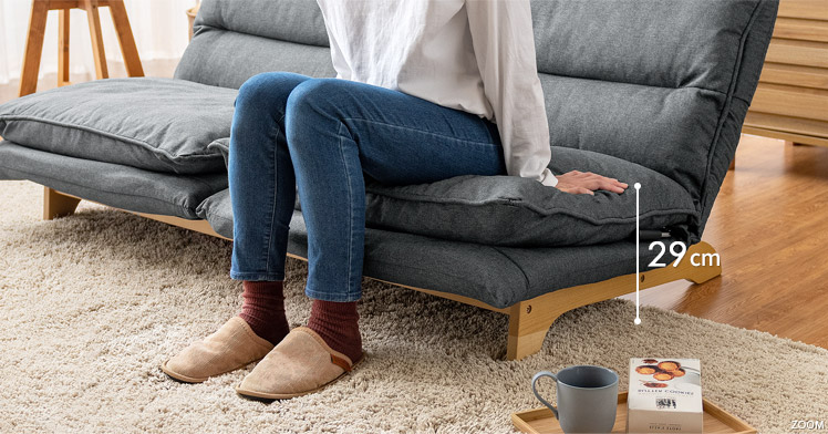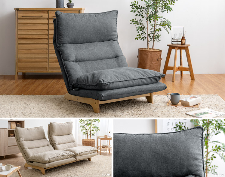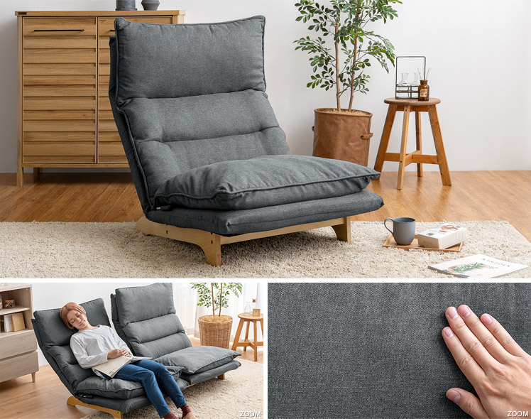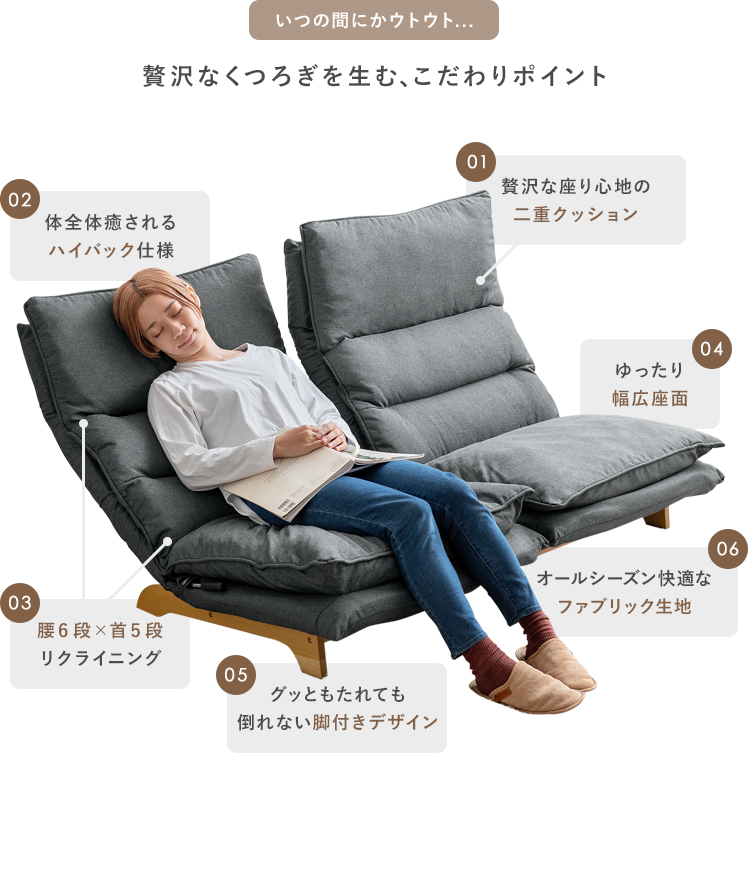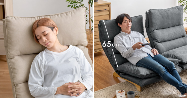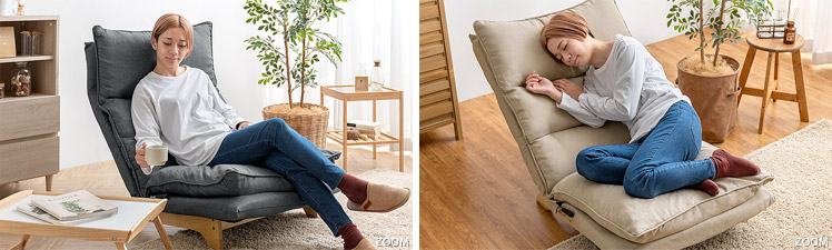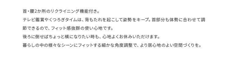ダブルクッション座椅子 2人掛けタイプ/ソファのような座り心地に、体にぴったりフィットするリクライニング機能を備え、贅沢なくつろぎを生み出すふかふかクッション座椅子。ウレタンフォーム・PP綿を組み合わせたボリュームたっぷりの二重クッションに、頭まで支えるハイバック仕様。ソファのような肉厚クッションに、全身預けてゆったりお過ごしいただけます。また、首・腰2か所にはリクライニング機能をお付けしました。テレビ鑑賞やくつろぎタイムは、背もたれを起こして姿勢をキープ。後ろに倒せばちょっと横になりたい時も、心地よくお休みいただけます。