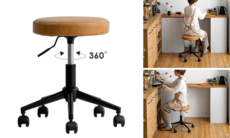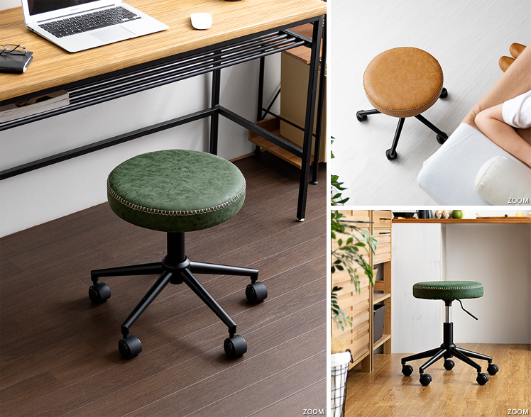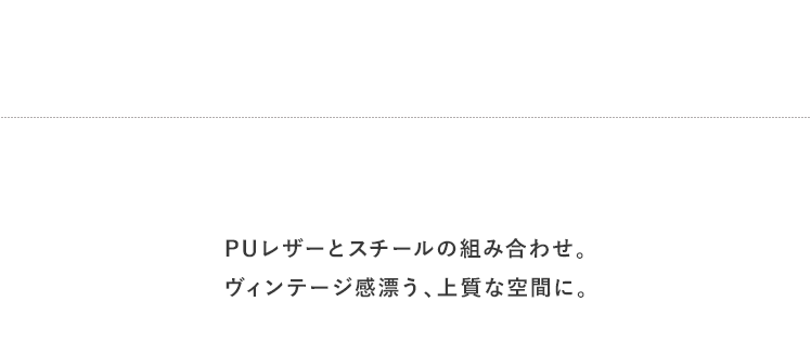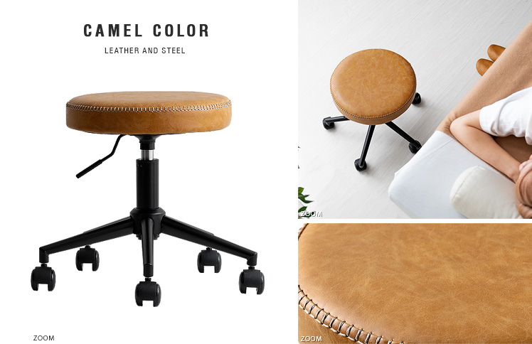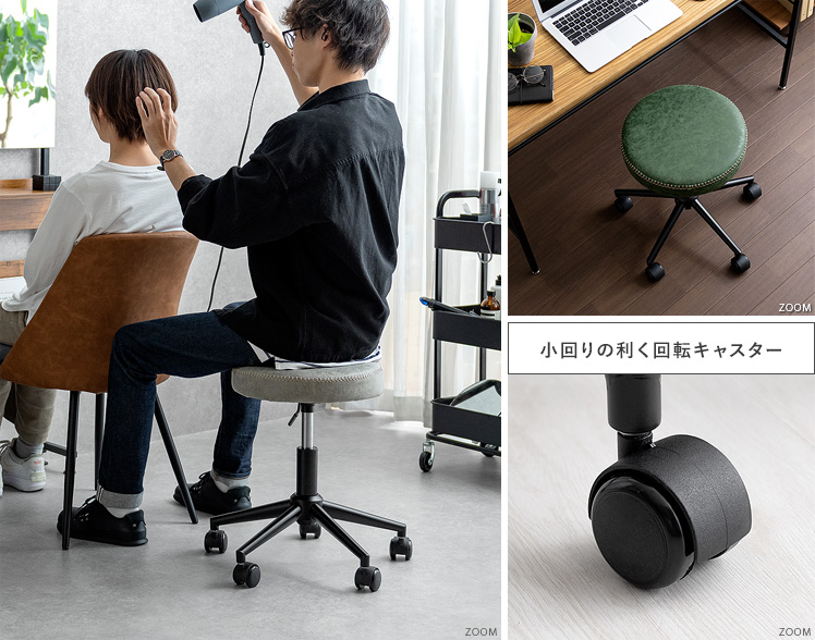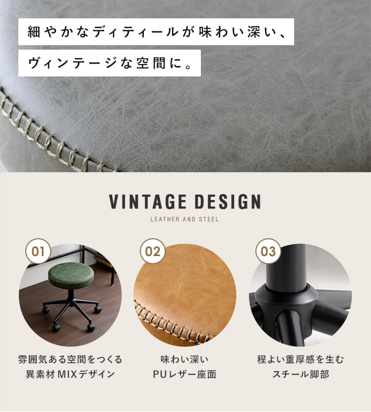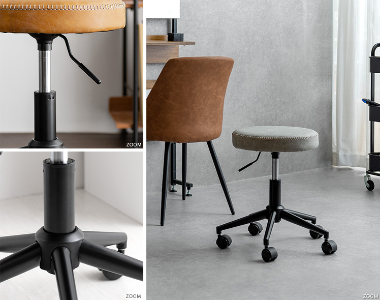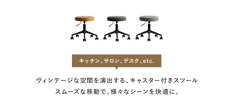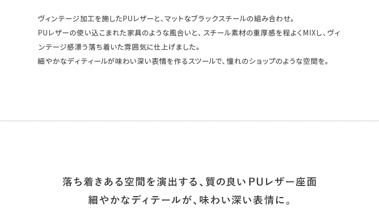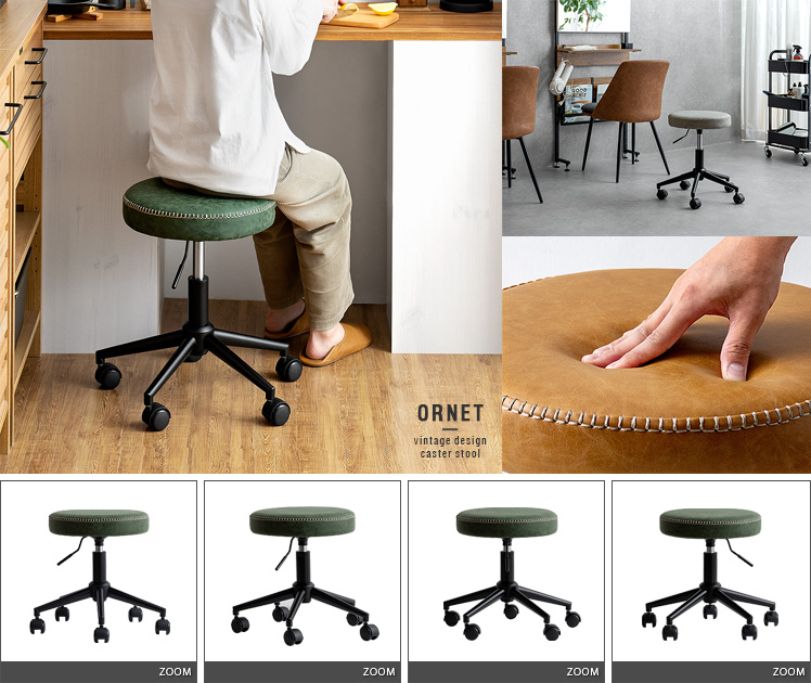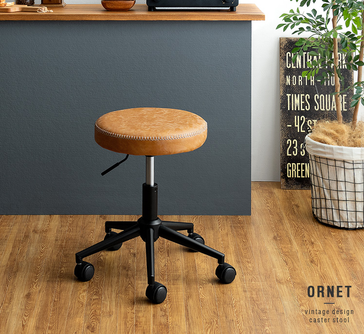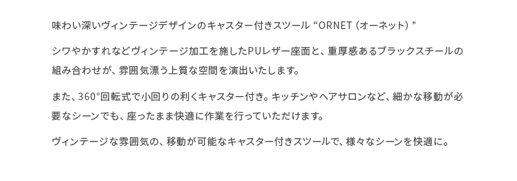 キャスター付きスツール ORNET〔オーネット〕/味わい深いヴィンテージデザインのキャスター付きスツール “ORNET(オーネット)”シワやかすれなどヴィンテージ加工を施したPUレザー座面と、重厚感あるブラックスチールの組み合わせが、雰囲気漂う上質な空間を演出いたします。また、360°回転式で小回りの利くキャスター付き。キッチンやヘアサロンなど、細かな移動が必要なシーンでも、座ったまま快適に作業を行っていただけます。ヴィンテージな雰囲気の、移動が可能なキャスター付きスツールで、様々なシーンを快適に。