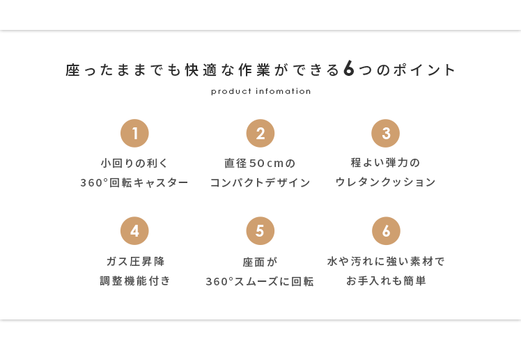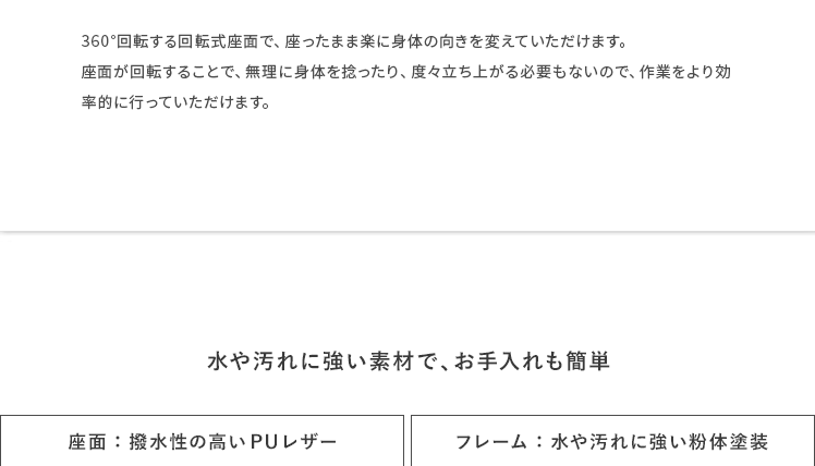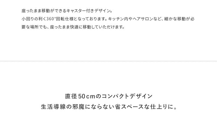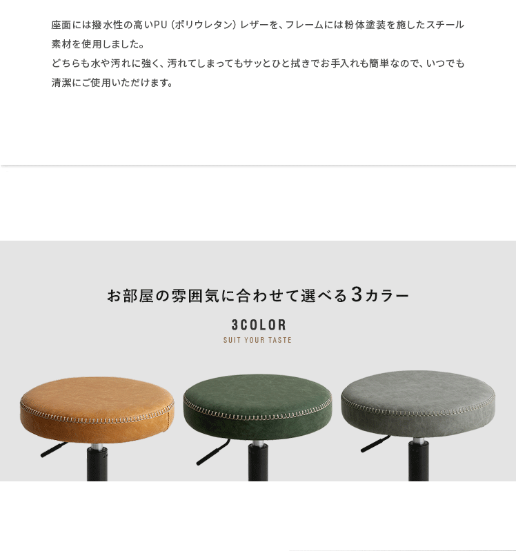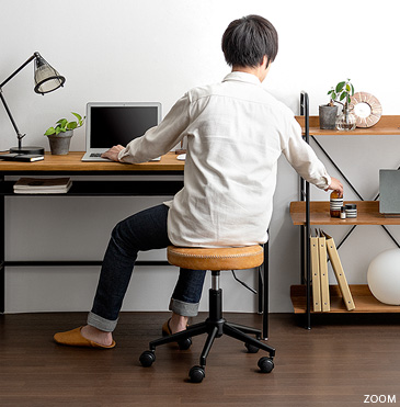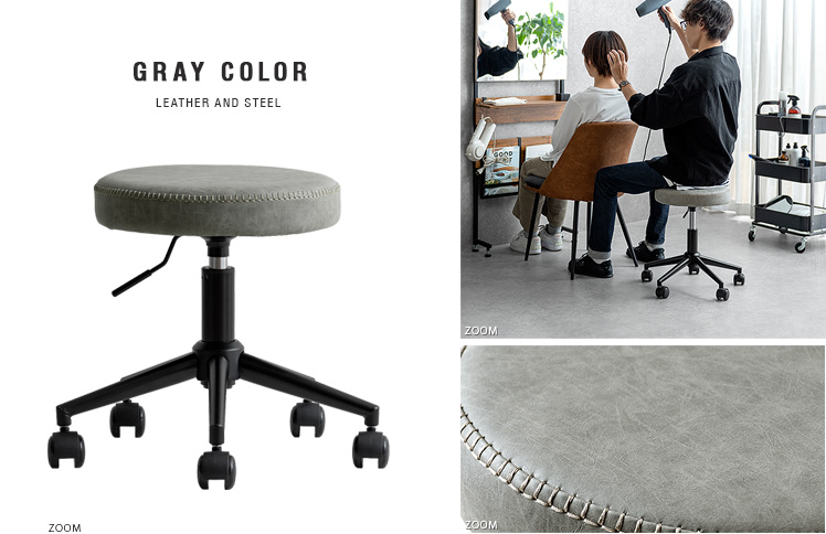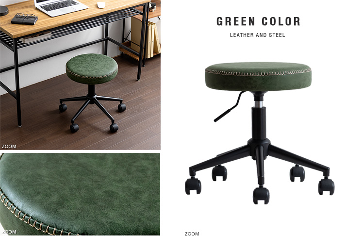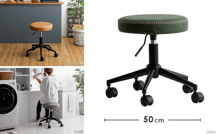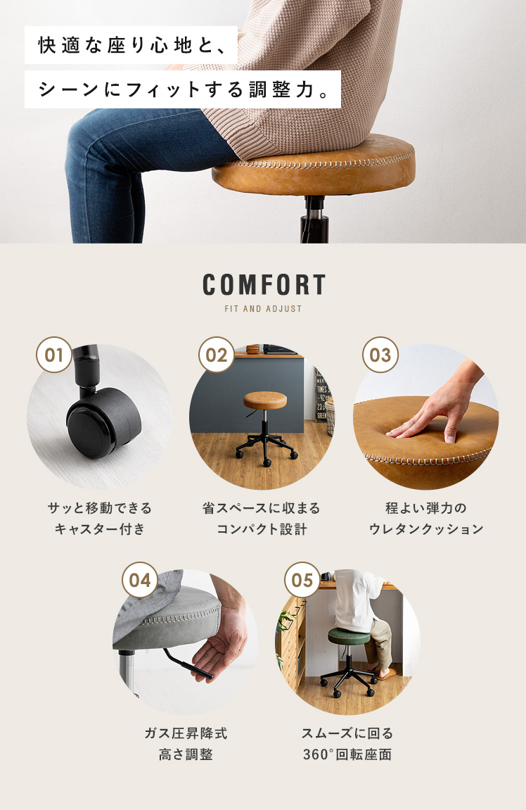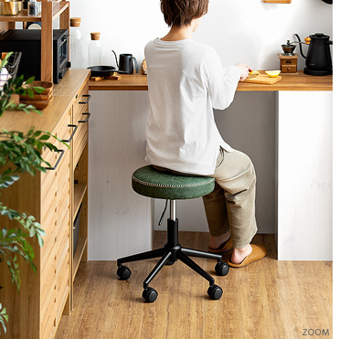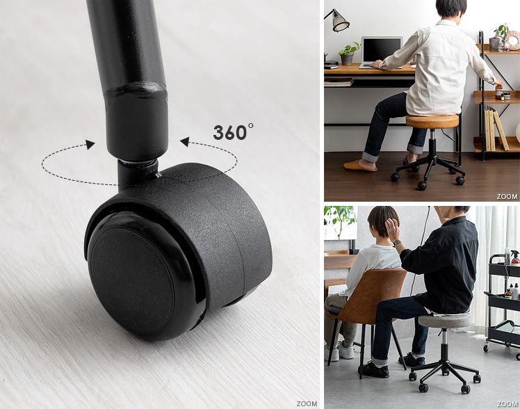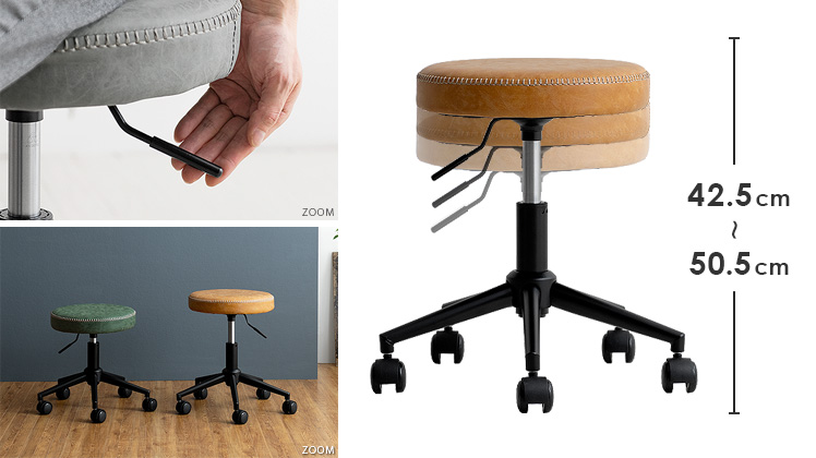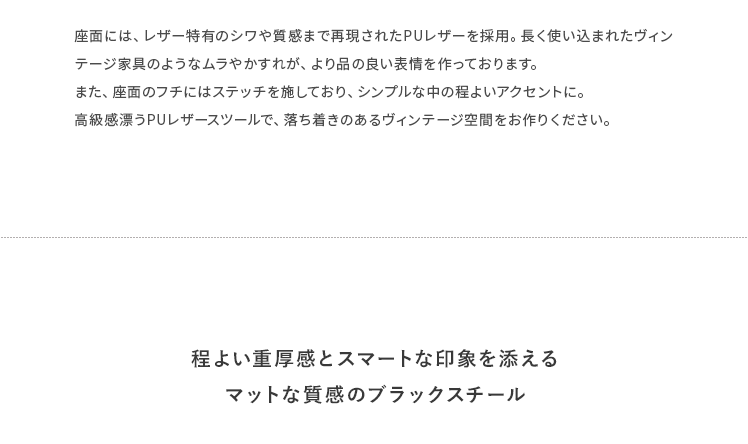キャスター付きスツール ORNET〔オーネット〕/味わい深いヴィンテージデザインのキャスター付きスツール “ORNET(オーネット)”シワやかすれなどヴィンテージ加工を施したPUレザー座面と、重厚感あるブラックスチールの組み合わせが、雰囲気漂う上質な空間を演出いたします。また、360°回転式で小回りの利くキャスター付き。キッチンやヘアサロンなど、細かな移動が必要なシーンでも、座ったまま快適に作業を行っていただけます。ヴィンテージな雰囲気の、移動が可能なキャスター付きスツールで、様々なシーンを快適に。