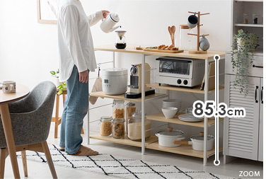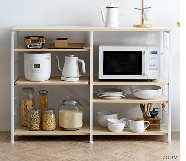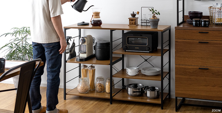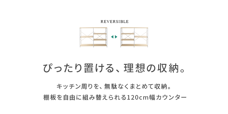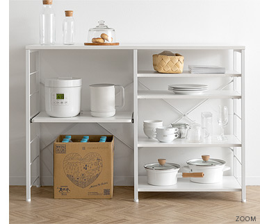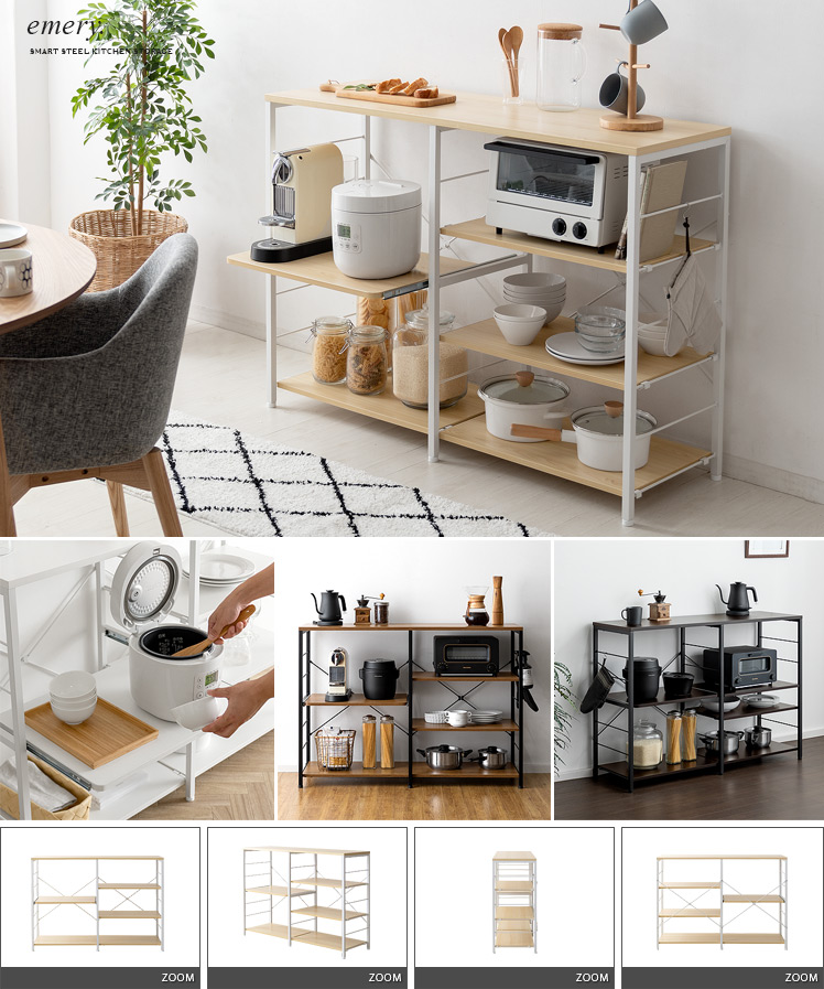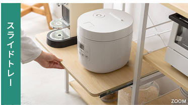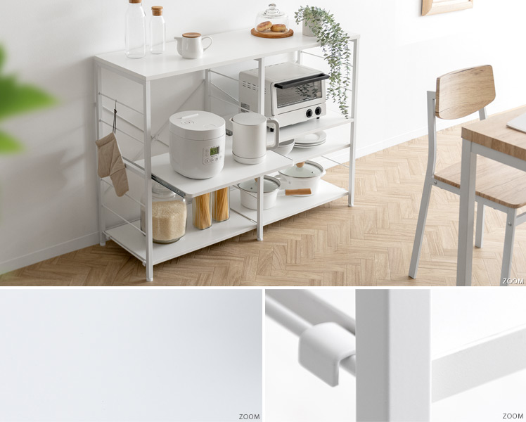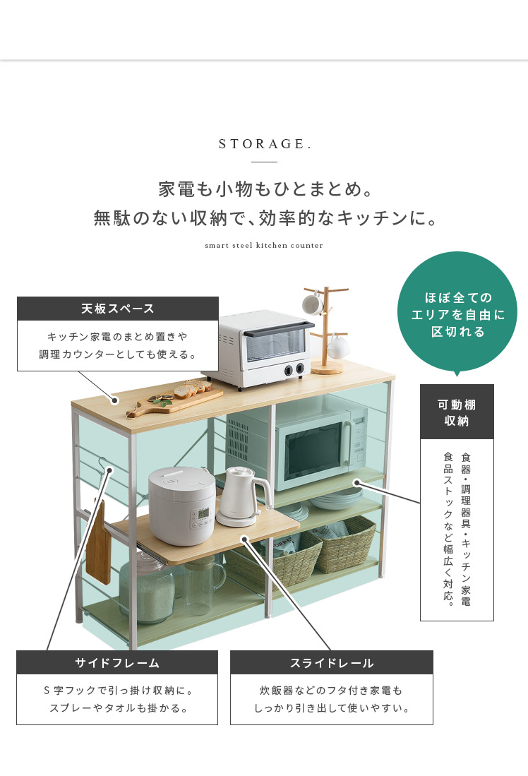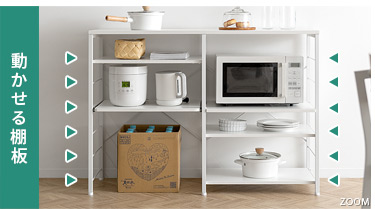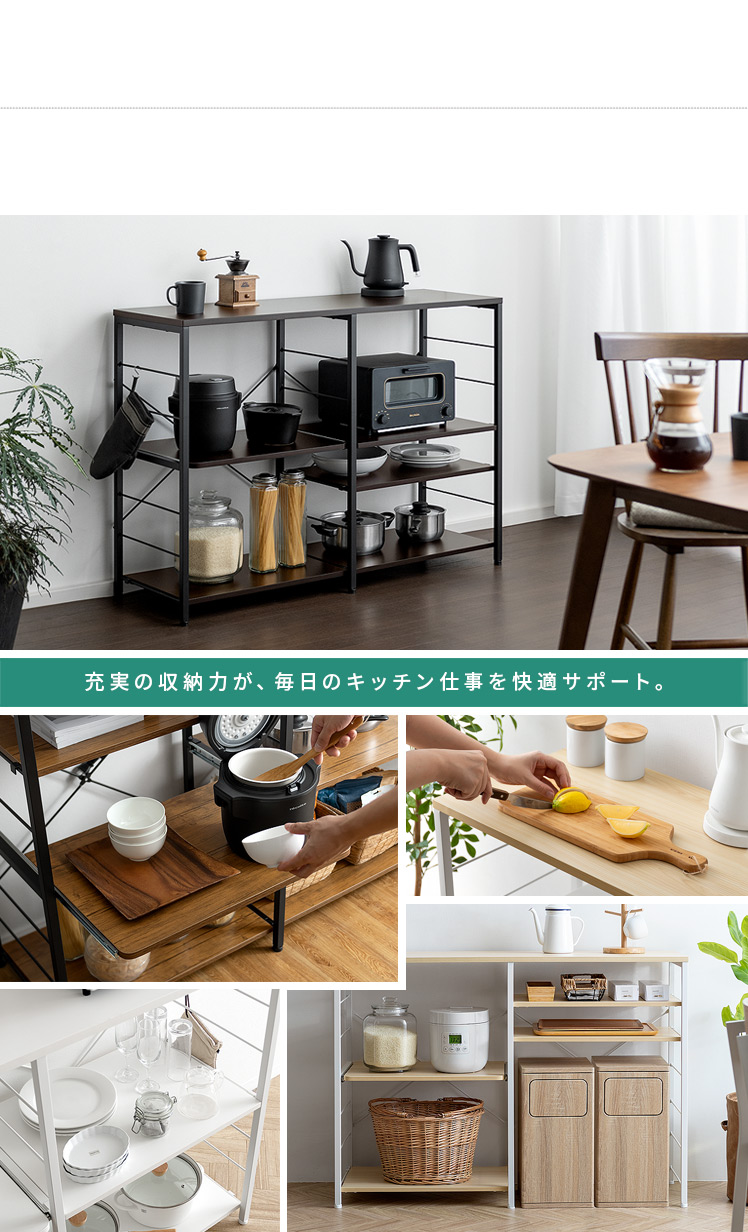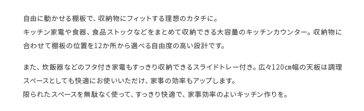 スライド棚付きキッチンカウンター emery〔エメリー〕 背板なしタイプ/自由に動かせる棚板で、収納物にフィットする理想のカタチに。キッチン家電や食器、食品ストックなどをまとめて収納できる大容量のキッチンカウンター。収納物に合わせて棚板の位置を12か所から選べる自由度の高い設計です。また、スライドトレーで炊飯器などのフタ付き家電もすっきり収納。広々120cm幅の天板は調理スペースとしても快適にお使いいただけ、家事の効率もアップします。限られたスペースを無駄なく使って、すっきり快適で、家事効率のよいキッチン作りを。
