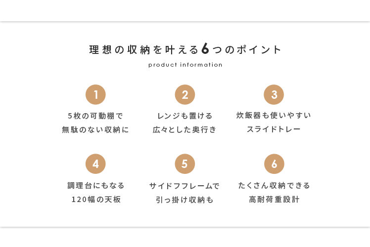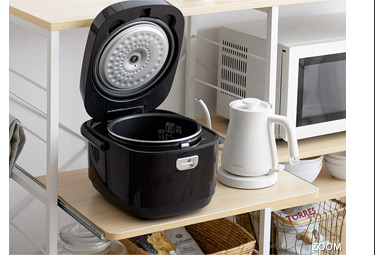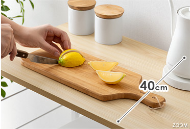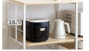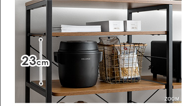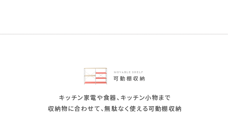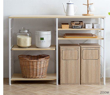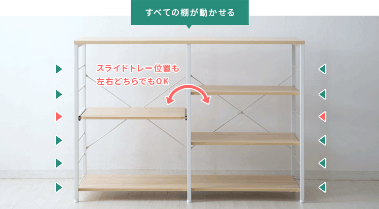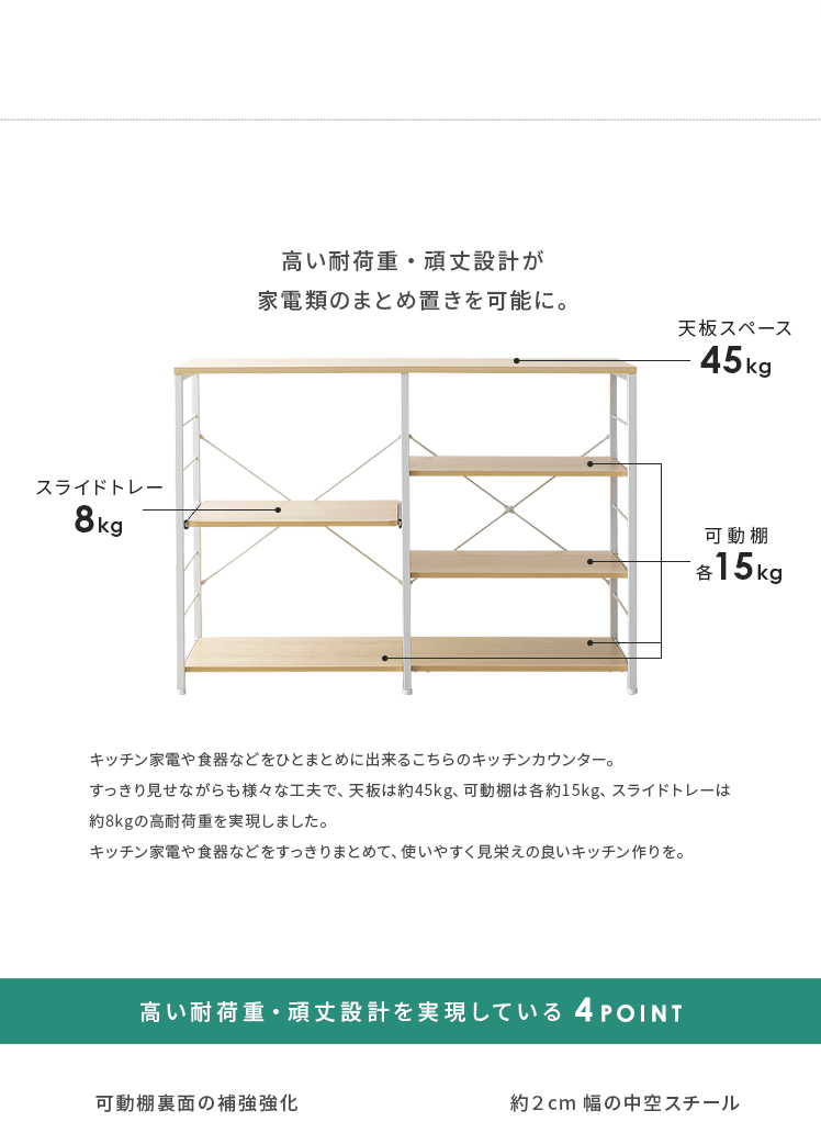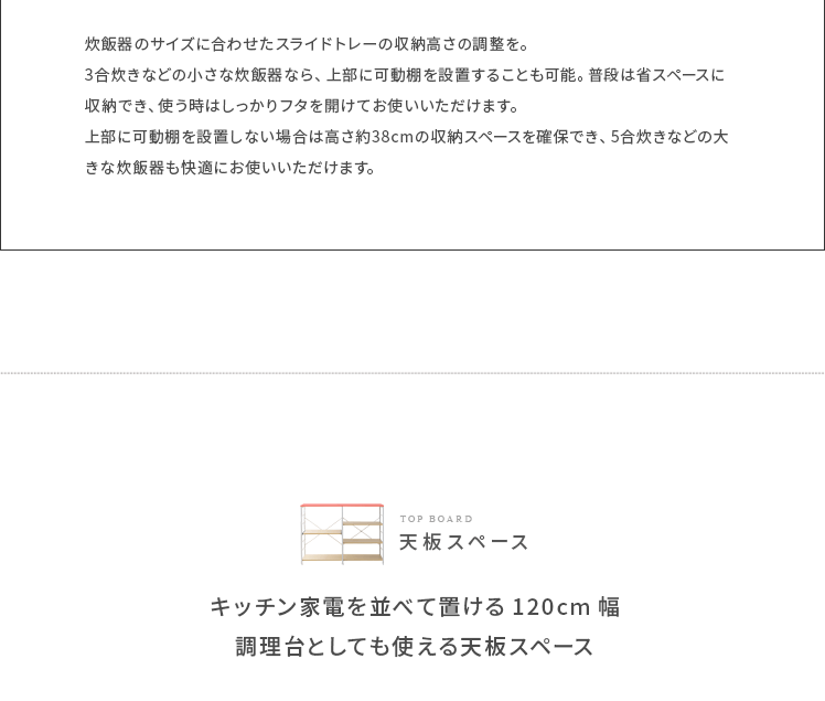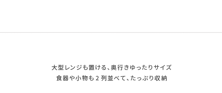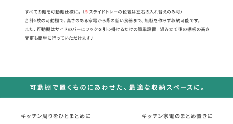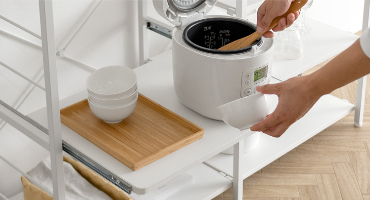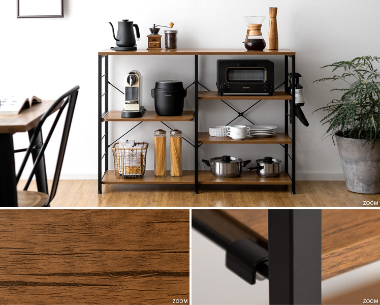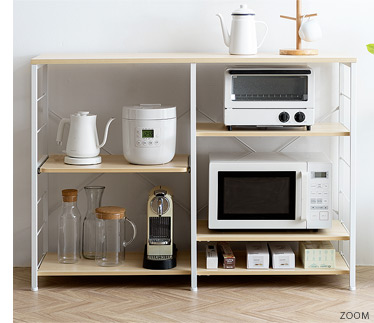 スライド棚付きキッチンカウンター emery〔エメリー〕 背板なしタイプ/自由に動かせる棚板で、収納物にフィットする理想のカタチに。キッチン家電や食器、食品ストックなどをまとめて収納できる大容量のキッチンカウンター。収納物に合わせて棚板の位置を12か所から選べる自由度の高い設計です。また、スライドトレーで炊飯器などのフタ付き家電もすっきり収納。広々120cm幅の天板は調理スペースとしても快適にお使いいただけ、家事の効率もアップします。限られたスペースを無駄なく使って、すっきり快適で、家事効率のよいキッチン作りを。