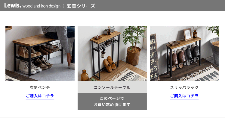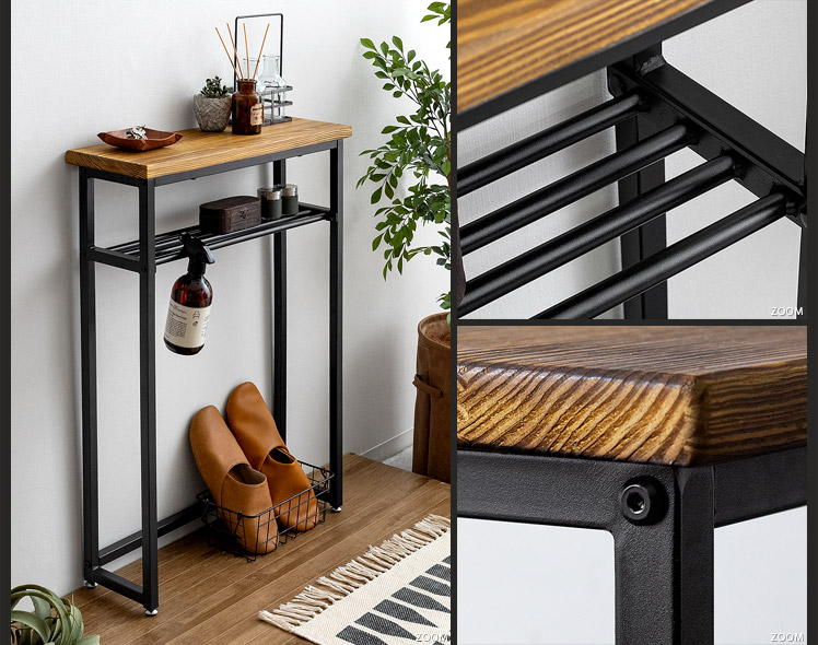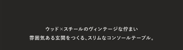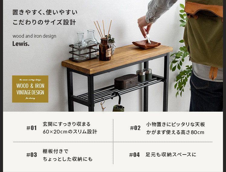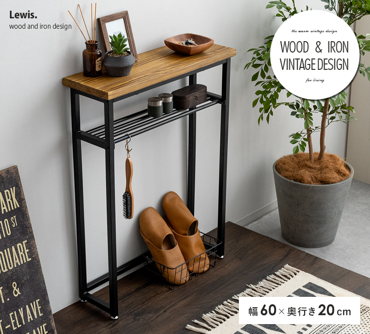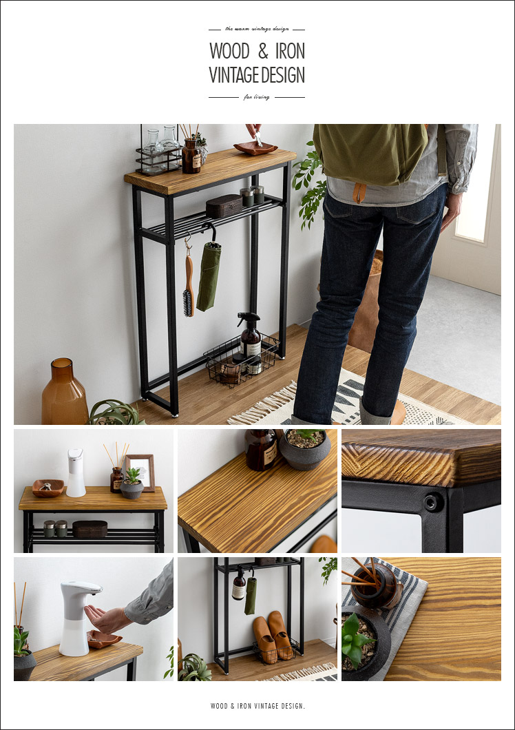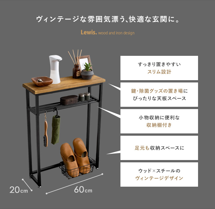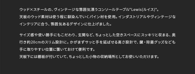 ヴィンテージデザイン コンソールテーブル Lewis〔ルイス〕/ウッド×スチールの、ヴィンテージな雰囲気漂うコンソールテーブル"Lewis(ルイス)"。天板のウッド素材は使う程に馴染んでいくパイン材を使用。インダストリアルやヴィンテージなインテリアに合う、雰囲気あるデザインに仕上げました。サイズ感や使い勝手にもこだわり、玄関など、ちょっとした空きスペースにスッキリと収まる、奥行き約20cmのスリム設計に。かがまずサッと手を延ばせる高さ設計で、鍵・除菌グッズなども手に取りやすい位置に置いておけて便利です。天板下には棚板が付いていて、ちょっとした小物の収納場所としてお使いいただけます。