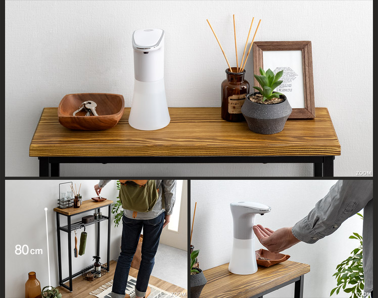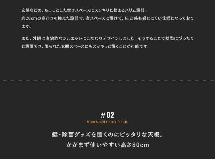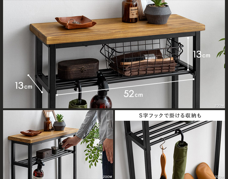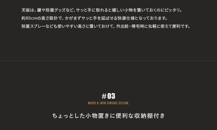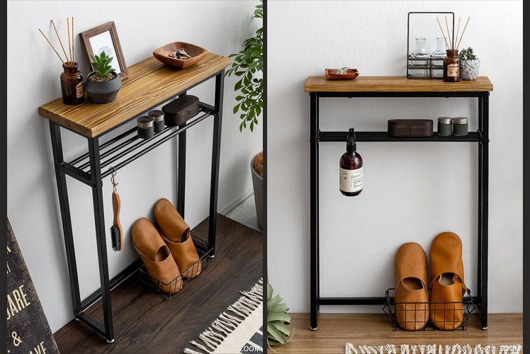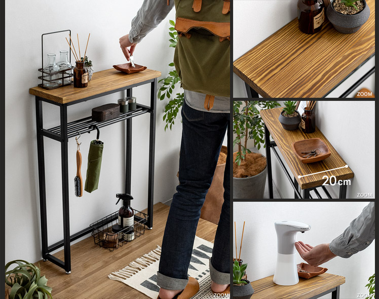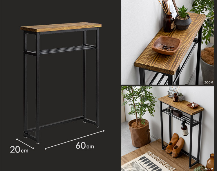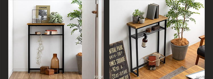 ヴィンテージデザイン コンソールテーブル Lewis〔ルイス〕/ウッド×スチールの、ヴィンテージな雰囲気漂うコンソールテーブル"Lewis(ルイス)"。天板のウッド素材は使う程に馴染んでいくパイン材を使用。インダストリアルやヴィンテージなインテリアに合う、雰囲気あるデザインに仕上げました。サイズ感や使い勝手にもこだわり、玄関など、ちょっとした空きスペースにスッキリと収まる、奥行き約20cmのスリム設計に。かがまずサッと手を延ばせる高さ設計で、鍵・除菌グッズなども手に取りやすい位置に置いておけて便利です。天板下には棚板が付いていて、ちょっとした小物の収納場所としてお使いいただけます。