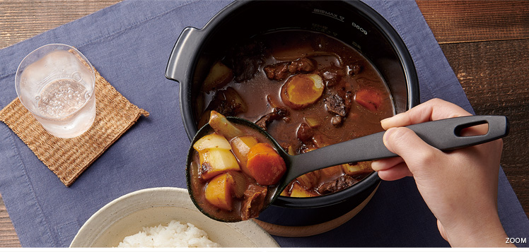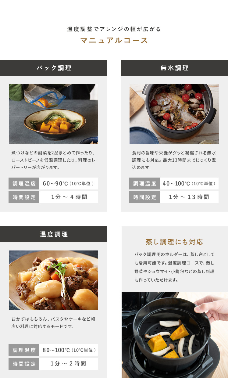 食材の旨味や栄養がグッと凝縮される無水調理にも対応。最大13時間までじっくり煮込めます。