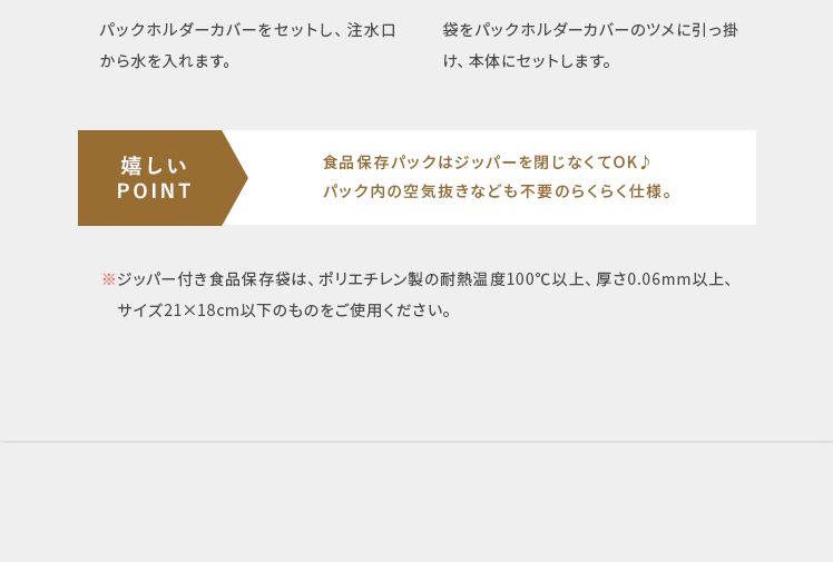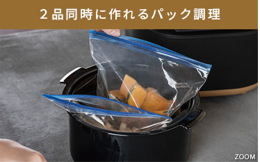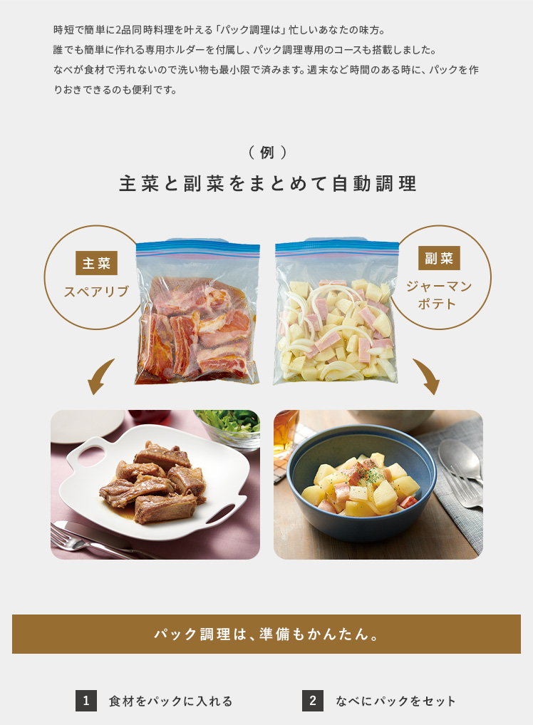 時短で簡単に2品同時料理を叶える「パック調理は」忙しいあなたの味方。誰でも簡単に作れる専用ホルダーを付属し、パック調理専用のコースも搭載しました。