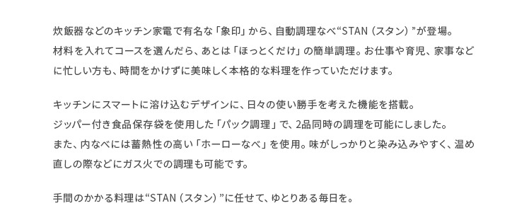 あなたの暮らしにスタンバイ/スタンダードをつくり続ける/それが象印のスタンスです。