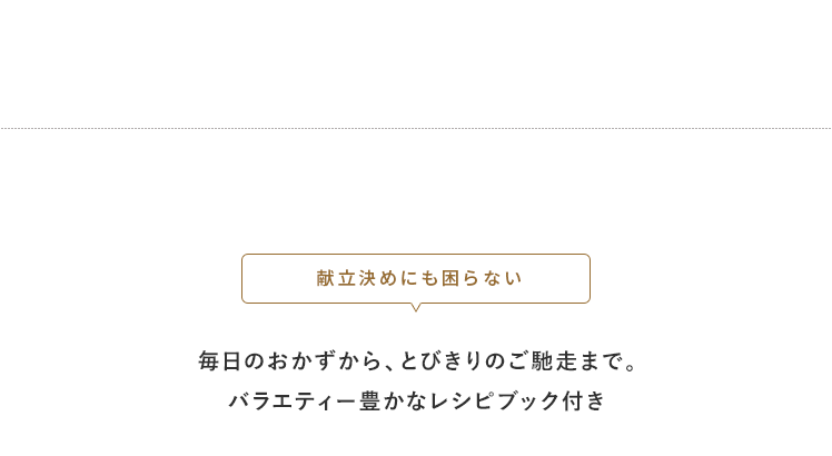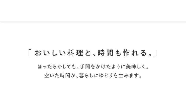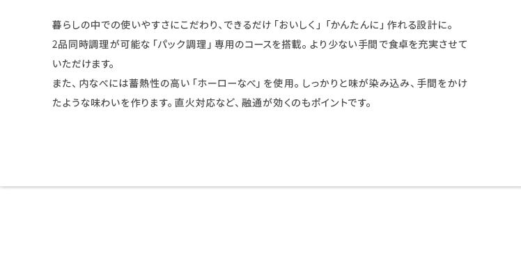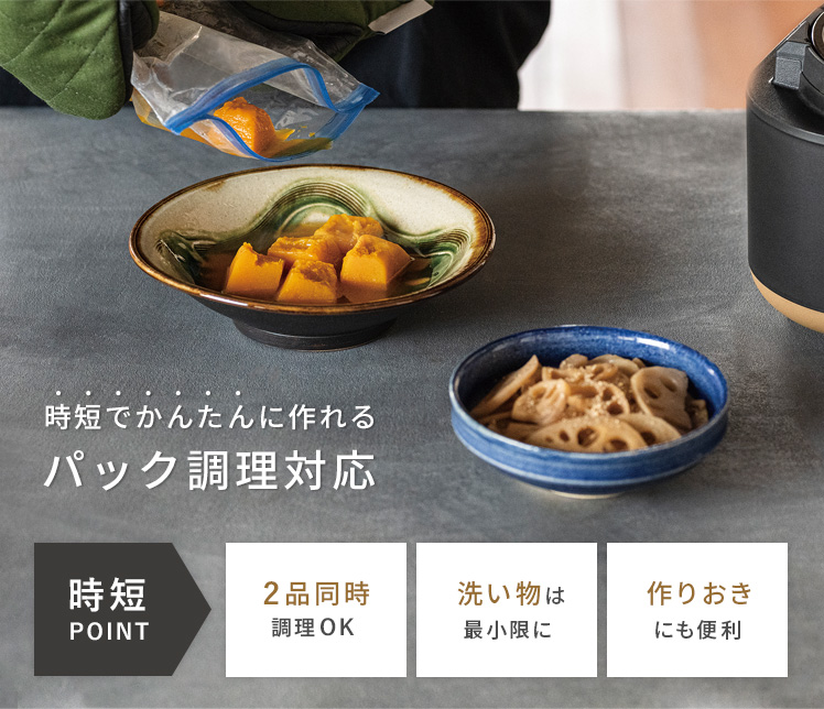 2品同時調理が可能な「パック調理」専用のコースを搭載。より少ない手間で食卓を充実させていただけます。