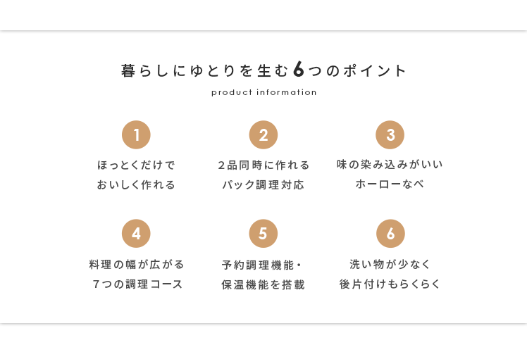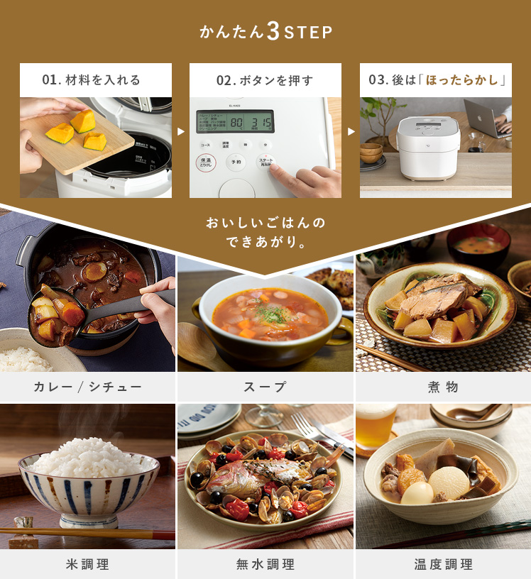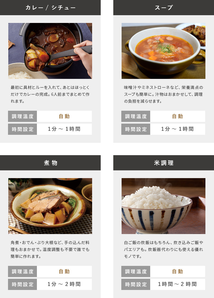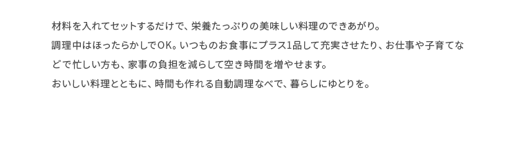 材料を入れてセットするだけで、栄養たっぷりの美味しい料理のできあがり。献立にプラス1品したり、お仕事や子育てなどで忙しい方も、家事の負担を減らせます。