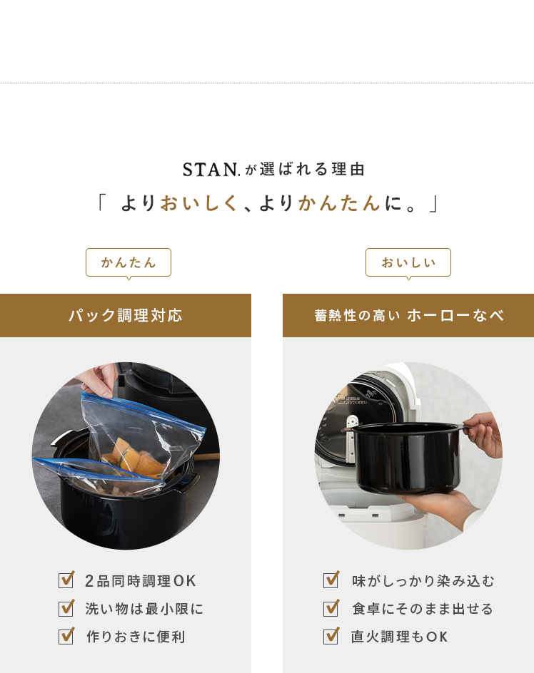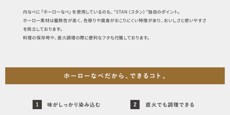 内なべにホーロー製なことも“STAN”独自のポイント。ホーロー素材は蓄熱性が高く、色移りや腐食がおこりにくいため、おいしさと使いやすさを両立します。