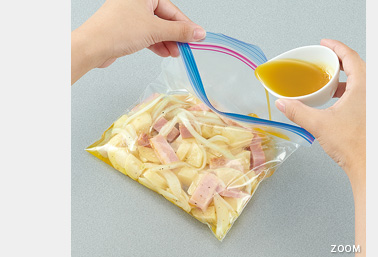 市販のジッパー付きの食品保存パックに食材と調味料を入れます。