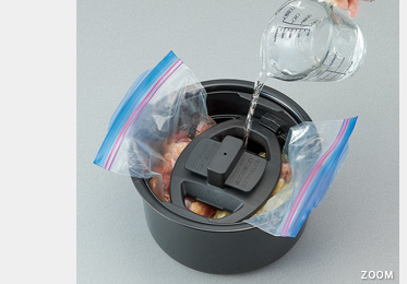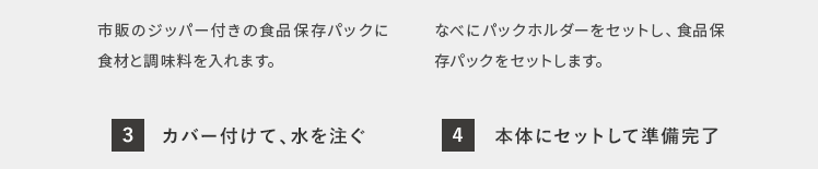 【パック調理の準備手順】3-カバーを付けて、水を注ぐ