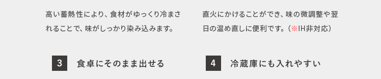 直火にかけることができ、味の微調整や翌日の温め直しに便利です。(※IH非対応)