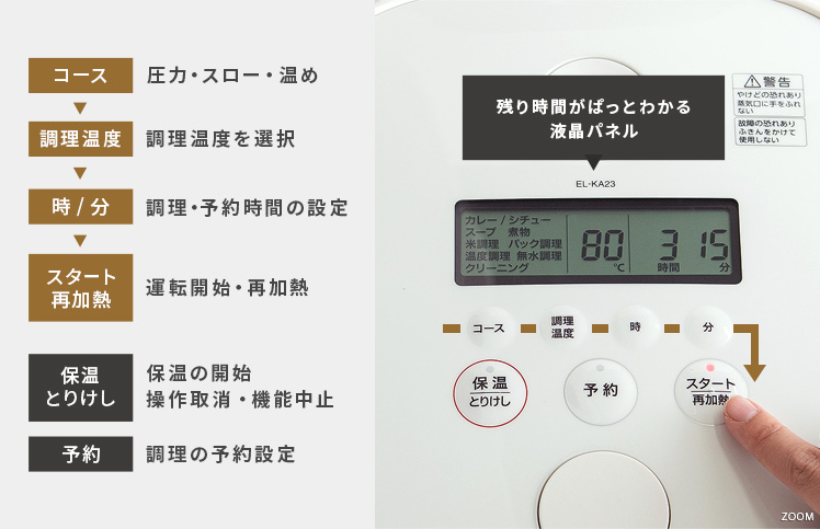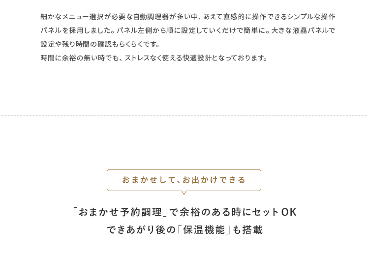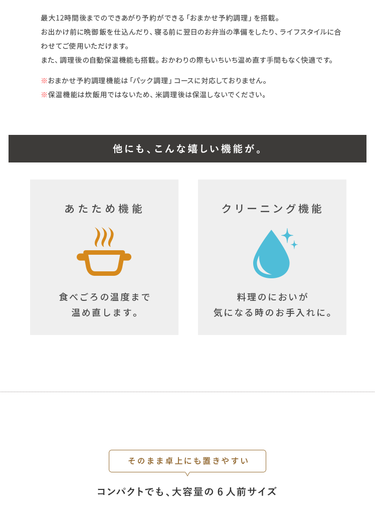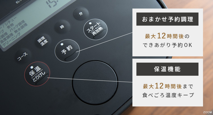 「おまかせ予約調理」で最大12時間後までのできあがり予約が可能。「保温機能」「あたため機能」「クリーニング機能」も搭載。