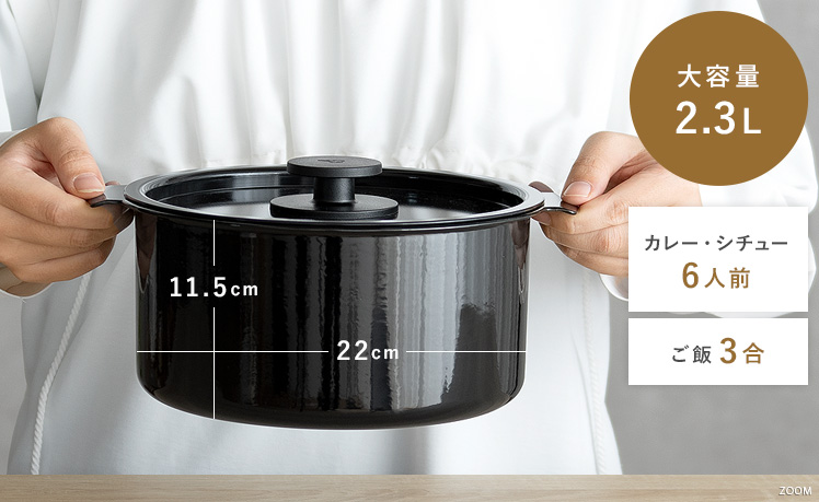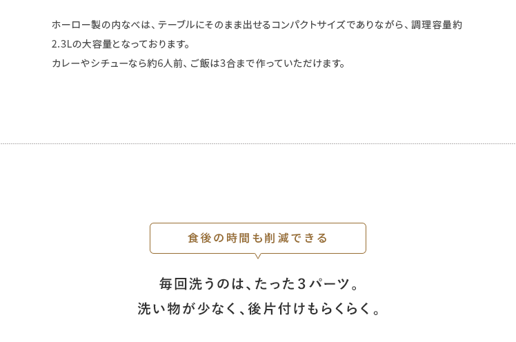 ホーロー製の内なべは、テーブルにそのまま出せるコンパクトサイズでありながら、調理容量約2.3Lの大容量となっております。