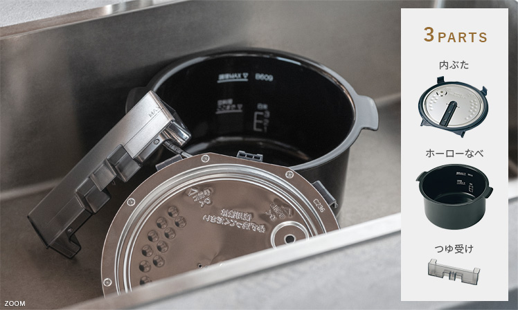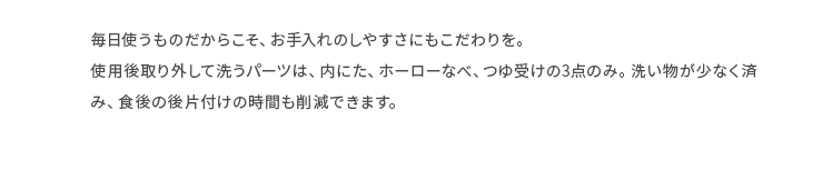使用後取り外して洗うパーツは、内にた、ホーローなべ、つゆ受けの3点のみ。洗い物が少なく済み、食後の後片付けの時間も削減できます。
