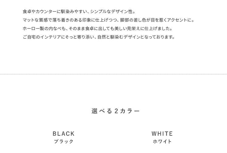 食卓やカウンターに馴染みやすい、シンプルなデザイン性。マットな質感で落ち着きのある印象に仕上げつつ、脚部の差し色が目を惹くアクセントに。